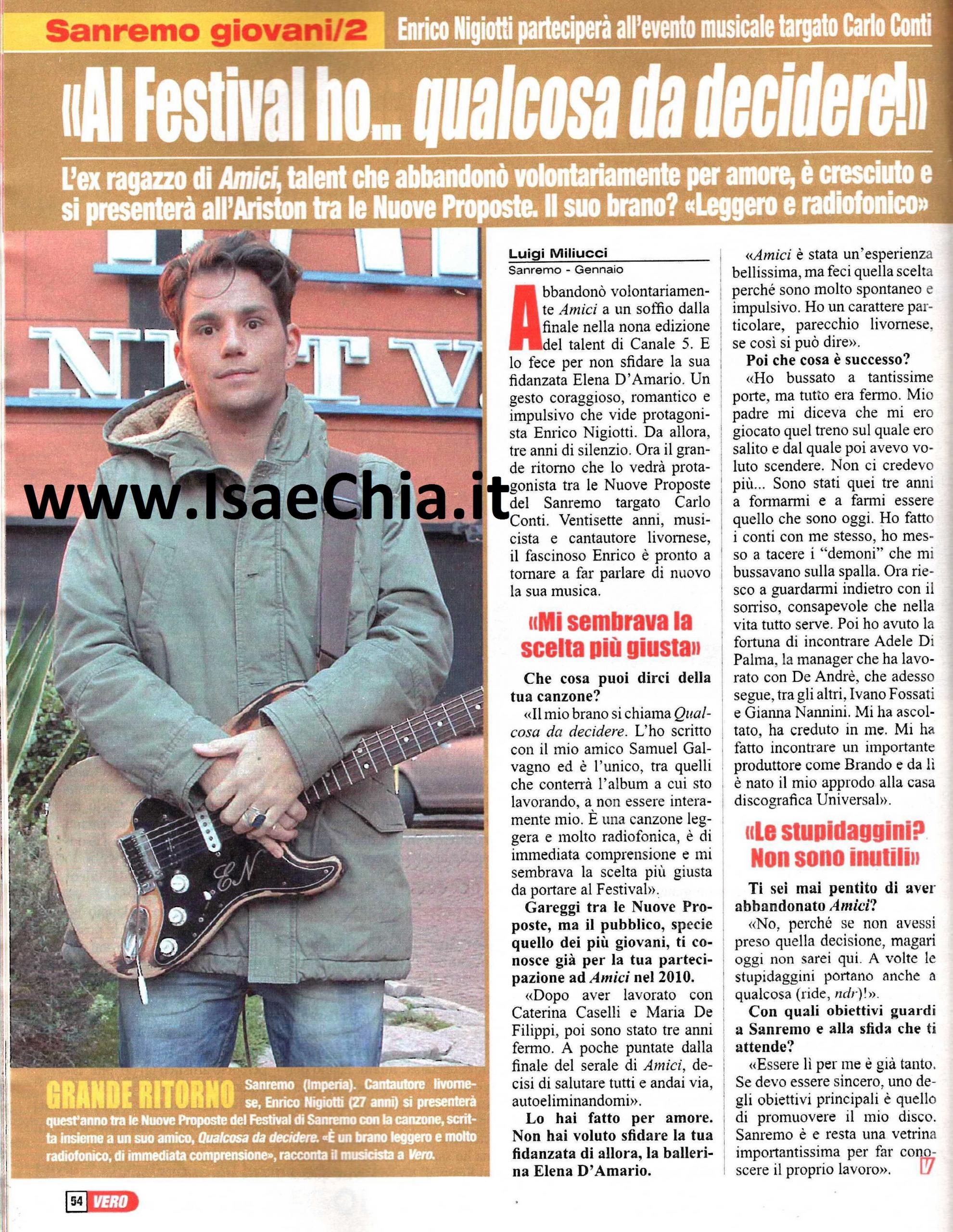 Sono passati oltre tre anni da quando Enrico Nigiotti si candidò all’eliminazione da Amici per salvare la ballerina Elena D’Amario, con cui era nata una storia all’interno della scuola, arrivando così ad un passo dalla finale. Da allora, del bel cantautore livornese si è sentito parlare molto poco. Adesso, Enrico è pronto a tornare sulle scene e lo fa nel migliore dei modi: è uno delle Nuove Proposte del prossimo Festival di Sanremo. Insieme a lui sul palco dell’Ariston, ci sarà anche un’altra ex concorrente di Amici, Erika Mineo, che si presenta col nome di Amara, e un ex concorrente di X Factor: Giovanni Caccamo. Questi, infatti, sono i talenti nati in tv che sono stati selezionati, mentre altri, come I Carboidrati, Simonetta Spiri e Diana Del Bufalo di Amici o Tommaso Pini di The Voice of Italy, non ce l’hanno fatta. Intervistato, Enrico ha raccontato: “Il mio brano si chiama Qualcosa da decidere e l’ho scritto col mio amico Samuel Galvagno ed è l’unico, tra quelli dell’album a cui sto lavorando, che non ho scritto interamente da solo. E’ una canzone leggera e radiofonica e mi sembrava quella giusta da portare al Festival di Sanremo. Dopo aver lavorato con Caterina Caselli e Maria De Filippi, poi sono stato tre anni fermo. A poche puntate dalla finale di Amici, decisi di salutare tutti e andai via autoeliminandomi. E’ stata un’avventura bellissima, ma feci quella scelta perché sono spontaneo e impulsivo. Ho un carattere particolare, molto livornese, diciamo. Poi ho bussato a tantissime porte, ma tutto fermo. Mio padre mi diceva che mi ero giocato quel treno su cui ero salito e da cui avevo voluto scendere. Non ci credevo più. Poi ho avuto la fortuna di incontrare Adele De Palma, la manager che ora segue Ivano Fossati e Gianna Nannini. Mi ha ascoltato, ha creduto in me, mi ha fatto incontrare un produttore importante come Brando e da lì è nato il mio approdo alla casa discografica Universal. Non mi sono mai pentito di aver lasciato Amici: se non avessi preso quella decisione, magari adesso non sarei qui. Essere a Sanremo è già tanto: il mio obiettivo principale è promuovere il mio disco e Sanremo è una vetrina importantissima“.