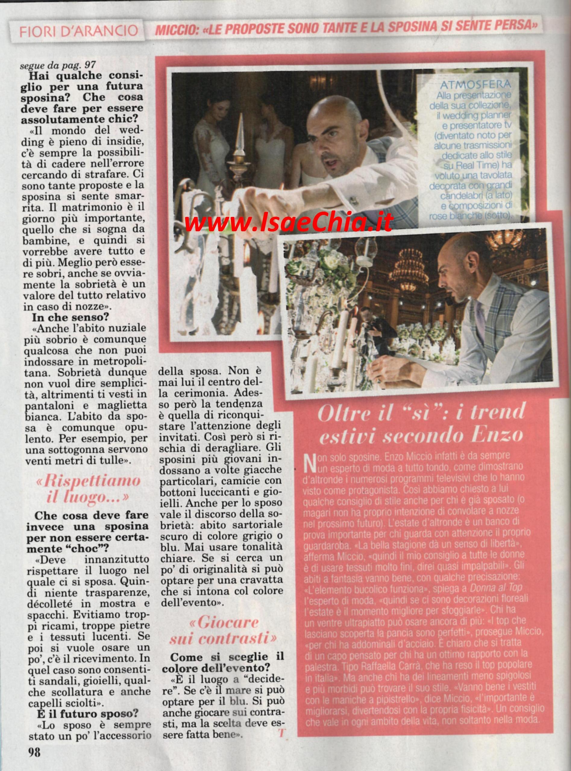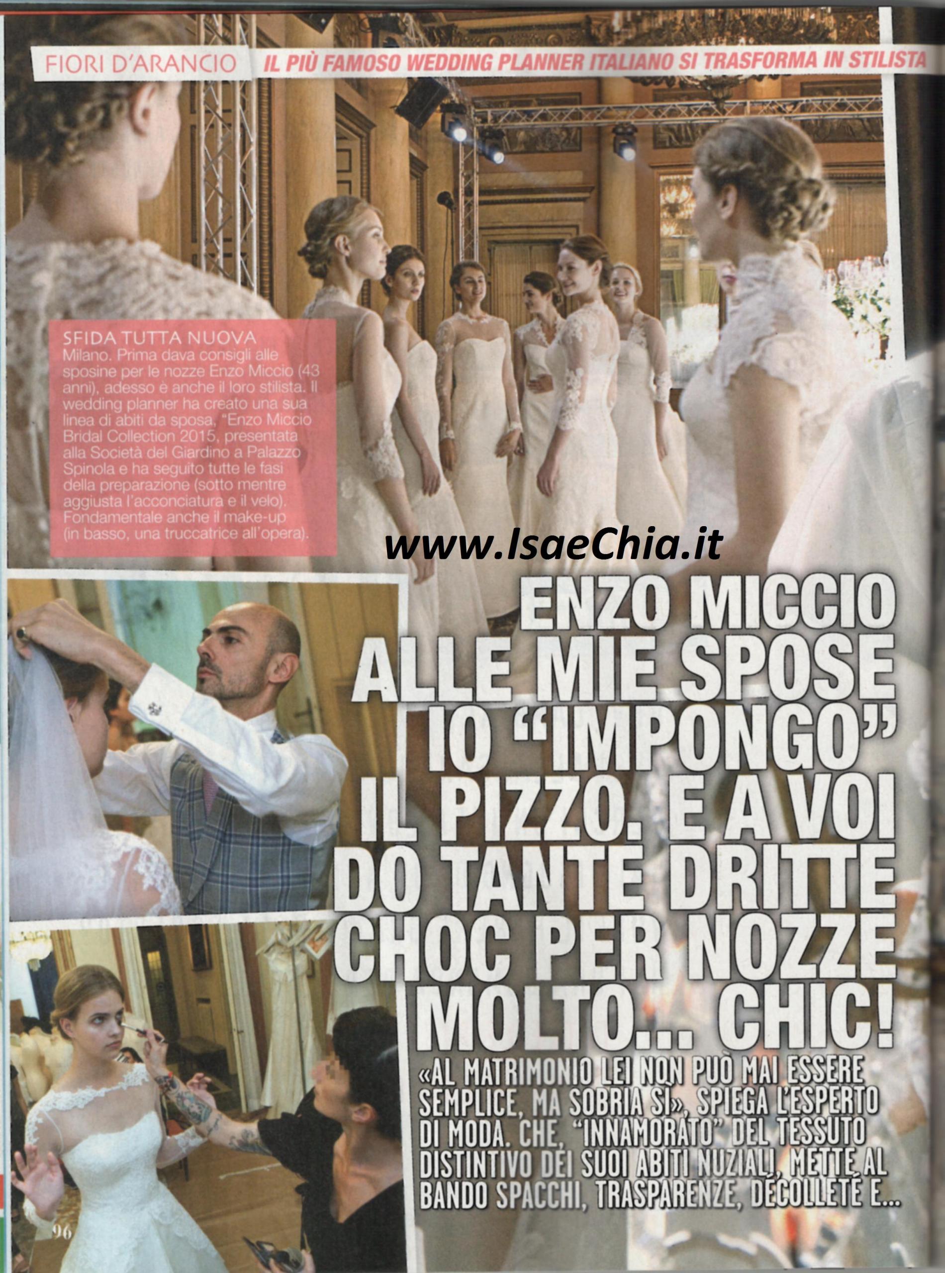 Enzo Miccio, il wedding planner più amato d’Italia grazie alle trasmissioni di Real Time ha debuttato anche come stilista: “Ho presentato a Milano la Enzo Miccio Bridal Collection ‘Back to Elegance’, ossia ‘ritorno all’eleganza’. Sono abiti eleganti, non appariscenti, romantici, in cui il pizzo è l’elemento distintivo. Mi sono dedicato molto al progetto, mi ha assorbito negli ultimi mesi. Lavorerò a tutto tondo con i matrimoni, ad aprile ho presentato anche la mia collezione di gioielli”. Quando gli si chiede qualche consiglio per le future spose, risponde: “Il mondo del wedding è pieno di insidie, c’è la possibilità di cadere nell’errore cercando di strafare. Meglio essere sobria, anche se la sobrietà è un valore relativo in caso delle nozze! Anche l’abito nuziale più sobrio è un abito che non si può indossare in metropolitana. Sobrietà non vuol dire semplicità, altrimenti ci si vestirebbe in maglietta e pantaloni. L’abito deve essere opulento. Il mio consiglio è innanzitutto rispettare il luogo in cui ci si sposa, quindi niente trasparenze, décolleté in mostra e spacchi. Evitiamo troppi ricami, pietre e i tessuti lucenti. Se si vuole osare un po’, c’è il ricevimento: lì sono consentiti scollature e capelli sciolti. Lo sposo è sempre stato un po’ “l’accessorio” della sposa, ma anche per loro deve valere il discorso della sobrietà: abito sartoriale grigio o blu, mai tonalità chiare. Al massimo, si può scegliere una cravatta intonata col colore dell’evento. Come si sceglie? Se c’è il mare può essere il blu, ma si può anche giocare sui contrasti”.