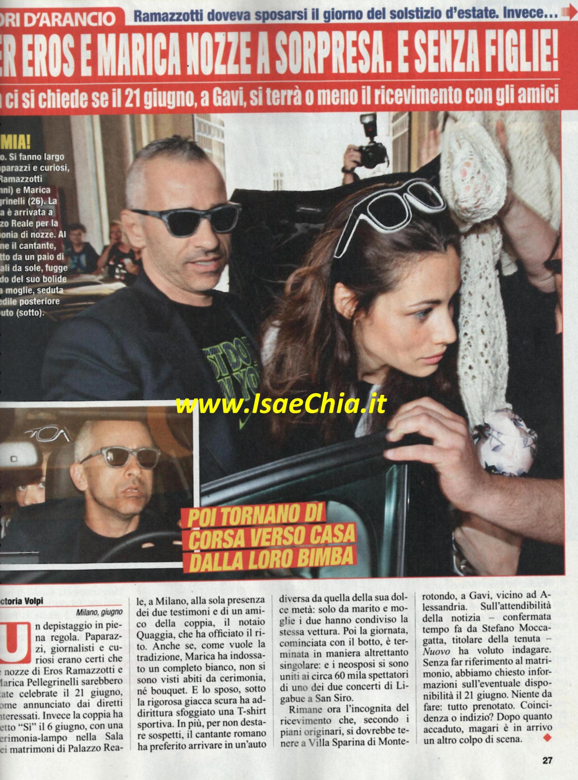 Un depistaggio in piena regola, quello di Eros Ramazzotti. Si era parlato del 21 giugno come data ufficiale per le nozze con Marica Pellegrinelli, ma in realtà pare che le nozze si siano già celebrate, il 6 giugno, con una cerimonia lampo nella Sala dei matrimoni al Palazzo Reale di Milano, con due soli testimoni e un amico della coppia, il notaio Quaggia, che ha officiato il rito. Marica aveva addosso un completo bianco, ma non si sono visti abiti da cerimonia, né bouquet. Addirittura, sotto la giacca, il cantante aveva una t-shirt sportiva nera. I due sono arrivati in auto separate per non destare sospetti, ma si sono allontanati nella stessa auto una volta dichiarati marito e moglie, tra i paparazzi e i curiosi. Di sera, hanno festeggiato in un modo singolare, ossia unendosi a 60.000 altre persone per il concerto di Ligabue a San Siro. Adesso rimane il mistero sul ricevimento a Villa Sparina di Monterotondo, a Gavi, vicino Alessandria: per il 21 giugno risulta tutto prenotato. Sarà per loro?