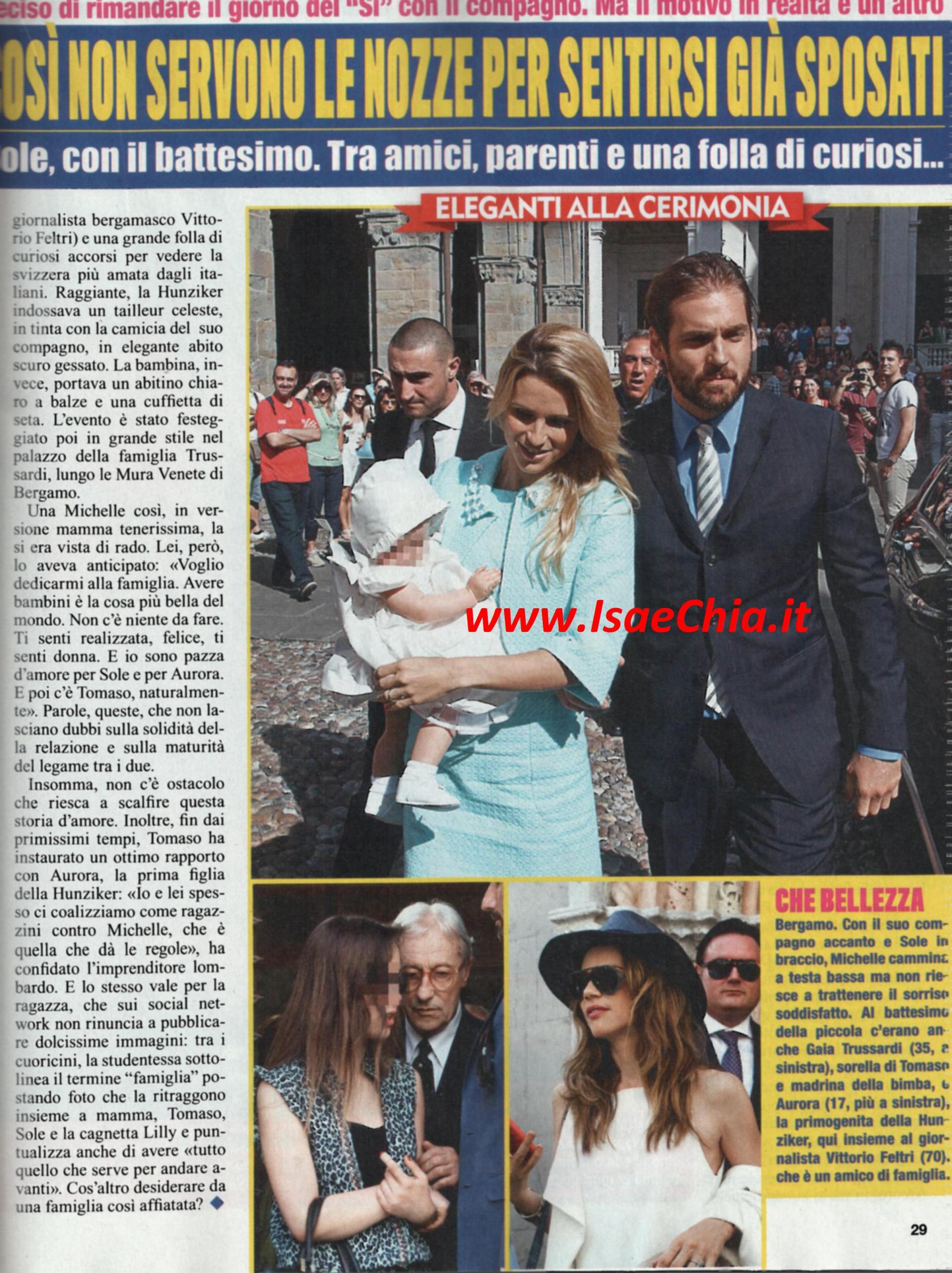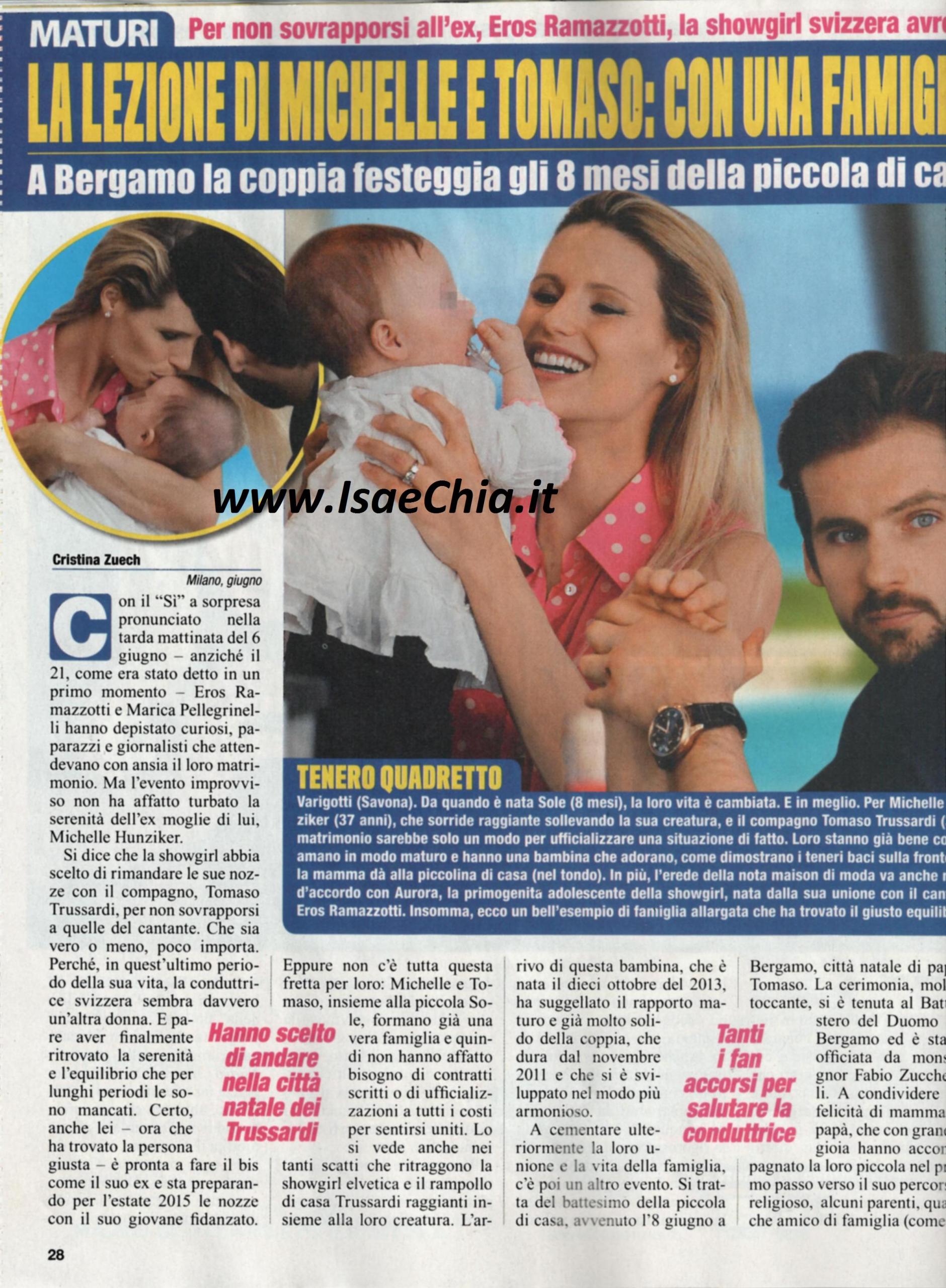 Certo è che la sua ex moglie, Michelle Hunziker, ha rimandato il suo matrimonio con l’imprenditore della moda Tomaso Trussardi, proprio per non far coincidere la data con quella di Eros. D’altronde, per loro, la nascita della piccola Sole basta a cementare la loro unione: il battesimo della figlia, avvenuto lo scorso 8 giugno, ha visto i genitori raggianti: ecco Michelle in tailleur celeste, che fa pendant con la camicia di lui, in gessato scuro. Madrina di Sole era Gaia, sorella di Tomaso, e Michelle ha dichiarato: “Voglio dedicarmi alla famiglia, Avere dei figli è la cosa più bella del mondo, ti senti realizzata” mentre Tomaso ha rivelato la complicità con la prima figlia della Hunziker, Aurora: “Spesso ci coalizziamo come ragazzini contro Michelle, che è quella che dà le regole!”