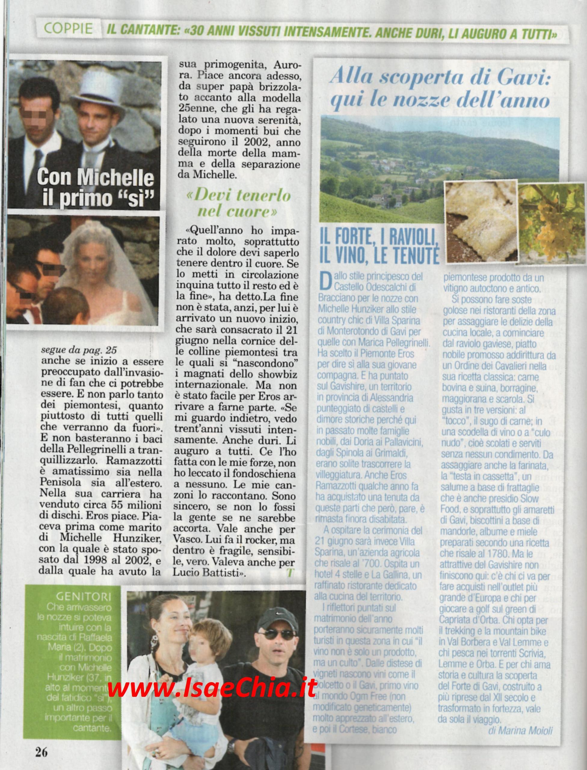 Steve McCurry, uno dei più grandi fotografi statunitensi, ha tenuto una mostra a Torino il 16 maggio, presso la galleria d’arte Adplog, di proprietà del calciatore Alex Del Piero. Per l’occasione è intervenuto anche il cantante Eros Ramazzotti, amico storico dell’asso della Juve, con la compagna Marica Pellegrinelli: “Alex è un amico e non potevo non esserci per il suo debutto nel mondo dell’arte. Non l’avrei mai mandato via dalla Juventus, perché, come Zanetti, è un esempio di sportività per tutti”. Ma, amicizia a parte, Ramazzotti sta frequentando spesso il Piemonte e queste visite sono dovute alle nozze con Marica, previste per il 21 giugno, che si terranno a Monterotondo di Gavi (AL): “Mi arrendo, confermo tutto. Non posso più fare finta di niente anche se inizio ad essere preoccupato dell’invasione di fan che ci potrebbe essere. Non parlo tanto dei piemontesi, ma di quelli che verranno da fuori”. Ripensando al suo passato, per lui il 2002 non è stato un anno facile: la morte della madre e la separazione dalla prima moglie Michelle Hunziker risalgono a quel periodo: “Quell’anno ho imparato molto, soprattutto che il dolore bisogna tenerlo nel cuore. Quest’anno festeggio il 30° anno di carriera. Se mi guardo indietro vedo trent’anni duri, vissuti intensamente. Ce l’ho fatta con le mie forze, non ho leccato il fondoschiena a nessuno. Sono sincero, le mie canzoni mi raccontano e la gente se n’è accorta”.