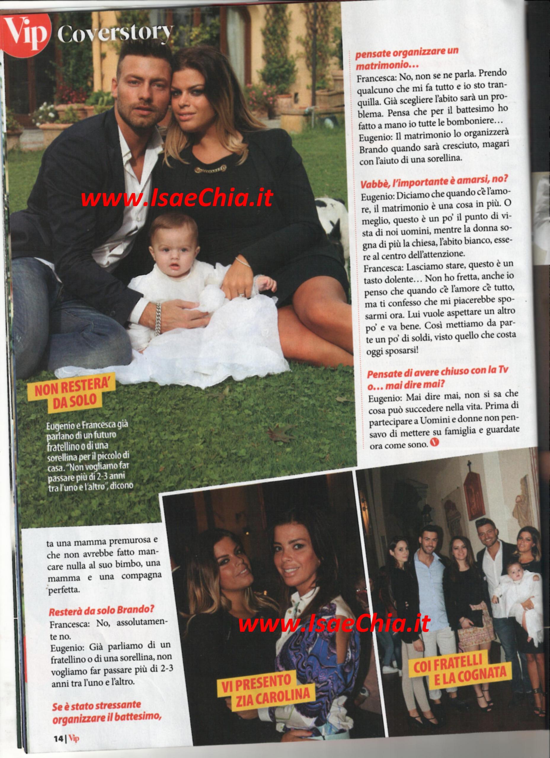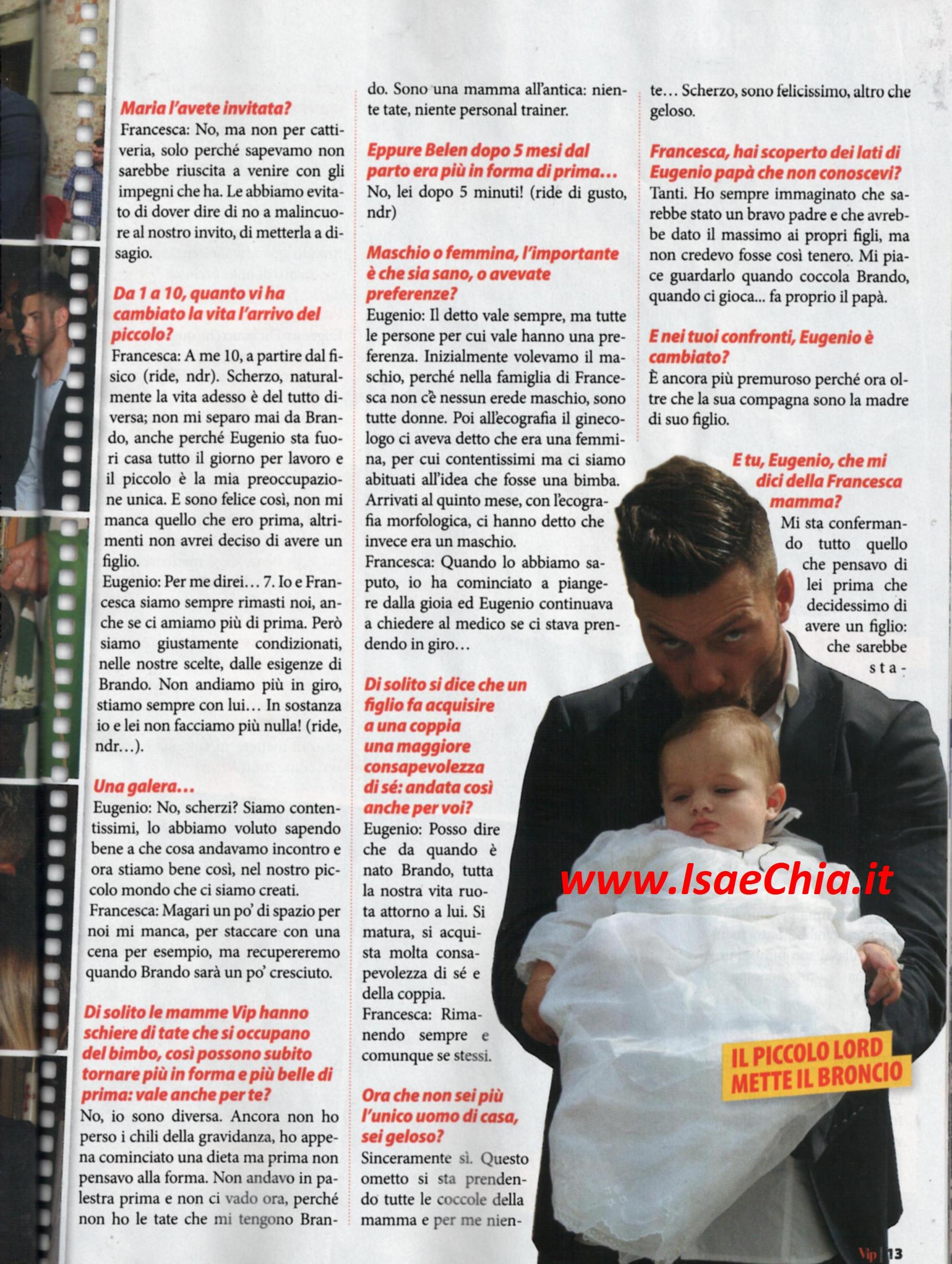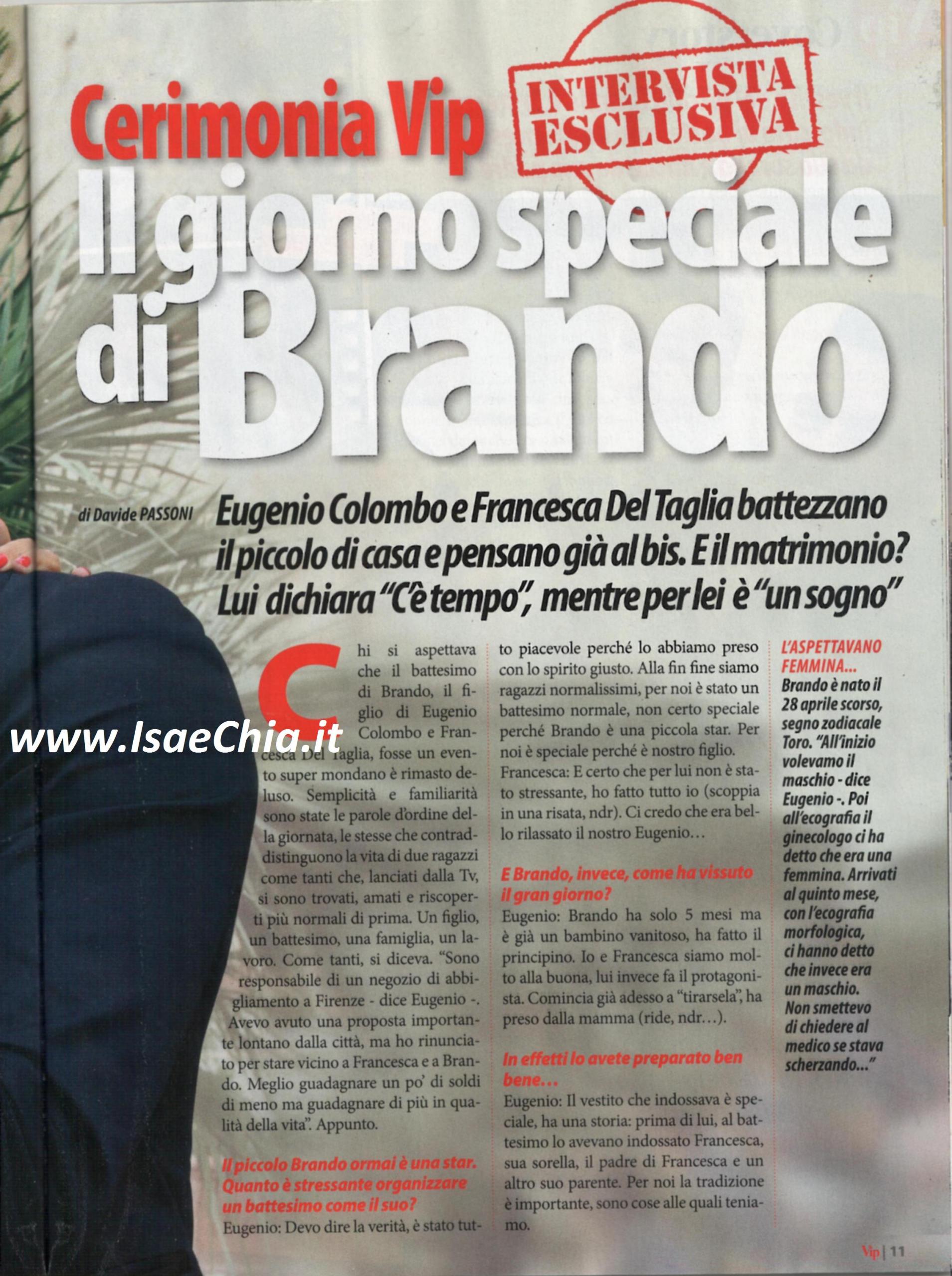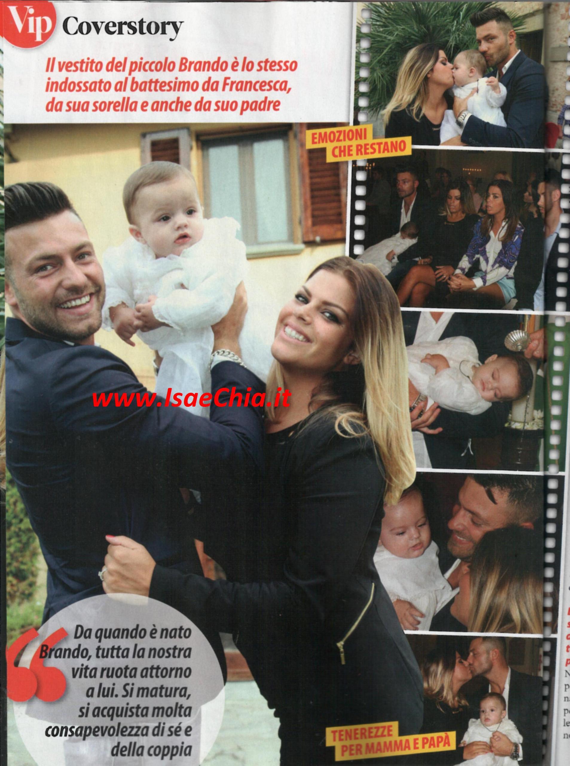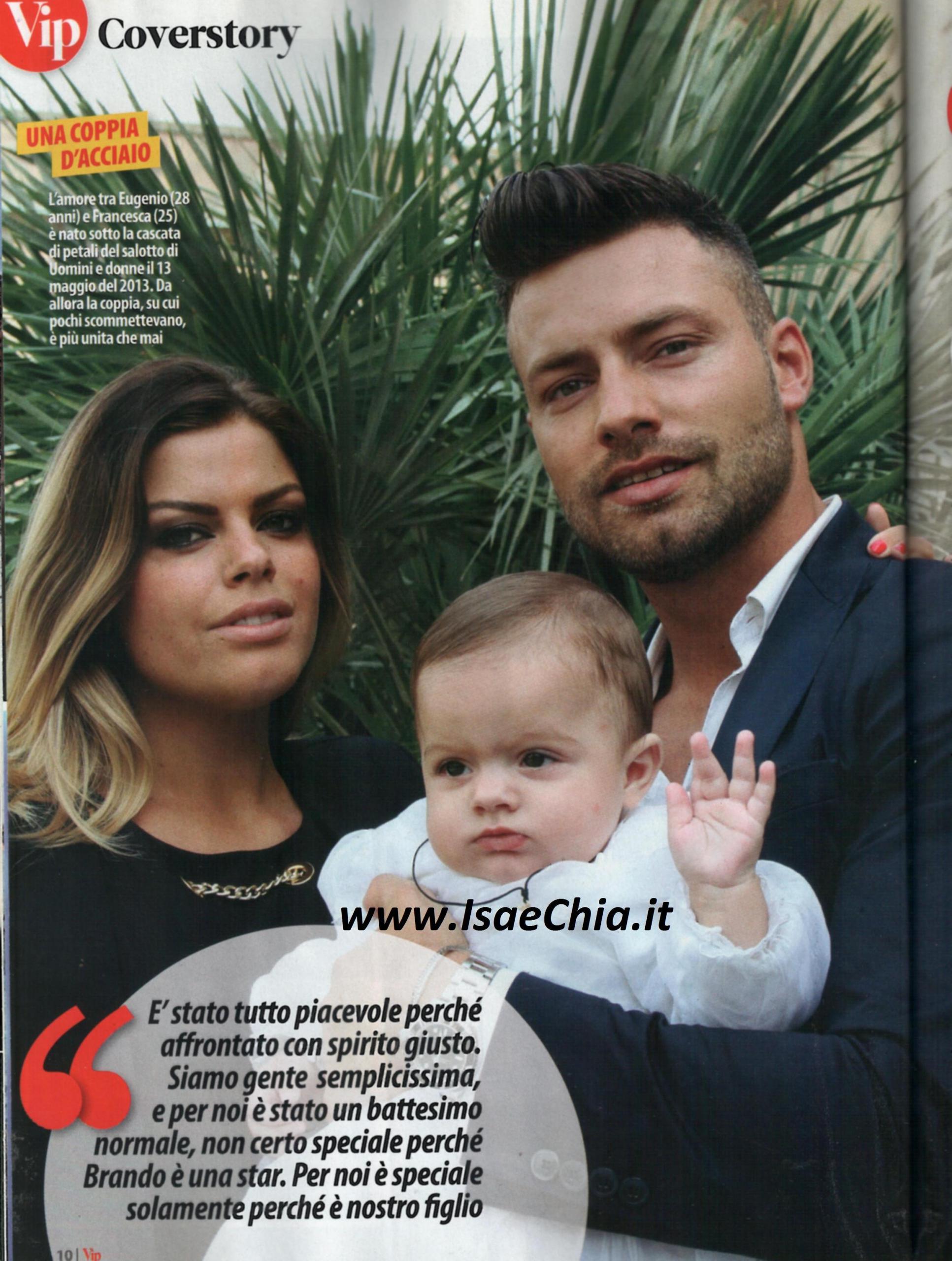 Chi si aspettava un evento mondano per il battesimo di Brando, figlio dell’ex tronista Eugenio Colombo e la sua compagna Francesca Del Taglia, si sbaglia: la loro è stata una cerimonia all’insegna della semplicità: “E’ stato tutto piacevole, perché l’abbiamo presa con lo spirito giusto. Siamo ragazzi normalissimi ed è stato un battesimo normale. Per noi Brando non è una piccola star, ma è speciale perché è nostro figlio” dice Eugenio, ma Francesca replica pronta: “E grazie che per lui non è stato stressante! Ho organizzato tutto io!”. “Brando ha 5 mesi ma è un bambino vanitoso e ha fatto il principino. Comincia già a tirarsela, come la mamma” aggiunge l’ex tronista. “Il vestito che indossava è speciale: prima di lui lo avevano indossato Francesca, il padre di Francesca e un altro suo parente. Non abbiamo invitato Maria De Filippi non per cattiveria, ma perché sapevamo che non sarebbe riuscita a venire per i suoi troppi impegni”. Quando si chiede loro quanto la loro vita sia cambiata dall’arrivo di Brando, Francesca risponde: “10, perché Eugenio sta fuori casa tutto il giorno e Brando e la mia unica occupazione. Ma non mi manca ciò che avevo prima, altrimenti non avrei scelto di avere un figlio. Non ho ancora perso i chili acquistati in gravidanza, ho iniziato una dieta ma non vado in palestra, così come non ci andavo prima: non ho le tate a cui affidare Brando, sono una mamma all’antica”. Lui, invece, risponde: “7: io e Francesca siamo sempre rimasti noi, ci amiamo più di prima. Non andiamo più in giro, stiamo sempre con lui! Ma siamo contentissimi, sapevamo a cosa saremmo andati incontro e stiamo bene così nel piccolo mondo che ci siamo creati. Recupereremo quando sarà cresciuto. Quest’ometto si sta prendendo tutte le coccole della mamma! Sono geloso” scherza. “Ho sempre immaginato che sarebbe stato un bravo padre, ma non credevo fosse così tenero. Mi piace guardarlo mentre gioca con lui. E ora è ancora più premuroso con me” dice la bella fiorentina. “Mi sta confermando tutto ciò che pensavo prima di avere un figlio: che sarebbe stata una mamma premurosa e una compagna premurosa” dice invece il cremonese. Dopo aver specificato che Brando non rimarrà solo, ma arriverà presto un fratellino o una sorellina, i due non parlano di nozze: “Non se ne parla di organizzarle: prendo qualcuno che mi fa tutto e io starò tranquilla. Già scegliere l’abito sarà un problema!” dice lei, ma lui rincara la dose: “Il matrimonio lo organizzerà Brando quando sarà cresciuto, magari insieme alla sorellina! Quando c’è l’amore, il matrimonio è una cosa in più”…Ma lei non è esattamente d’accordo: “Tasto dolente. Non ho fretta, ma mi piacerebbe sposarmi ora. Lui vuole aspettare un po’ per mettere da parte un po’ di soldi, visto quello che costa ora”. E il ritorno in tv? “Mai dire mai. Prima di andare sul trono non pensavo di metter su famiglia, e guarda adesso come sono”.