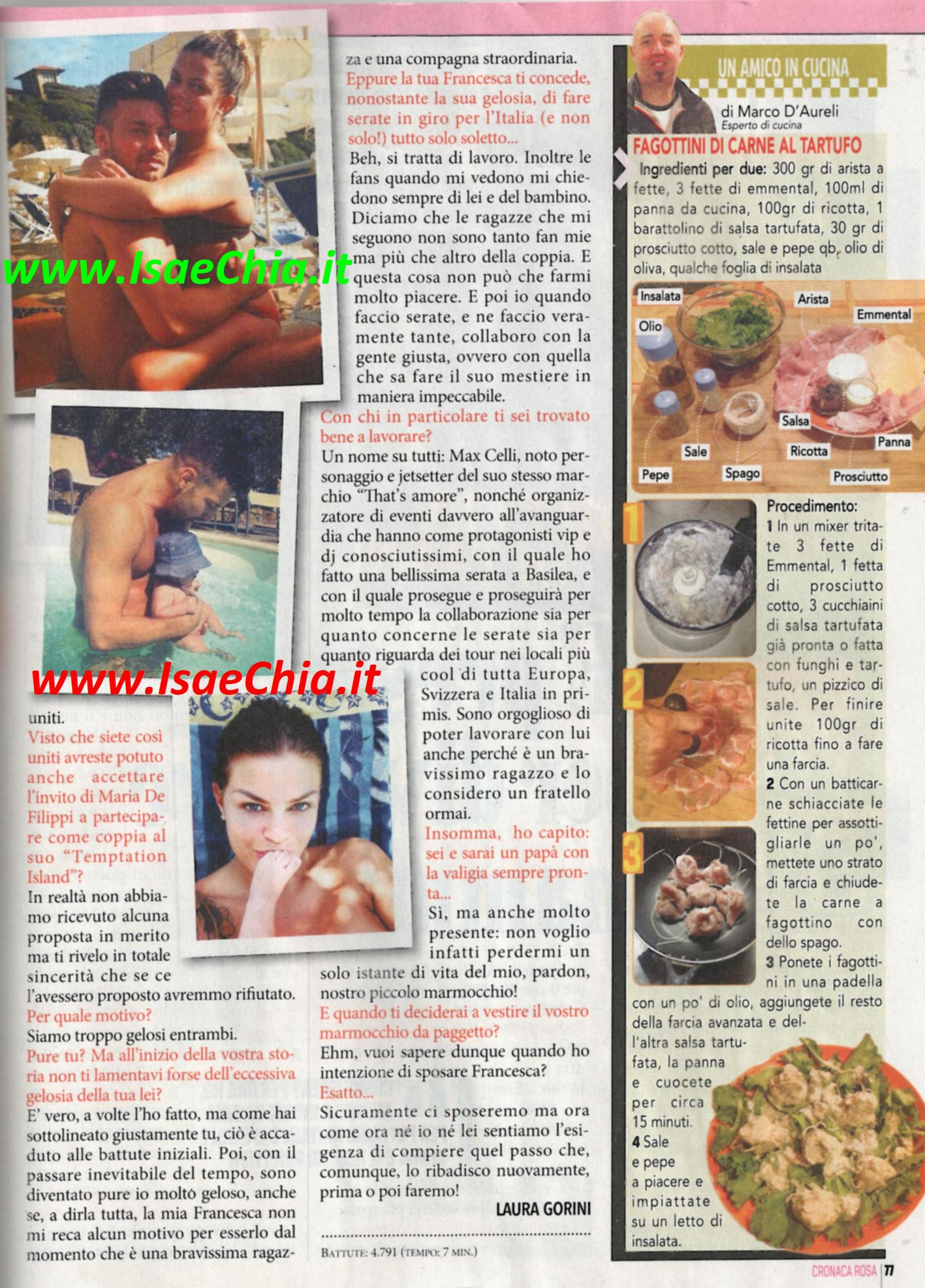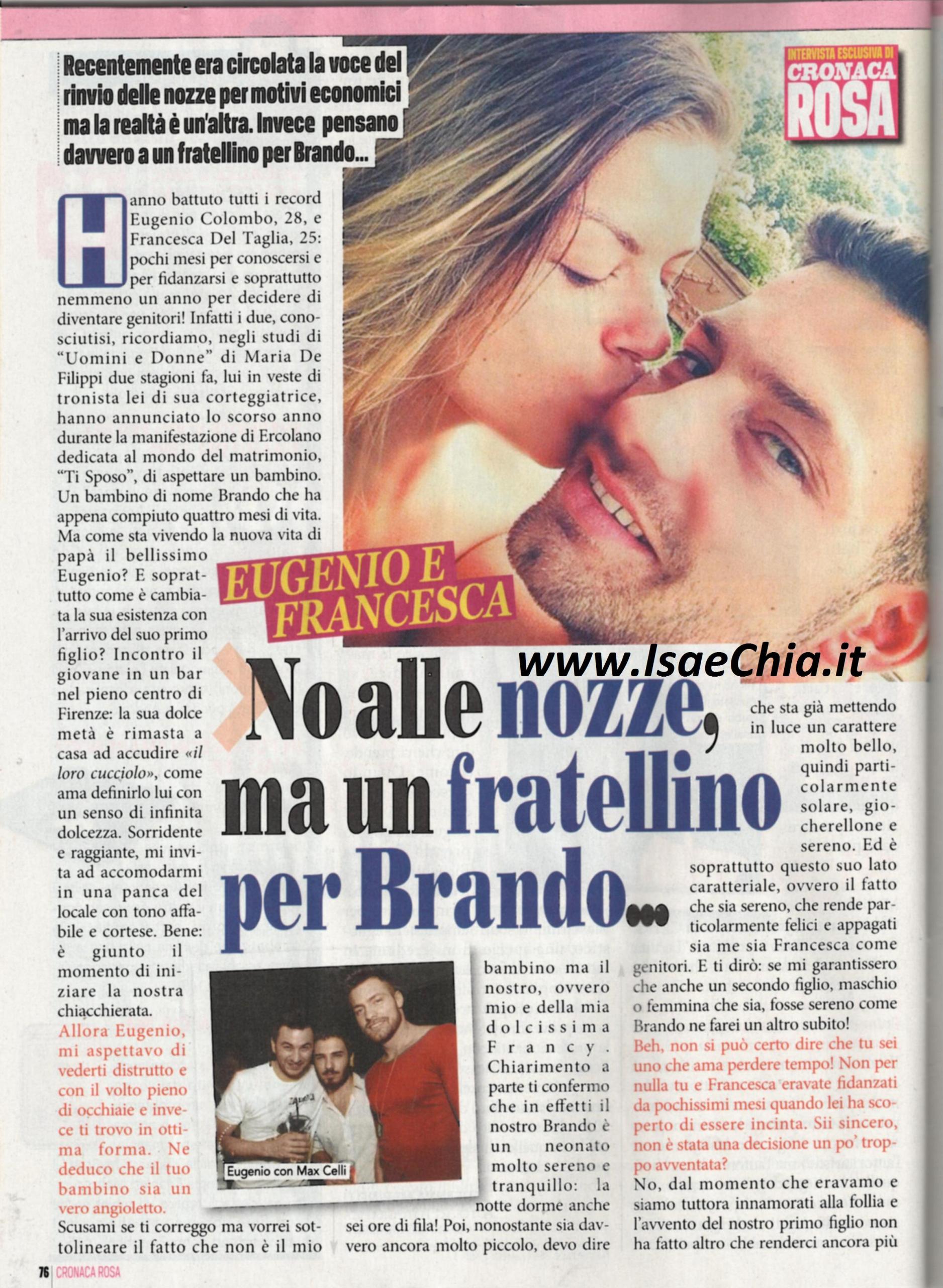 Hanno battuto ogni record Eugenio Colombo e Francesca Del Taglia: nel giro di qualche mese, l’ex tronista e la sua scelta sono diventati genitori del piccolo Brando e i due fanno progetti di vita insieme: “Il nostro piccolo è un neonato molto sereno e tranquillo: la notte dorme anche sei ore di fila! Poi, nonostante sia davvero molto piccolo, devo dire che sta già mettendo in luce un carattere molto bello, particolarmente solare e giocherellone. Ed è questo suo carattere che rende me e Francesca appagati come genitori. Se mi garantissero che anche un secondo figlio, maschio o femmina che sia, fosse sereno come Brando, ne farei subito un altro!”. A proposito, quando gli si chiede se la decisione di avere un figlio dopo pochi mesi di fidanzamento sia stata un po’ avventata, Eugenio risponde: “No, dal momento che eravamo e siamo ancora innamorati alla follia e l’avvento di nostro figlio non ha fatto che renderci ancora più uniti”. Dopo aver dichiarato di non aver ricevuto la proposta per partecipare a Temptation Island ma che non avrebbe partecipato comunque perché troppo gelosi, spiega: “All’inizio mi lamentavo dell’eccessiva gelosia di lei, ma col passare del tempo sono diventato anch’io molto geloso, anche se Francesca non me ne dà motivo. Lei mi concede di andare in giro per l’Italia per le serate, ma si tratta di lavoro e le fans mi chiedono di lei e del bambino, sono fan della coppia. Inoltre lavoro con persone che fanno il loro lavoro in modo impeccabile, uno su tutti l’organizzatore di eventi Max Celli, con il quale faccio serate in Italia e in Svizzera. Ma non voglio perdermi un solo istante della vita del mio piccolo…”. Ma quando gli si domanda se vestirà il piccolo da paggetto presto, risponde: “Quando ho intenzione di sposare Francesca? Sicuramente lo faremo ma per ora non sentiamo l’esigenza di compiere quel passo!”