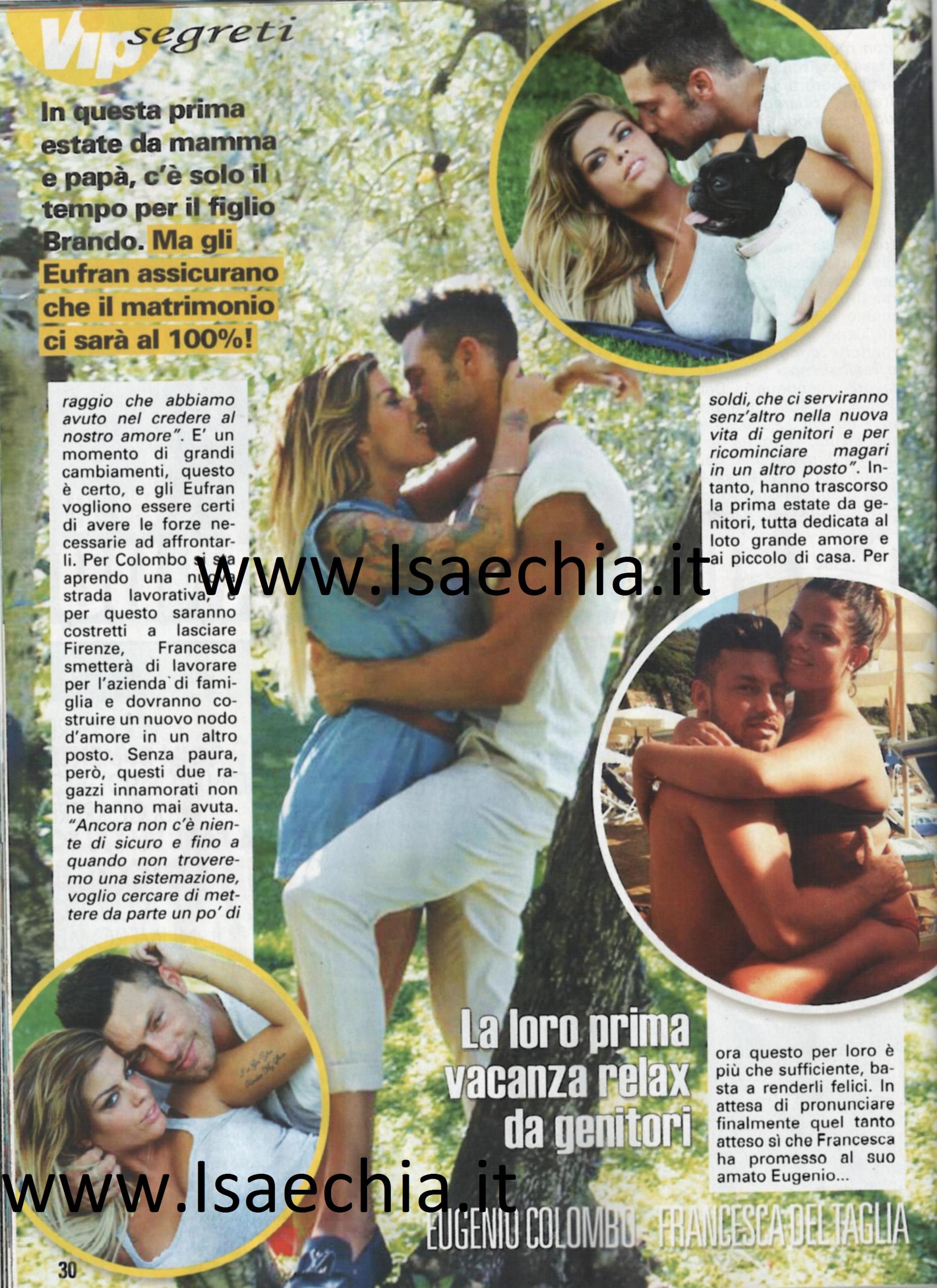 Eugenio Colombo ha scelto Francesca Del Taglia tra le sue corteggiatrici solo poco più di un anno fa, ma i due, insieme al piccolo Brando, formano già una famiglia: “Quando è nato Brando, ho fatto fatica a restare in piedi. Io e Francesca viviamo per lui, non facciamo più nulla” ha confessato il tenero papà. L’ex tronista cremonese, inoltre, ha scritto una lettera a Di Più nella quale ha chiesto alla sua amata di sposarlo (QUI l’articolo): “Ci manca una sola cosa per essere una famiglia a tutti gli effetti: il matrimonio” le ha scritto lui. Tutto pronto allora per le nozze? Secondo la bella toscana è presto, ma al contempo sogna di allargare la famiglia: “Vorrei una femminuccia, anche se, vedendo quanto è bravo Brando, mi va bene anche un maschietto. Ho paura perché penso che una femminuccia potrebbe essere un po’ più str**za di lui! E’ nei nostri programmi, non molto lontani. Stiamo vivendo un periodo di cambiamenti e mantenere nostro figlio è un grande impegno anche dal punto di vista economico”. Ecco perché Francesca ha risposto così alla lettera: “Prima realizziamoci nel lavoro: solo quando avremo un’occupazione stabile, potremo dedicarci al nostro matrimonio”. Lei, che ha lasciato un posto sicuro nell’azienda di famiglia, commenta quindi così la notizia delle loro nozze: “Non c’è ancora niente di sicuro, finché non troveremo una sistemazione. Voglio cercare di mettere da parte un po’ di soldi, che ci serviranno senz’altro nella nuova vita di genitori e per ricominciare, magari in un altro posto”.