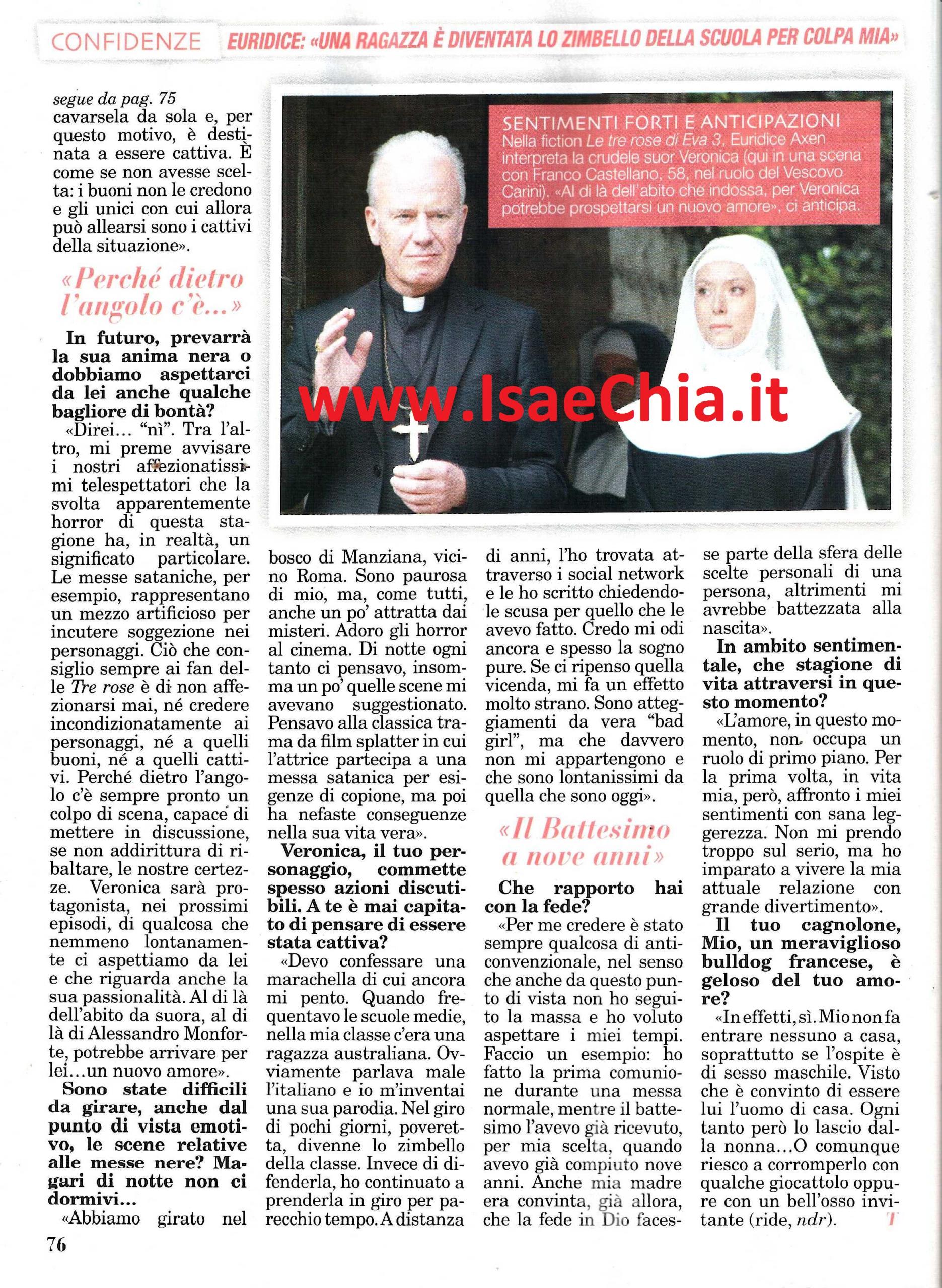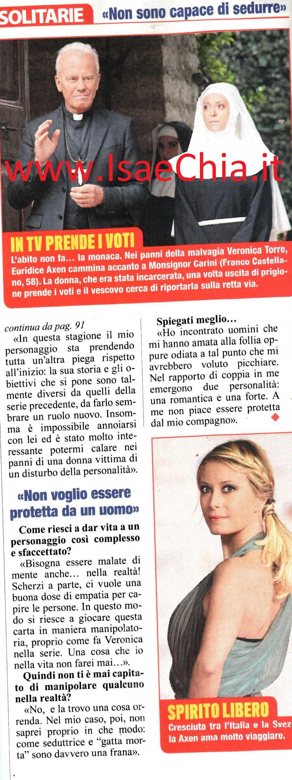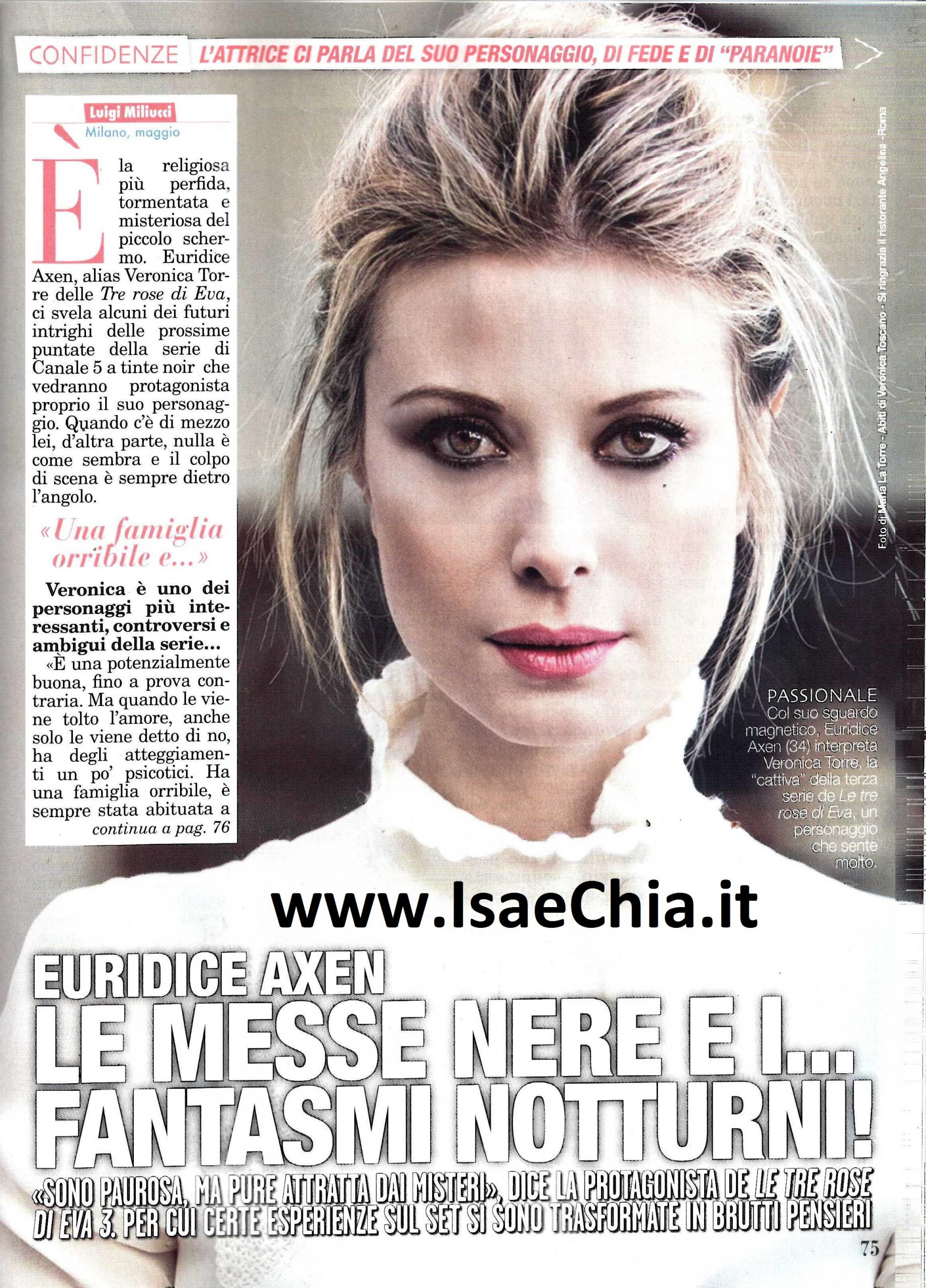 Dopo una lunga storia con l’attore Lorenzo Lavia, l’attrice Euridice Axen, una delle protagoniste di Le tre rose di Eva, è stata sotto i riflettori per alcuni scatti inequivocabilmente affettuosi al fianco dell’ex calciatore Marco Delvecchio, proprio quando lui risultava ufficialmente legato alla ballerina Sara Di Vaira, che era la sua maestra di ballo a Ballando con le stelle. L’attrice di origini svedesi ora spiega: “L’ho frequentato perché lui mi aveva detto di essere libero. Comunque è acqua passata e sono felice che ora sia tornato con Sara. Io, invece, continuo ad essere single! Non ho paura di soffrire, sono solo stanca di avere storielle senza senso. Non voglio accontentarmi del primo che capita e il giorno in cui incontrerò il mio principe azzurro sarò felice di poter ufficializzare il mio amore. Sono severa con me stessa, cerco sempre la perfezione; pensavo di essere una persona solida, invece sono un’eterna insicura“. Sul lavoro, invece, è sempre sicura di sé e tutto va a gonfie vele: “In questa stagione de Le tre rose di Eva il mio personaggio sta prendendo tutta un’altra piega rispetto all’inizio, sembra un ruolo nuovo. Insomma è impossibile annoiarsi con Veronica Torre: è stato interessante potermi calare nei panni di una donna vittima di un disturbo di personalità. Bisogna essere malate di mente anche…nella realtà! Scherzi a parte, ci vuole una certa dose di empatia. Tuttavia, nella vita non manipolerei mai qualcuno; lo trovo una cosa orrenda. Nel mio caso, non saprei nemmeno in che modo: come seduttrice e gatta morta sono una frana! Mi preme dire ai nostri telespettatori che la svolta ‘dark’ di questa stagione ha un significato particolare: le messe sataniche, ad esempio, sono un modo per incutere soggezione ai personaggi. Consiglio di non credere ai personaggi buoni, né a quelli cattivi: dietro l’angolo c’è sempre pronto un colpo di scena. Veronica sarà protagonista di qualcosa che non ci aspetteremmo nemmeno lontanamente, che riguarda la sua passionalità: potrebbe arrivare per lei…Un nuovo amore! Prossimamente andrò a Londra, dove ci sono alcune prospettive di lavoro interessanti, sia per il cinema che per la tv britannica e sono agevolata dal fatto di parlare un ottimo inglese. E poi, parteciperei volentieri a Ballando con le stelle, se Milly Carlucci me lo chiedesse. Anche se forse la Di Vaira non sarebbe proprio felice! Ormai, però, la mia storia con Marco appartiene al passato ed è stato un flirt senza importanza“.