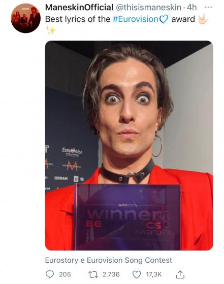 Nel frattempo, i Maneskin hanno portato a casa già un riconoscimento importante, quello per il miglior testo in gara. Una soddisfazione non da poco, che lo stesso Damiano David – leader della band – ha voluto condividere con i suoi follower sui suoi profili social:
