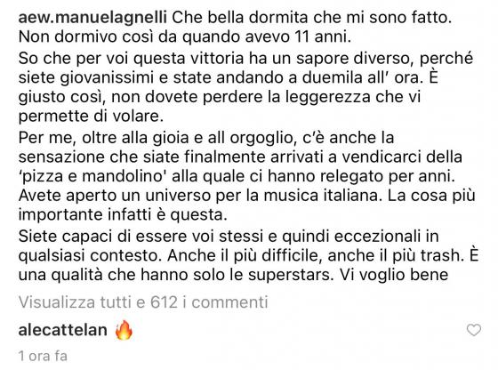 Che bella dormita che mi sono fatto. Non dormivo così da quando avevo undici anni. So che per voi questa vittoria ha un sapore diverso. Siete giovanissimi e state andando a duemila all’ora. E’ giusto così. Non dovete perdere la leggerezza che vi permette di volare. Per me, oltre alla gioia e all’orgoglio, c’è anche la sensazione che siate finalmente arrivati a vendicarci della “pizza e mandolino” alla quale ci hanno relegato per anni. Avete aperto un universo per la musica italiana. La cosa più importante infatti è questa. Siete capaci di essere voi stessi in qualsiasi contesto, anche il più difficile, anche il più trash. E’ una qualità che hanno solo le superstars. Vi voglio bene.