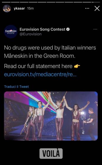 A seguito delle accuse di consumo di droga nella Green Room dell’Eurovision Song Contest Grand Final di sabato 22 maggio l’European Broadcasting Union (EBU.) come richiesto dalla delegazione italiana, ha condotto un esame approfondito dei fatti, controllando anche tutti i filmati disponibili. Un test antidroga è stato anche intrapreso volontariamente nella giornata di oggi dal cantante del gruppo Maneskin che ha restituito un risultato negativo. Nessun consumo di droga è avvenuto nella Green Room e riteniamo chiusa la questione. Siamo allarmati dal fatto che speculazioni inesatte che portano a notizie false abbiano oscurato lo spirito e l’esito dell’evento e influenzato ingiustamente la band. Ci congratuliamo ancora una volta con Maneskin e auguriamo loro un enorme successo. Non vediamo l’ora di lavorare con il nostro partner italiano Rai alla produzione di uno spettacolare Eurovision Song Contest in Italia il prossimo anno.