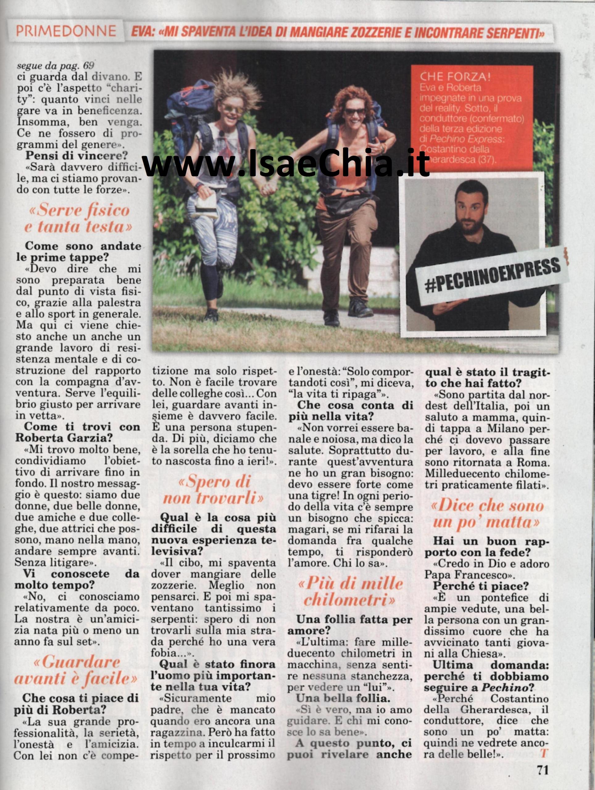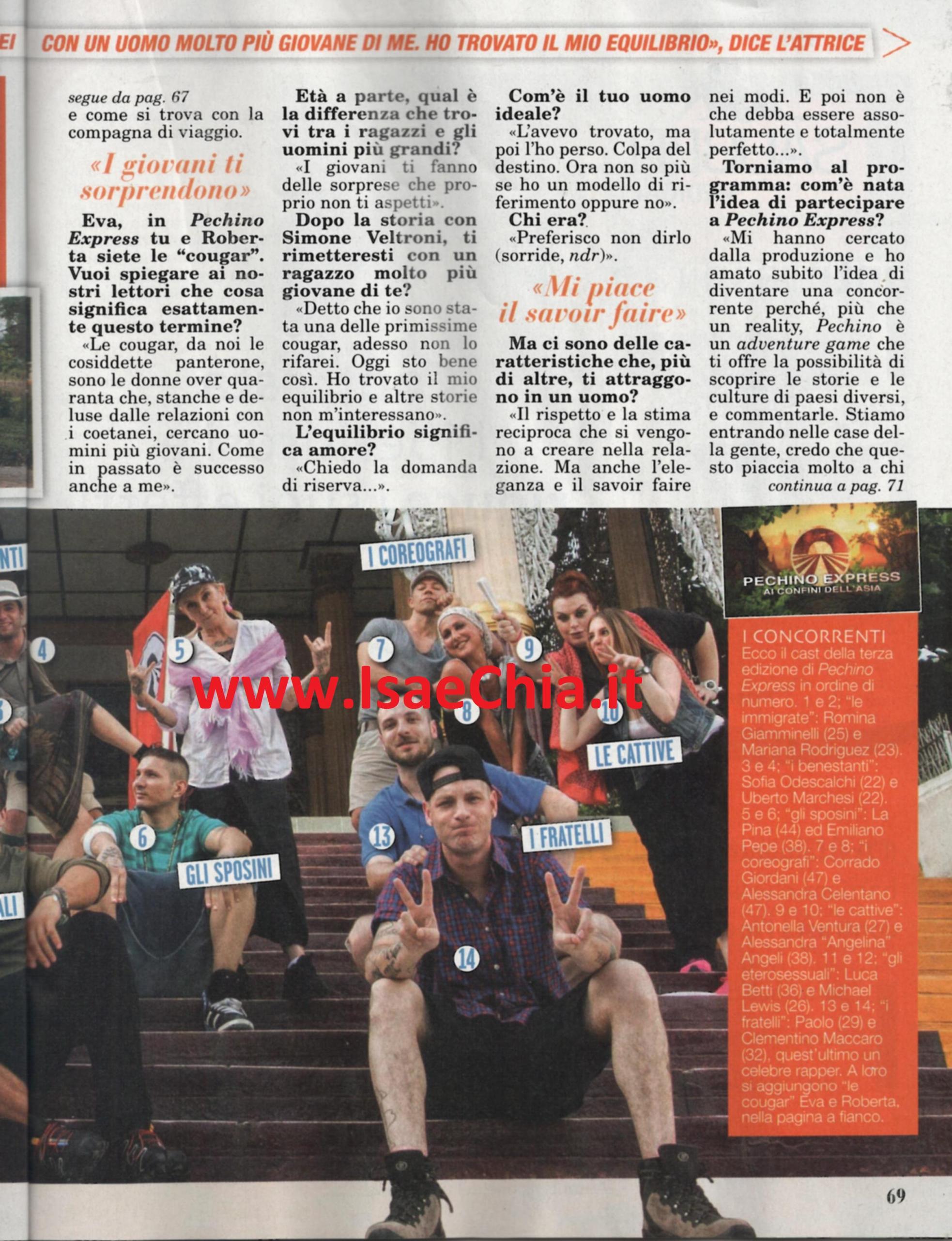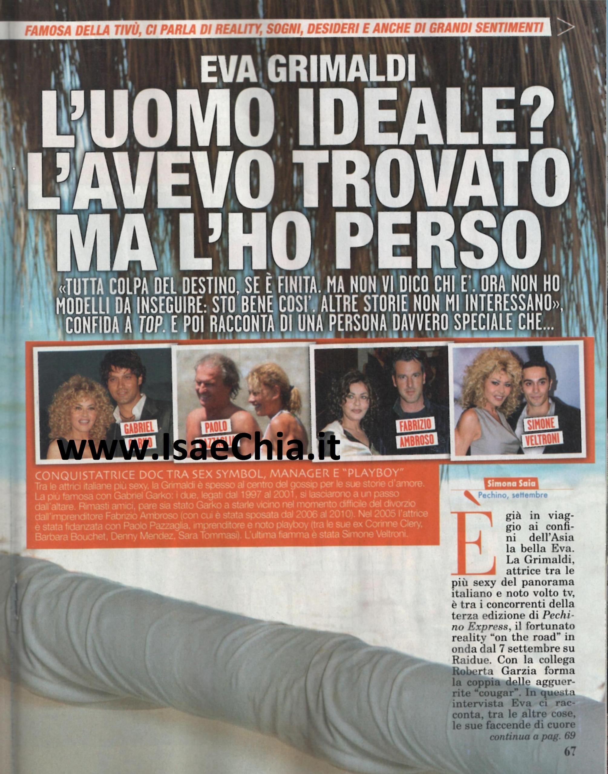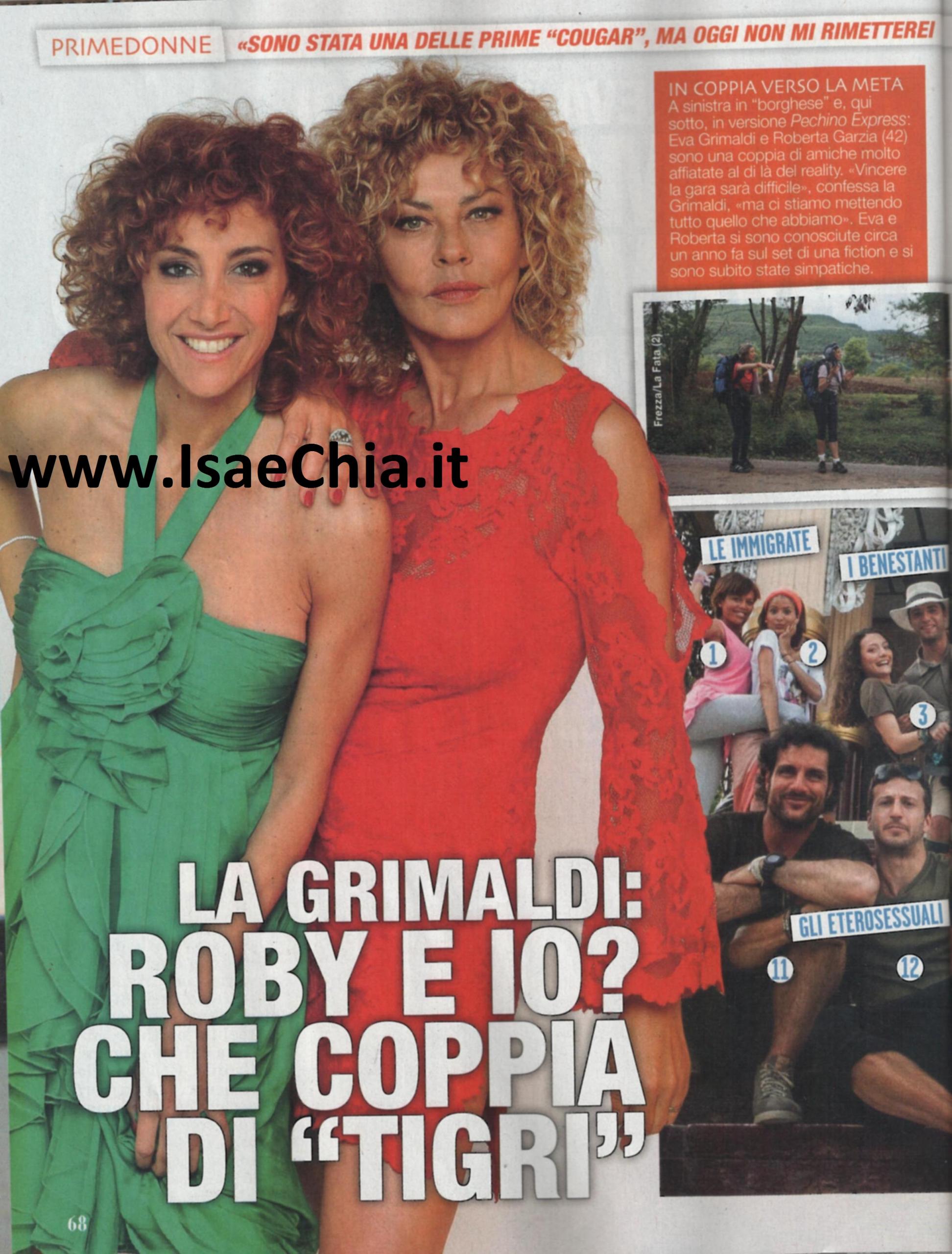 Eva Grimaldi è senza dubbio una delle rivelazioni della terza edizione di Pechino Express. In coppia con la collega attrice Roberta Garzia, l’ex soubrette del Bagaglino racconta il suo docureality attraverso l’Asia: “Io e Roberta siamo la coppia delle “Cougar“, ossia le panterone, le donne over 40 che, deluse dalla relazioni coi coetanei, cercano uomini più giovani, come in passato è successo a me” dice, facendo riferimento alla storia d’amore vissuta con l’attore Gabriel Garko, di 13 anni più giovane. “I giovani ti fanno sorprese che non ti aspetti. Dopo la mia storia con Simone Veltroni, sono tornata single e devo dire che oggi non tornerei con un uomo più giovane: oggi sto bene così, ho trovato il mio equilibrio e altre storie non m’interessano. Avevo trovato il mio uomo ideale, ma poi l’ho perso. Colpa del destino. Ora non so se ho ancora un modello di riferimento o no…” dice lei, ma quando le si chiede chi fosse, preferisce non dirlo: “Mio padre è stato l’uomo più importante della mia vita.E’ morto che ero una ragazzina, ma mi ha insegnato che comportandosi con rispetto e onestà, si è ripagati”. Tornando al viaggio, racconta: “Mi hanno cercato dalla produzione e mi è subito piaciuta l’idea, perché è un adventure game che offre la possibilità di scoprire paesi diversi e commentarli. E poi c’è l’aspetto charity: quanto vinci va in beneficenza. Ce ne fossero di programmi così! Mi sono preparata molto a livello fisico con lo sport, ma anche l’equilibrio con la compagna di viaggio è fondamentale. Con Roberta condivido l’obiettivo di arrivare in finale; siamo due belle donne, due amiche e due colleghe che possono andare avanti, senza litigare. Ci conosciamo da poco, ci siamo conosciute un anno fa sul set. Di lei mi piacciono la professionalità, la serietà, l’onestà; non c’è competizione, ma solo rispetto e non è facile trovare colleghe così. E’ una persona stupenda, la sorella che ho tenuto nascosta fino a ieri! Cosa mi spaventa? Il cibo, mangiare le zozzerie. E i serpenti!”. Quando le si chiede una follia fatta per amore, l’attrice veronese risponde: “L’ultima: fare 1200 km in macchina per vedere “lui”: una vera follia, ma chi mi conosce sa che io amo guidare” e infine, quando le si chiede perché seguirla a Pechino, risponde: “Perché, come dice il conduttore Costantino della Gherardesca, sono un po’ matta, quindi ne vedrete ancora delle belle!”