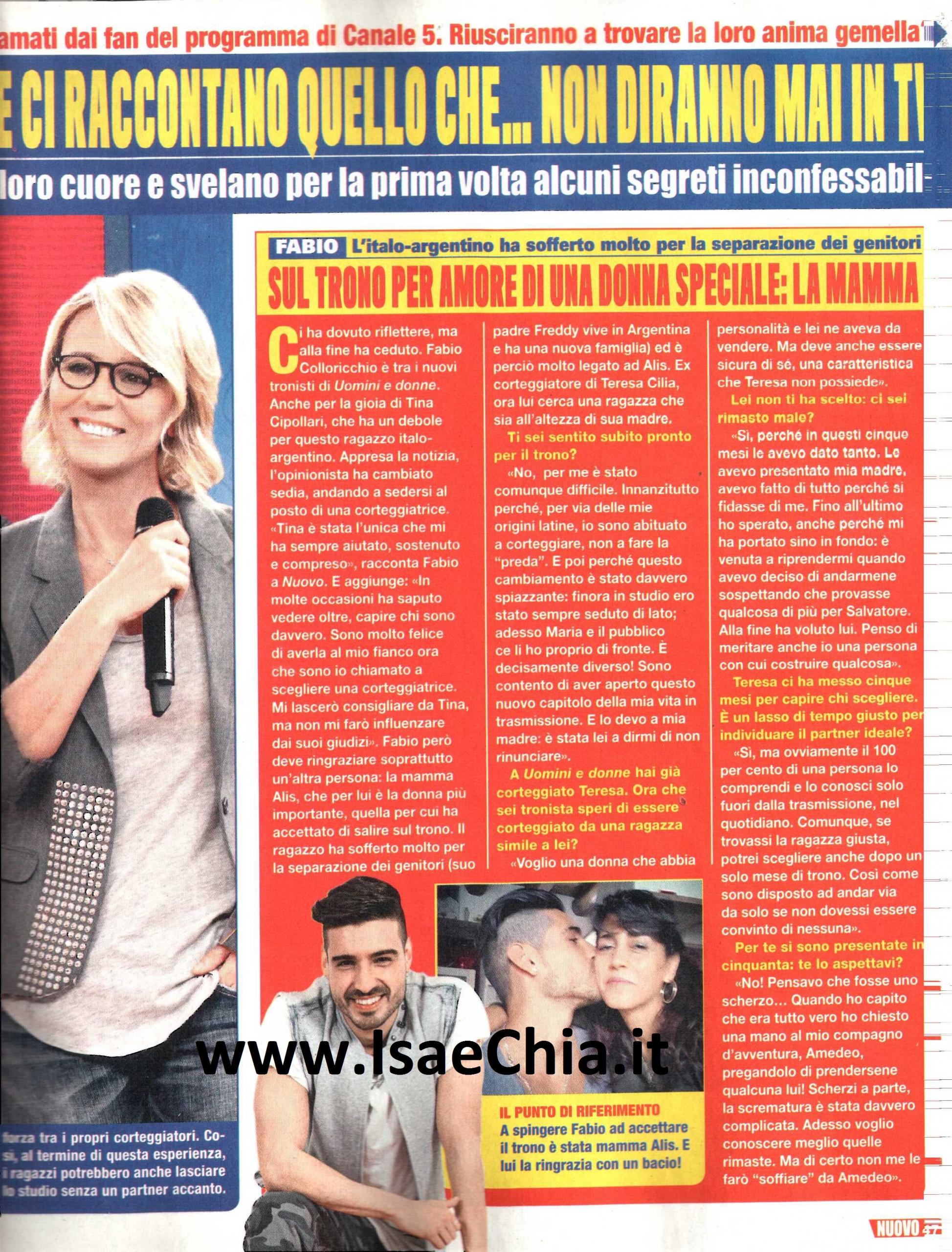 Ci ha dovuto riflettere un po’, ma alla fine è contento di aver accettato il trono: dopo non esser stato scelto da Teresa Cilia, la conduttrice Maria De Filippi ha deciso di promuovere a tronista Fabio Colloricchio, per la gioia di Tina Cipollari. La bionda opinionista, infatti, non ha mai nascosto il debole per il bell’italo-argentino e lui conferma che il sentimento è reciproco: “Tina è stata l’unica che mi ha sempre aiutato, sostenuto e compreso. In molte occasioni ha saputo guardare oltre, capire chi sono davvero. Sono molto felice di averla seduta al mio fianco ora che sono chiamato a scegliere una corteggiatrice. Mi lascerò consigliare da lei, ma non mi farò influenzare dai suoi giudizi” dice lui. Ma la donna che è stata decisiva perché accettasse il trono è stata la mamma Alis, alla quale Fabio è molto legato, in quanto ha sofferto per la separazione da suo padre. “Non mi sono sentito subito pronto per il trono. Innanzitutto perché, per via delle mie origini latine, io sono abituato a corteggiare, non a fare la preda. E poi questo cambiamento è stato davvero spiazzante: finora in studio ero seduto sempre di lato, adesso ho Maria e il pubblico di fronte! Sono contento di aver aperto questo nuovo capitolo e lo devo a mia madre: è stata lei a dirmi di non rinunciare“. Parlando delle differenze tra Teresa e la ragazza che spera di trovare, Fabio dice: “Voglio una donna che abbia personalità da vendere, ma deve essere anche sicura di sé, caratteristica che Teresa non ha. Ci sono rimasto male perché in questi cinque mesi le avevo dato tanto, le avevo presentato mia madre, avevo fatto di tutto perché si fidasse di me. Fino all’ultimo ci ho sperato, anche perché è venuta a riprendermi quando ho deciso di andare via sospettando che provasse qualcosa di più per Salvatore Di Carlo. Alla fine ha voluto lui. Penso di meritare anch’io una persona con cui costruire qualcosa. Ovviamente, il 100% di una persona lo conosci solo fuori dalla trasmissione, ma se trovassi la ragazza giusta, potrei scegliere anche dopo un mese di trono, così come andrei via se non dovessi essere convinto da nessuna. Non mi aspettavo si presentassero in 50 già alla prima puntata! Pensavo fosse uno scherzo, ma quando ho capito che era vero, ho chiesto al mio compagno d’avventura Amedeo Andreozzi di darmi una mano e prendersi qualcuna lui! A parte gli scherzi, la scrematura è stata davvero complicata; ora voglio conoscere quelle rimaste e di certo non me le farò soffiare da Amedeo!“.