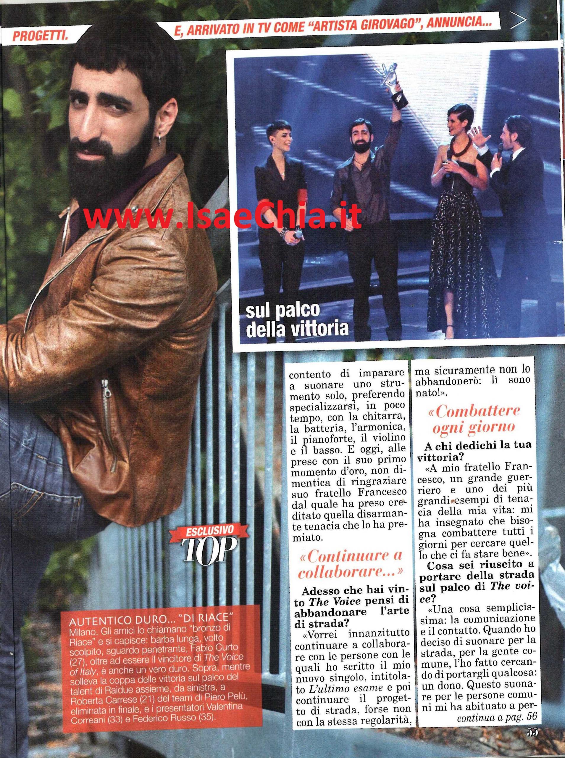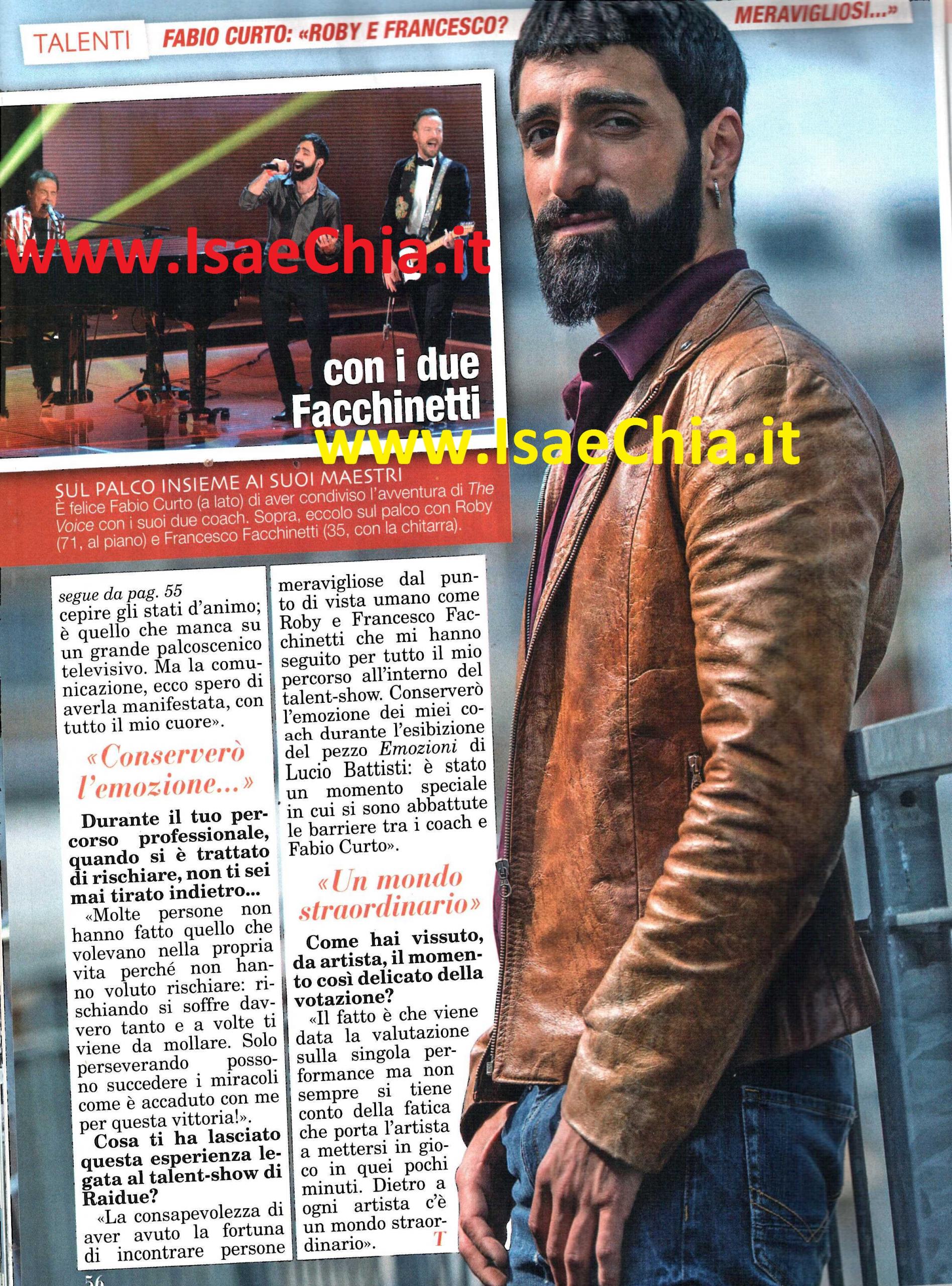 Ha vinto la terza edizione di The Voice of Italy, eppure Fabio Curto mantiene i piedi per terra. Il 27enne di origini cosentine, trapiantato a Bologna, non vuole abbandonare l’arte di strada: “Vorrei innanzitutto continuare a collaborare con le persone con le quali ho scritto il mio singolo L’ultimo esame e poi continuare il mio progetto di strada, forse non con la stessa regolarità, ma sicuramente non lo abbandonerò: lì sono nato! Dedico la mia vittoria a mio fratello Francesco, un grande guerriero, uno dei più grandi esempi di tenacia della mia vita. Mi ha insegnato che bisogna combattere tutti i giorni per ciò che ci fa stare bene. Sul palco di The Voice ho portato una cosa semplicissima: la comunicazione, il contatto. Quando ho deciso di suonare per strada, l’ho fatto per portare un dono alla gente. Suonare per le persone comuni mi ha abituato a percepire gli stati d’animo, che è una cosa che manca sul palcoscenico televisivo. Ma la comunicazione, spero di averla manifestata, con tutto il cuore. Molte persone non hanno fatto ciò che volevano nella loro vita perché non hanno rischiato: rischiando si soffre e ti viene da mollare. Ma solo perseverando possono succedere i miracoli, come è avvenuto a me con questa vittoria! Questa vittoria mi ha lasciato la consapevolezza di avere la fortuna di aver incontrato delle persone meravigliose dal punto di vista umano come Roby e Francesco Facchinetti. Conserverò l’emozione dei miei coach quando ho cantato Emozioni di Lucio Battisti: è stato il momento in cui si sono abbattute le barriere tra di noi. Il fatto è che venga valutata la singola esibizione e non sempre sul percorso dell’artista, mentre dietro ogni artista c’è un mondo straordinario”.