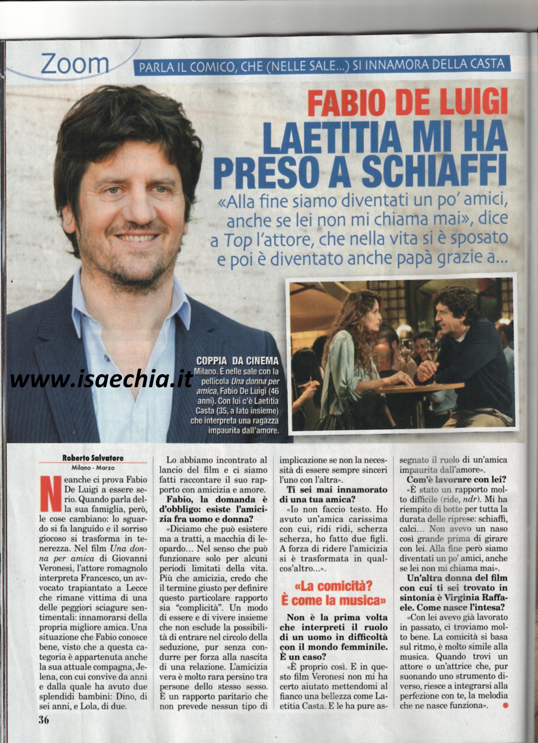 L’attore, invece, ha dichiarato, scherzando: “E’ stato un rapporto molto difficile, perché lei mi ha riempito di botte per tutta la durata delle riprese. Alla fine siamo diventati un po’ amici, anche se lei non mi chiama mai. E’ molto preparata ed è una diva internazionale, ma non gioca a fare la star”. Interrogato sullo stesso tema, l’amicizia tra uomo e donna, De Luigi risponde: “Può esistere, ma a tratti, a macchia di leopardo, solo in alcuni periodi della vita. Credo che il termine più giusto sia “complicità”: un modo di essere e vivere insieme senza escludere la possibilità di seduzione, ma senza condurre necessariamente a una relazione. Non prevede nessuna implicazione se non la necessità di essere sinceri. Io ho pochi amici e ho avuto un’amica carissima, con cui, ridi ridi, ho fatto due figli!”. Parlando dell’altra protagonista femminile, Virginia Raffaele, dice: “Avevo già lavorato con lei e ci troviamo molto bene: la comicità è come la musica e quando trovi una che suona un altro strumento, ma riesce a integrarsi con te, la melodia che nasce funziona”.