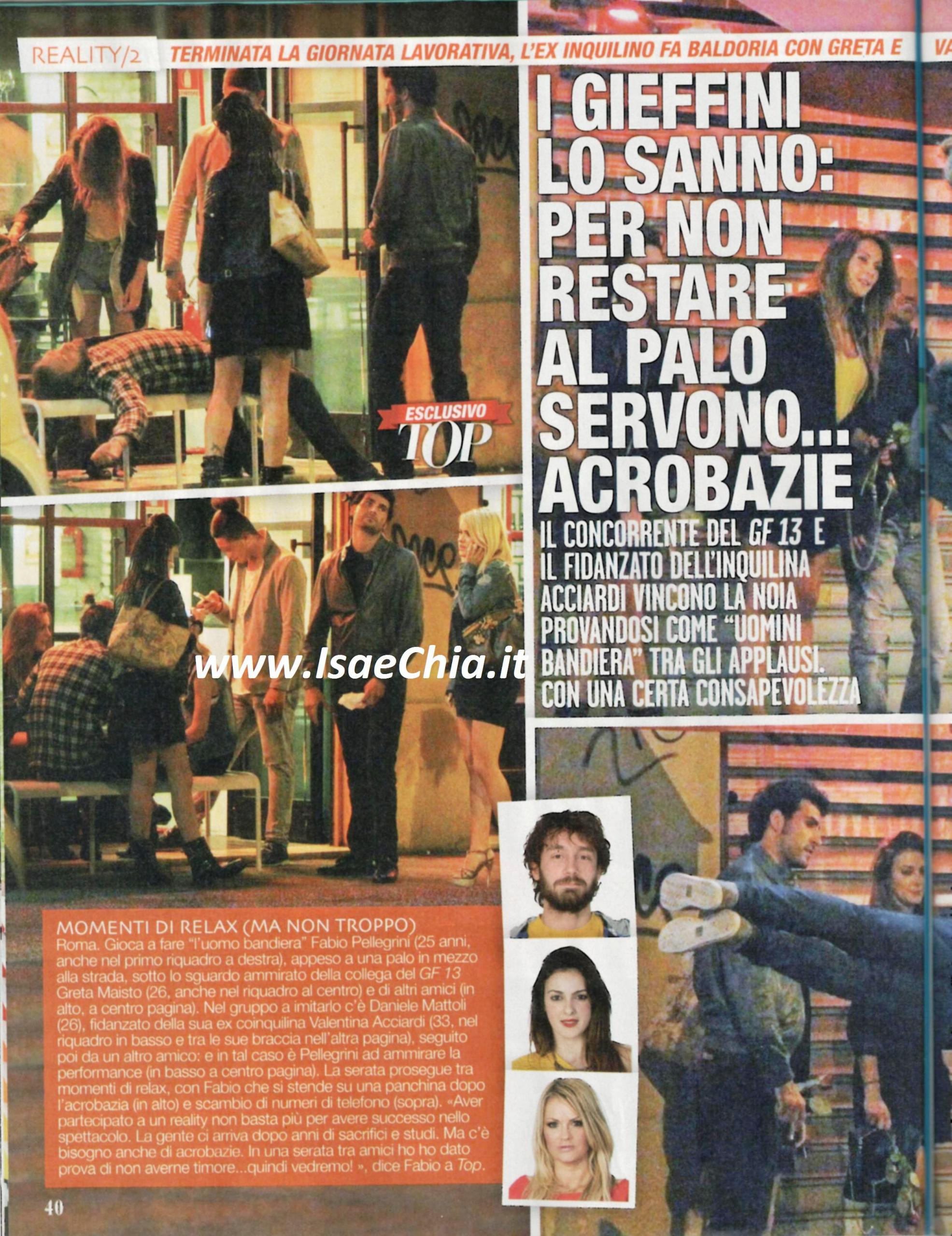 Terminata la giornata “diversa” troviamo Fabio anche di sera: eccolo, infatti, con due ex coinquiline: Greta Maisto e Valentina Acciardi, accompagnata dal fidanzato Daniele Mattoli. Fabio, come suo solito, ne approfitta per fare acrobazie e si esibisce nel numero della “bandiera” restando orizzontale reggendosi ad un palo.