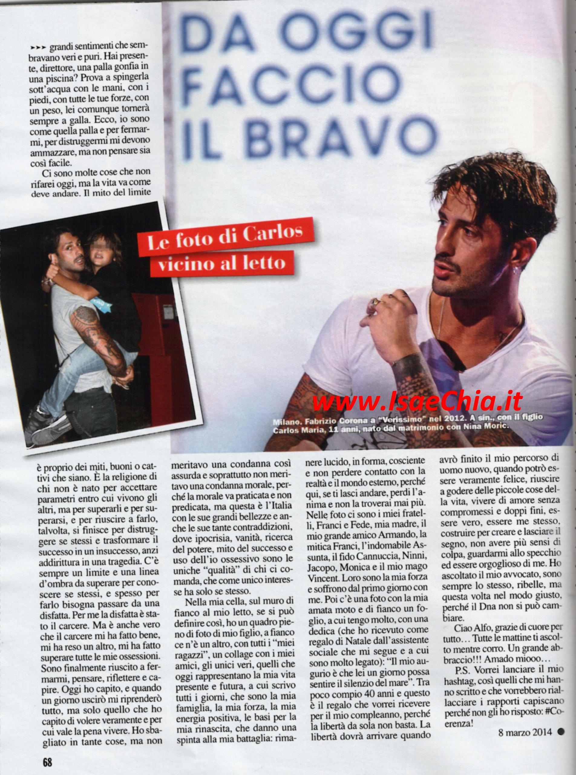 L’ex paparazzo Fabrizio Corona scrive una profonda lettera ad Alfonso Signorini, direttore di Chi: “Ciao direttore, sono passati 14 mesi dal momento del mio arresto, 410 giorni. Tante cose sono successe e una mi ha dato la forza di tirare avanti: lunedì 10 febbraio, il gip di Milano si è pronunciato in relazione a una mia istanza e la mia pena è stata rideterminata, passando da una pena di 13 anni e 2 mesi a una di 9 anni. In questi mesi ho vissuto continuamente un’alternanza di sentimenti, che a volte cambiavano a distanza di ore: tristezza, rabbia, riflessione, sconforto. Non ho mai tentato il suicidio, non sono mai stato depresso, ho sempre trovato la forza di andare avanti. Ho subito di tutto, tradimenti di ex amici, senza senso perché ormai ero impossibilitato a reagire. Nel mio lavoro ci ho sempre messo la faccia, mi sono preso le mie responsabilità: credo che tra persone vere ci si dovrebbe picchiare e poi magari ricominciare daccapo, mentre in questi mesi gli avvoltoi hanno giocato sfruttando la mia condizione di debolezza. Ma io sono come una palla gonfia in piscina, che torna su anche se provi a spingerla giù. Per me il carcere è stata una disfatta, ma mi ha anche fatto bene, mi ha reso un altro, mi ha fatto superare le mie ossessioni. Sono riuscito a fermarmi, a riflettere. Oggi ho capito e un giorno mi prenderò tutto, ma solo quello che ho capito di volere veramente, ciò per cui vale la pena vivere. Ho sbagliato tante cose, ma non meritavo una condanna così assurda e soprattutto non meritavo una condanna morale. Nella mia cella ho un quadro pieno di foto di mio figlio Carlos, a fianco un collage di tutti i miei amici, gli unici veri, ai quali scrivo tutti i giorni. Loro sono la mia forza e soffrono con me. Poi c’è una foto della mia amata moto e un foglio con una dedica: “Il mio augurio è che lei un giorno possa sentire il silenzio del mare”, ricevuto come regalo di Natale da un assistente sociale cui sono molto legato. Tra poco compio 40 anni e questo è il regalo che vorrei ricevere, perché la libertà da sola non basta. La libertà dovrà arrivare quando sarà un uomo nuovo, quando riuscirò a godere delle piccole cose della vita, essere me stesso, guardarmi allo specchio ed essere fiero di me”.