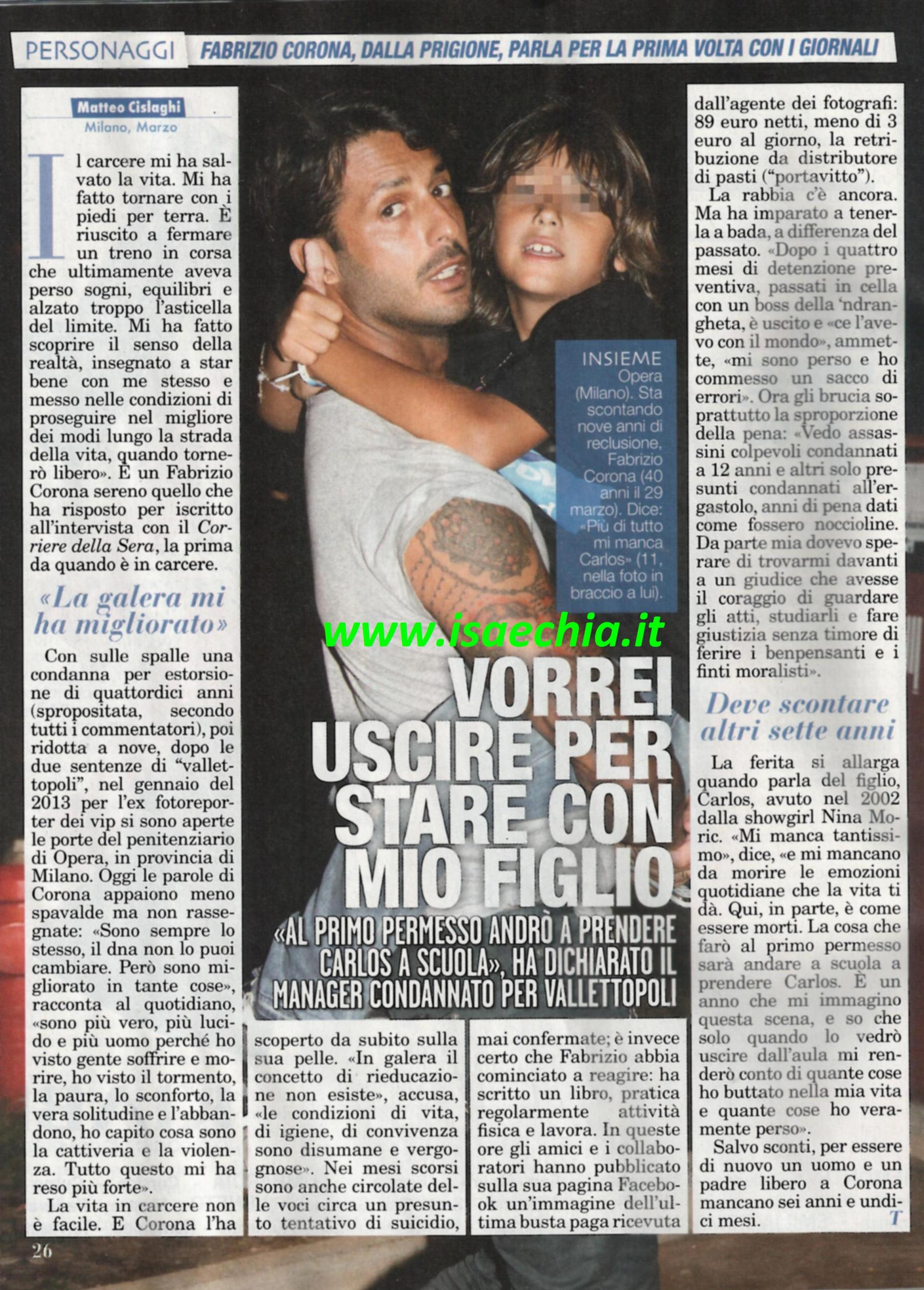 “Il carcere mi ha salvato la vita, mi ha fatto scoprire il senso della realtà, insegnato a star bene con me stesso e messo in condizione di proseguire nel modo migliore”. Questo è ciò che l’ex re dei paparazzi Fabrizio Corona ha scritto per il Corriere della Sera. La sua condanna da circa 14 anni è stata recentemente ridotta a 9, ma dopo le sentenze per il caso Vallettopoli, per lui si sono aperte le porte del carcere di sicurezza Opera di Milano. “Sono sempre lo stesso, il dna non si può cambiare. Sono più vero, più lucido e più uomo perché ho visto gente soffrire e morire, ho visto sconforto, solitudine, sconforto, solitudine e abbandono e ho capito cosa sono cattiveria e violenza. In galera il concetto di rieducazione non esiste. Le condizioni di igiene, di convivenza e di vita sono disumane” ha dichiarato lui, che dopo un periodo di depressione, ha reagito lavorando, anche se per soli 89 euro al mese. “Vedo assassini condannati a 12 anni e altri solo presunti condannati all’ergastolo. Dovevo sperare di trovare un giudice che guardasse tutti gli atti, li studiasse e facesse giustizia senza timore di ferire benpensanti e finti moralisti”. Ma la ferita si allarga quando si parla di suo figlio Carlos, avuto dall’ex naufraga Nina Moric: “Mi manca tantissimo. E mi mancano le emozioni quotidiane che la vita ti dà. Qua in parte è come essere morti. La prima cosa che farò sarà andare a scuola a prendere Carlos. E’ un anno che immagino questa scena: quando lo vedrò uscire da scuola mi renderò conto di quante cose mi sono perso nella mia vita”.