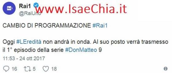 Fabrizio Frizzi – secondo quanto si apprende – è stato colto da un malore il 23 ottobre durante la registrazione della puntata de L’Eredità. Il conduttore, che è ora ricoverato, non comparirà quindi oggi martedì sui teleschermi di Rai1. La rete ha comunicato, infatti, che la puntata sarà sostituita da Don Matteo 9. Secondo le prime informazioni, non sarebbe in gravi condizioni.