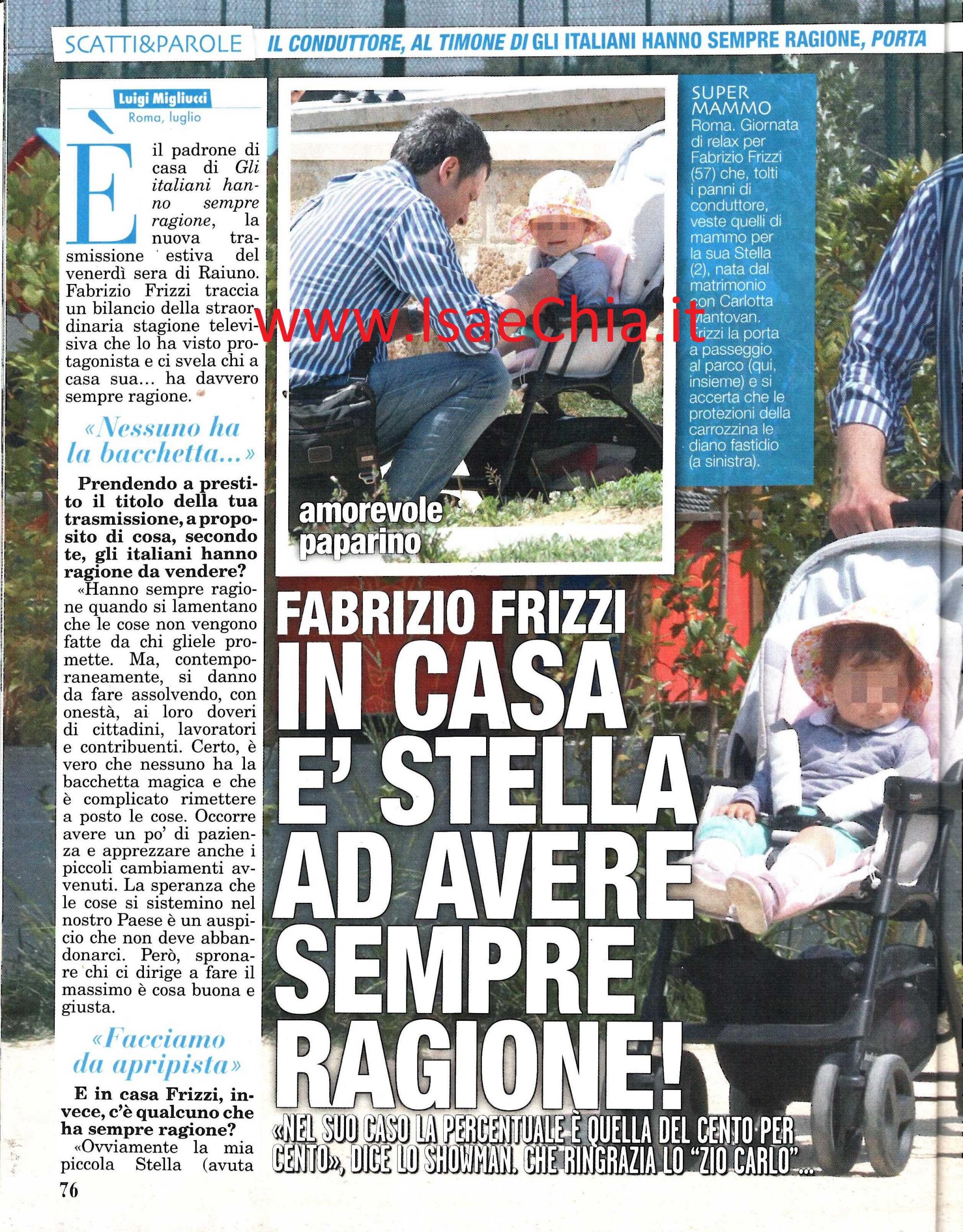 E’ il padrone di casa nel programma estivo di Raiuno, Gli Italiani hanno sempre ragione, e mentre si prepara a questa nuova avventura, Fabrizio Frizzi rivela chi è che ‘ha sempre ragione’ a casa sua! “Gli Italiani hanno sempre ragione quando si lamentano delle cose che sono state promesse e poi non fatte, perché si danno da fare come contribuenti. Certo, è vero che nessuno ha la bacchetta magica e che è complicato rimettere a posto le cose, occorre apprezzare anche i piccoli cambiamenti. La speranza che le cose migliorino non deve abbandonarci, però, spronare chi ci dirige a dare il massimo è cosa buona e giusta. A casa mia? Ovviamente a comandare è mia figlia Stella, che ha due anni. La percentuale, nel suo caso, è sempre del 100%!“. Quando gli si chiede della novità del suo show, ossia la partecipazione interattiva da parte del pubblico, Frizzi racconta: “Sì, attraverso un’applicazione i telespettatori possono rispondere con lo smartphone alle domande di cui discutiamo in studio. In più abbiamo sei gruppi di ascolto in collegamento che ci dicono la loro, oltre a tre coppie vip. E’ un modo divertente per analizzare il pensiero degli Italiani su certe tematiche. E’ un format su cui sta lavorando un po’ tutto il mondo, ma siamo noi i primi a mandarlo in onda“. E con questo, Fabrizio chiude una stagione televisiva molto intensa, con L’eredità prima e La posta del cuore con l’ex moglie Rita Dalla Chiesa poi: “Sì, devo dire grazie allo ‘zio’ Carlo Conti che mi ha offerto di condurre in staffetta con lui L’eredità e con lui condivido questo successo. La posta del cuore è stato un ottimo esperimento, un programma classico e tradizionale, forse perfino troppo elegante per i tempi che stiamo vivendo. Io però, personalmente non rincorro gli ascolti a ogni costo con qualcosa di forte e furbo. Siamo andati contro la soap Il segreto, che ha una forte forza mediatica e lo abbiamo fatto con grande dignità, conquistando ascolti apprezzabili“.