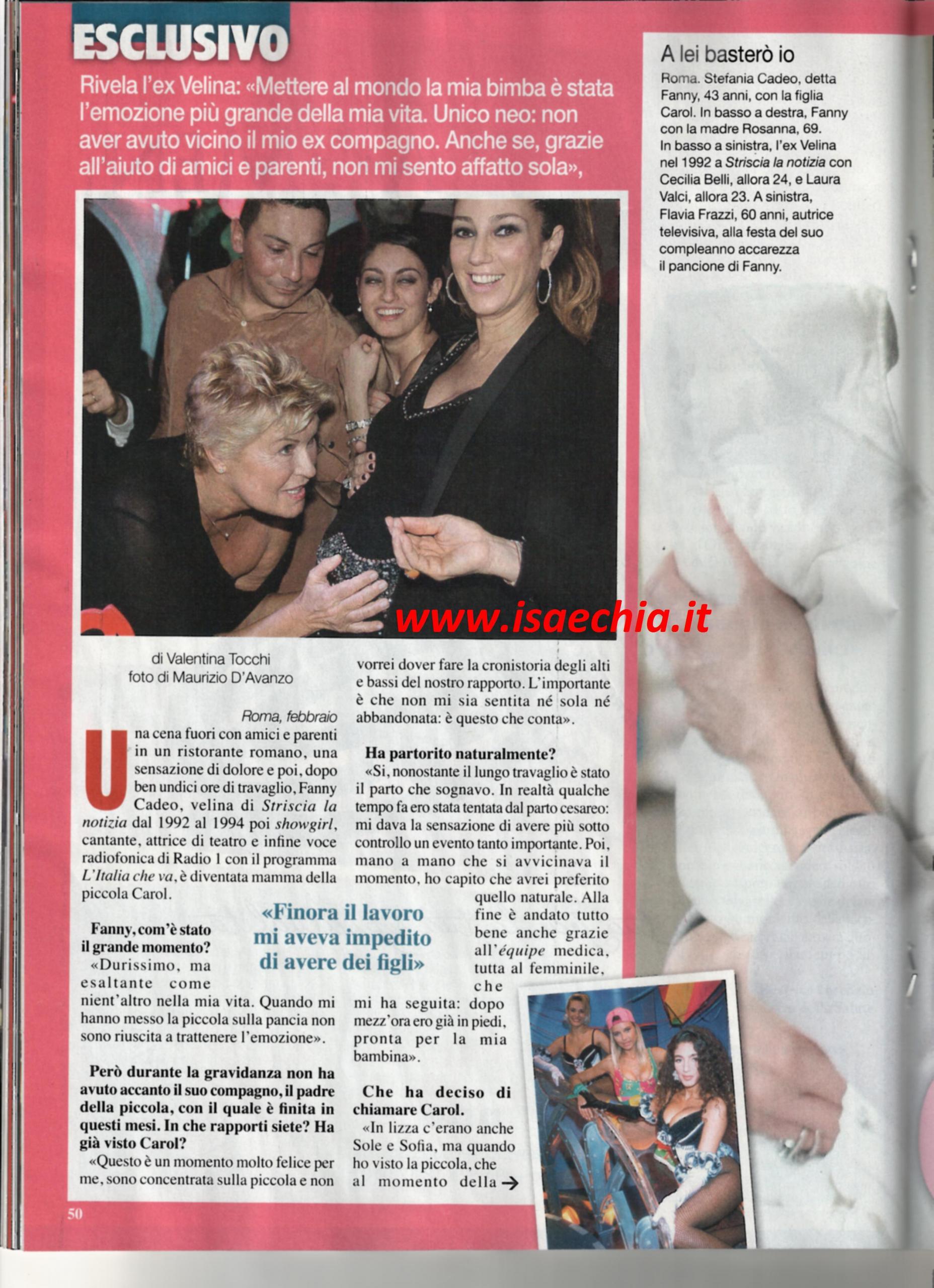 Fanny Cadeo, Velina a Striscia negli anni ’90, poi showgirl in tv, attrice teatrale e oggi speaker radio, è diventata mamma: “Il grande momento è stato durissimo, ma quando mi hanno messo Carol sulla pancia non sono riuscita a trattenere l’emozione”. Quando le si chiede del padre della piccola, che non è stato vicino a lei durante la gravidanza, risponde: “Questo è un momento felice per me, vorrei non dover fare la cronistoria dei miei alti e bassi con lui. L’importante è che non mi sia sentita abbandonata. Ho partorito naturalmente, che era ciò che sognavo. In realtà ero stata tentata dal cesareo, mi dava la sensazione di avere la situazione sotto controllo, ma poi ho capito che avrei preferito il parto naturale. Dopo mezz’ora ero già in piedi, pronta per la mia bambina. Per ora mi somiglia, è piena di capelli, sembrano una parrucca! Mia madre Rosanna è impazzita dalla gioia: io sono la sua unica figlia e Carol è la sua prima nipote. Io sognavo la maternità da quando ero giovanissima, ma i tempi non erano maturi. Consigliavo le mie amiche e le incitavo, ma nonostante abbia avuto storie lunghe, non è mai scattato il progetto maternità”.