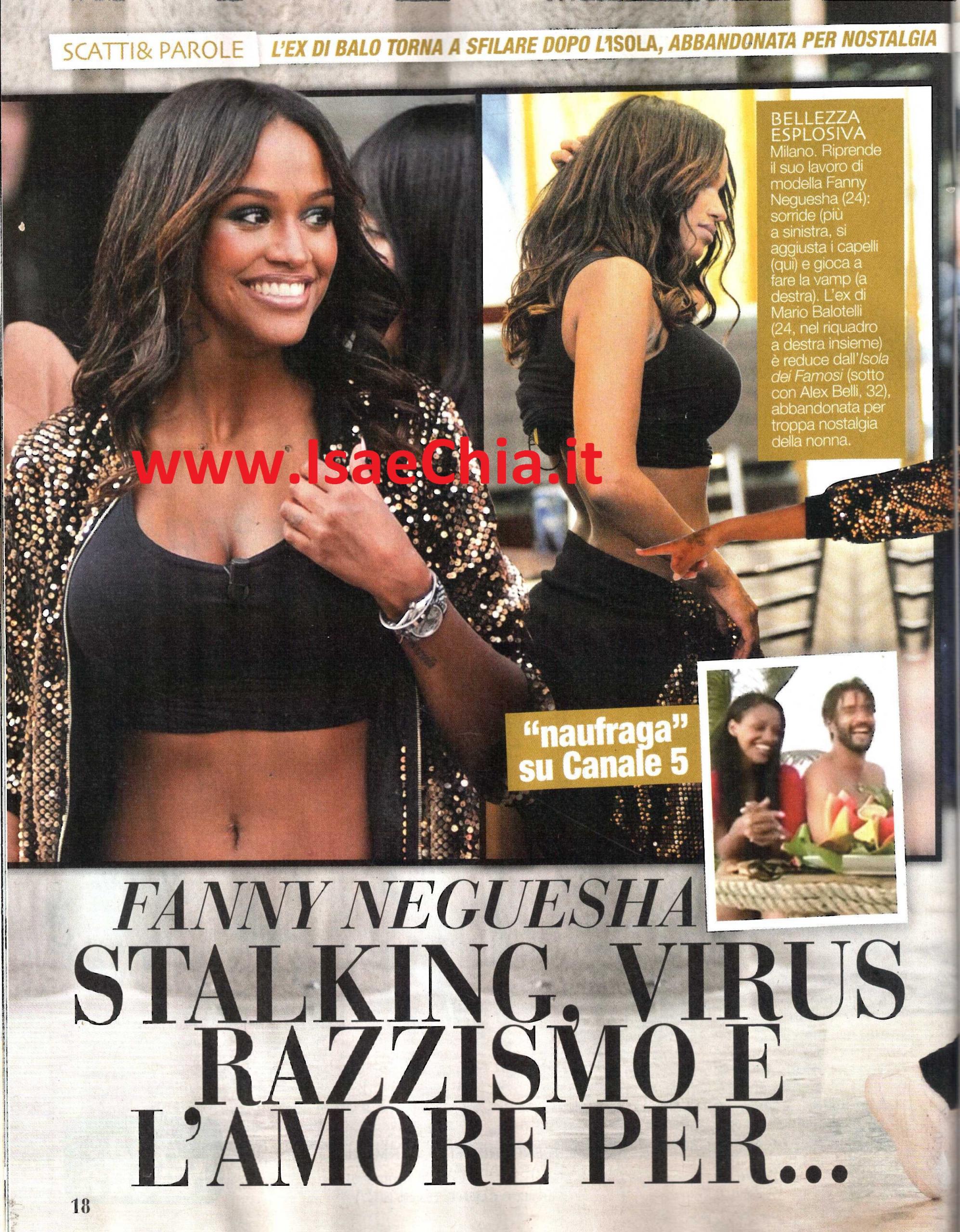 Non ce l’ha fatta, Fanny Neguesha, e a poche settimane dall’approdo sull’Isola dei famosi, ha deciso di abbandonare il reality. La bella ex fidanzata del calciatore Mario Balotelli, figlia di un vicentino e di una mamma metà congolese metà rwandese e poi cresciuta tra Italia e Francia, ha però stupito tutti resistendo a tutti gli uomini sull’Isola. Intervistata per la prima volta dal suo ritorno in Italia, Fanny racconta: “Il ritorno alla realtà è stato abbastanza traumatico. Sia fisicamente, perché mi portavo dietro gli strascichi di un brutto virus intestinale contratto proprio sull’Isola, sia psicologicamente, perché una volta uscita da quest’esperienza, sono cambiati ritmi, stili di vita e dinamiche“. Il motivo del suo abbandono? La mancanza della nonna: “Mia nonna è la persona che mi ha cresciuta da quando avevo 11 anni. Pochi giorni dopo esser tornata in Italia, sono andata in Belgio da lei. Le ho detto che le voglio molto bene e che mi era mancata, ovviamente. Mio padre l’ho perso quando ero piccola, con mia madre ho un rapporto stupendo“. Quando le si chiede se è mai stata vittima di episodi di razzismo e si è mai sentita brutta, Fanny risponde: “Mi è capitato solo quando ero in Africa ed ero molto piccola, poi mai più. La bellezza? Ognuno ha i propri difetti, bisogna solo imparare a conviverci“. Infine, quando le si chiede della situazione sentimentale e se conferma il chiacchierato con flirt con il naufrago Andrea Montovoli, risponde: “E’ solo un amico, niente di più” mentre quando le si fa notare che in Italia, e non solo, viene soprattutto associata a Balotelli, lei ribatte: “Ormai non ci faccio neanche più caso!“.