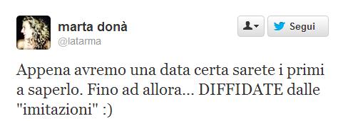 A questo punto, attendiamo la ciliegina sulla torta: un intervento televisivo per promuovere il disco “… io ci sono”. Sarebbe un’ottima occasione per riproporsi al grande pubblico a poche settimane della inizio del Festival di Sanremo 2013, a cui il Mengoni dovrebbe partecipare (continuo ad usare i condizionali più per scaramanzia, che per altro)! Ovviamente, le voci sul Festival che si rincorrono da settimane lasciano presagire un’uscita imminente del nuovo album. A questi rumor, la manager “di ferro” Marta Donà ha risposto direttamente su Twitter:
