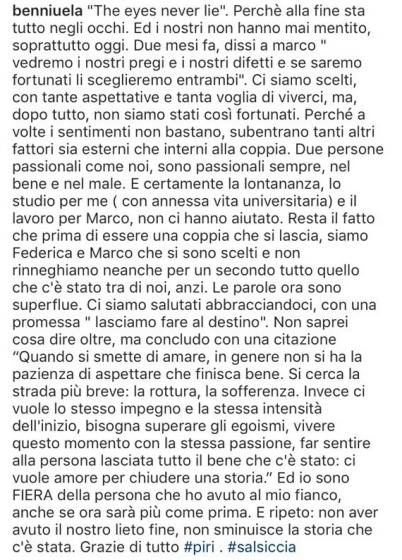 “Ci siamo scelti, con tante aspettative e tanta voglia di viverci, ma, dopo tutto, non siamo stati così fortunati. Perché a volte i sentimenti non bastano, subentrano tanti altri fattori sia esterni che interni alla coppia“, ha scritto l’ex corteggiatrice sui social network, “Due persone passionali come noi, sono passionali sempre, nel bene e nel male. E certamente la lontananza, lo studio per me (con annessa vita universitaria) e il lavoro per Marco, non ci hanno aiutato. Resta il fatto che prima di essere una coppia che si lascia, siamo Federica e Marco che si sono scelti e non rinneghiamo neanche per un secondo tutto quello che c’è stato tra di noi, anzi. Le parole ora sono superflue. Ci siamo salutati abbracciandoci, con una promessa ‘lasciamo fare al destino’.”.