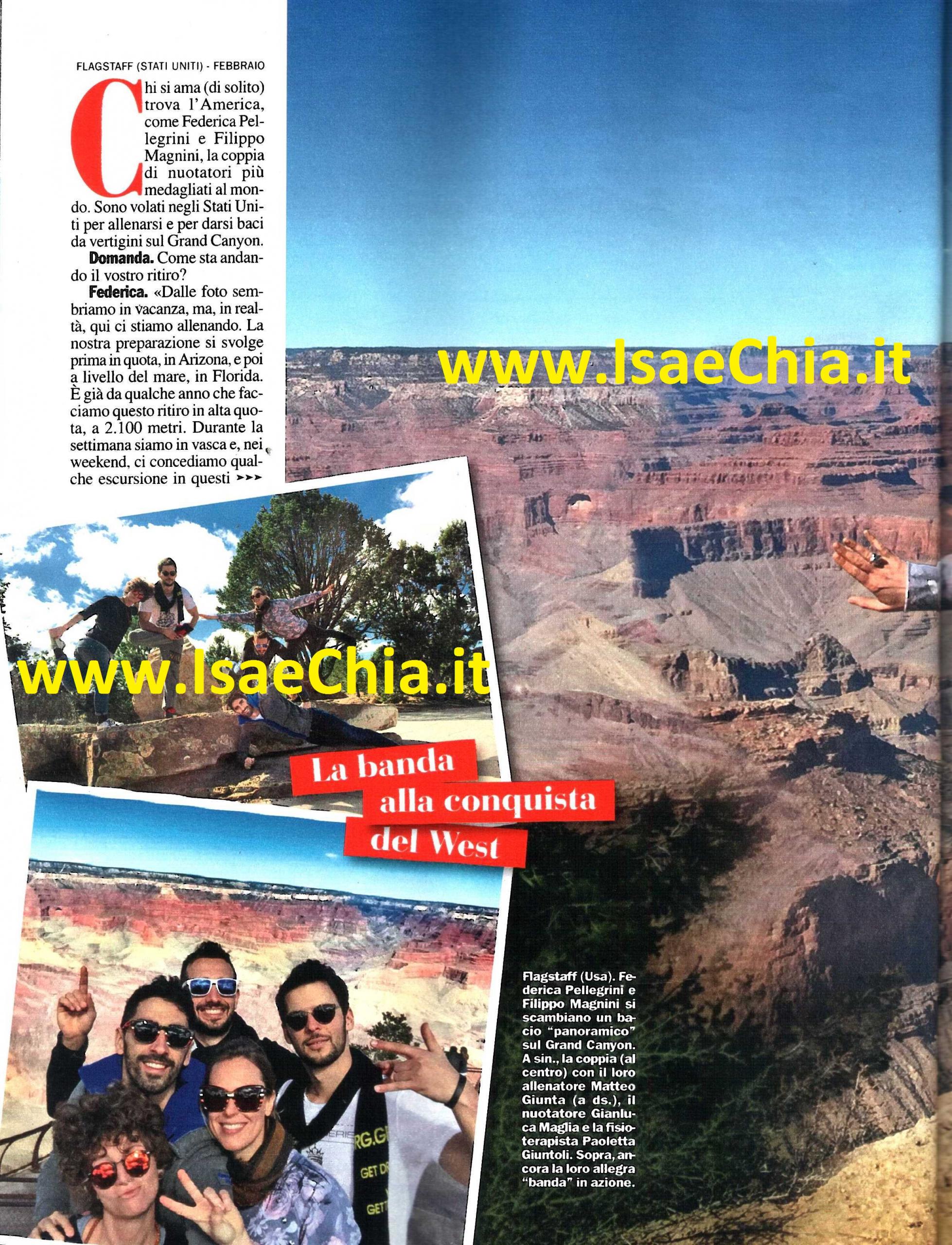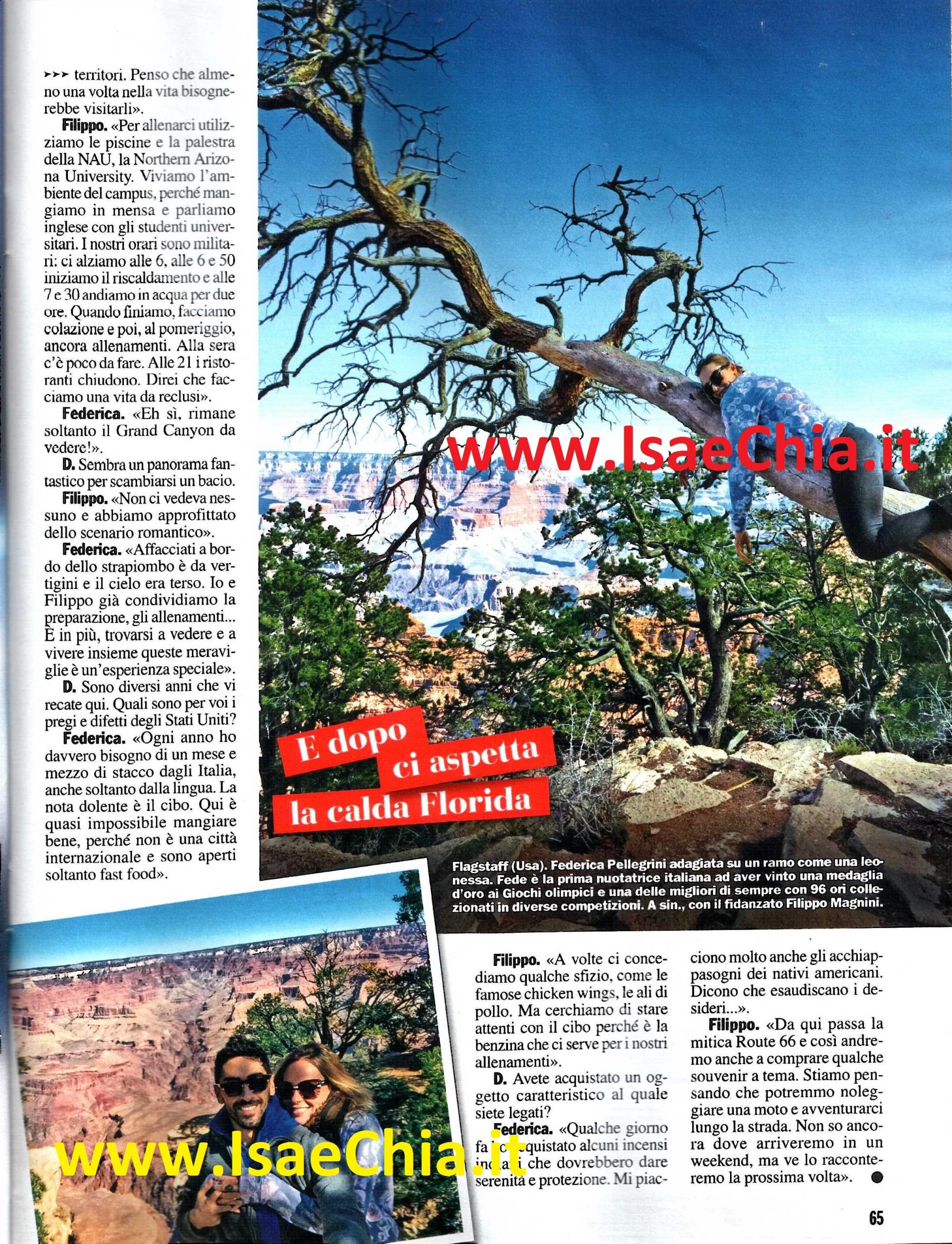 La coppia di nuotatori più medagliati al mondo, Federica Pellegrini e Filippo Magnini, sono volati negli Stati Uniti per allenarsi…e non solo: “Dalle foto sembriamo in vacanza, ma in realtà ci stiamo allenando” dice lei. “La nostra preparazione si svolge in alta quota, in Arizona, e poi a livello del mare, in Florida. E’ già da qualche anno che facciamo questo ritiro ad alta quota a 2100 metri. Durante la settimana siamo in vasca e nel weekend ci concediamo qualche escursione; usiamo le piscine della Northern Arizona University, viviamo l’ambiente del campus, mangiamo in mensa e parliamo inglese con gli studenti. Ci alziamo alle 6, alle 6.50 riscaldamento e alle 7.30 in acqua per due ore. Poi pranzo e ancora in acqua. Qui alle 21 è tutto chiuso: facciamo una vita da reclusi! Ogni tanto ho bisogno di un mese e mezzo di distacco dall’Italia, anche solo per la lingua. La nota dolente è il cibo: qua è quasi impossibile mangiare bene, è una città internazionale e sono aperti solo fast food!“. E qui Filippo confessa: “A volte ci concediamo qualche sfizio, come le chicken wings, le ali di pollo, ma cerchiamo di stare attenti al cibo, che è la benzina per i nostri allenamenti“. Infine, quando si chiede loro quali souvenir prenderanno rispondono: “Qualche giorno fa ho preso degli incensi indiani, ma mi piacciono anche gli acchiappasogni dei nativi americani” dice lei, mentre lui aggiunge: “Da qui passa la mitica Route 66, così andremo a comprare qualche souvenir a tema. Stiamo pensando di noleggiare una moto e avventurarci lungo la strada. Non so dove arriveremo in un weekend, potremmo dirvelo la prossima volta!“