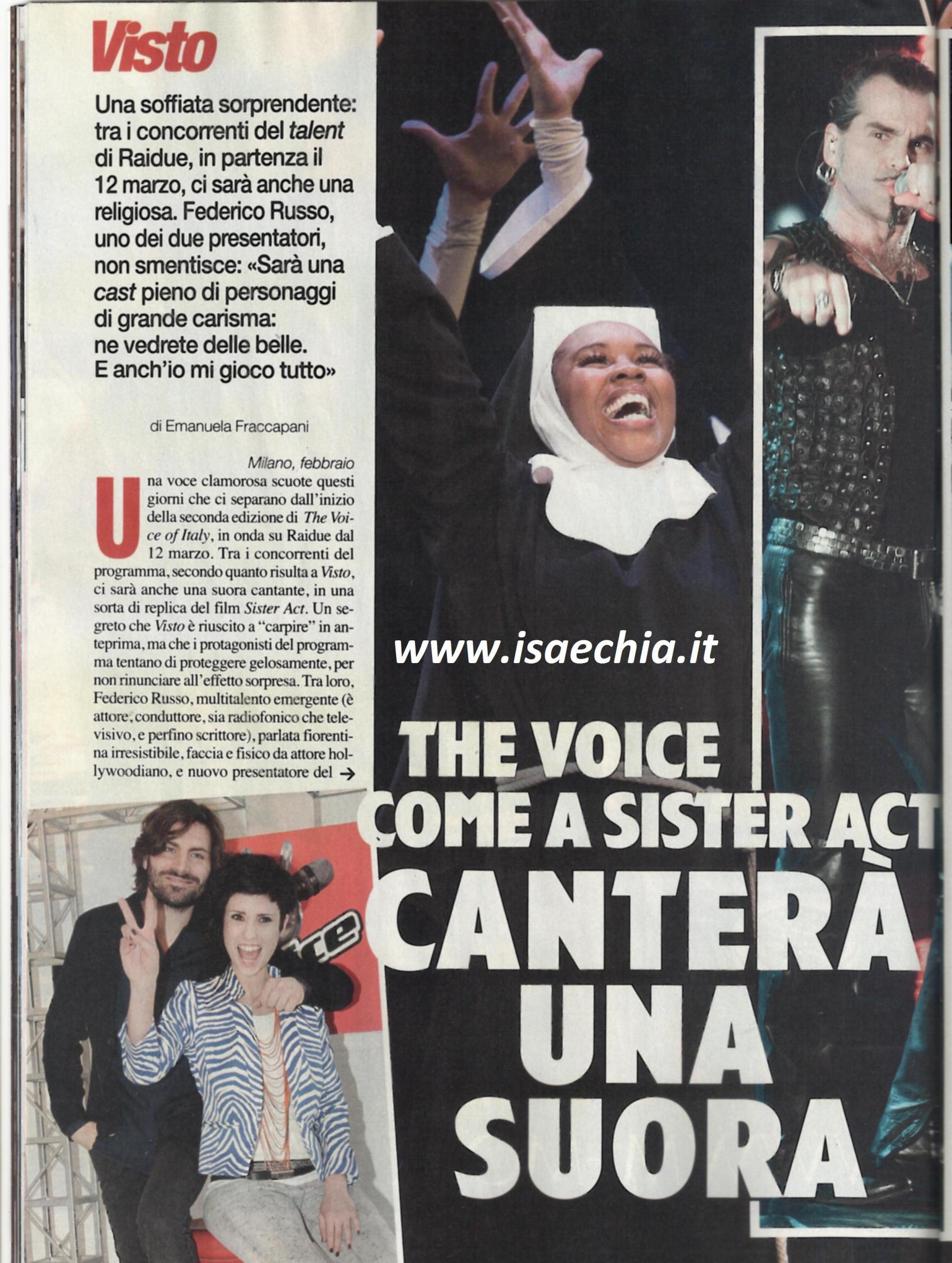Una voce clamorosa scuote in questi giorni ci separa dalla nuova edizione di The Voice of Italy: tra i concorrenti ci sarebbe una suora cantante, un po’ come nel film Sister Act. Il nuovo conduttore Federico Russo dichiara: “Ciò che posso rivelare è che il livello musicale e di preparazione è davvero molto alto. Ho assistito a qualche provino e sono rimasto a bocca aperta. Non posso parlare del cast neanche sotto tortura, ma ci sono quattro o cinque concorrenti che oltre a cantanti, sono anche personaggi incredibili. Cosa ci faccio a The Voice? Ho fatto il mio regolare provino e fra tutti hanno voluto proprio me, spero perché mi ritengono all’altezza. E’ un’opportunità arrivata dopo un percorso che non poteva portarmi che qui. Credo fosse proprio destino, perché fra le tante cose che faccio, fare il conduttore è quella che mi sta meglio addosso, anche se l’ho fatto principalmente in radio. Non posso negare che la fisicità conta e che il fatto di non essere uno sgorbio abbia avuto la sua importanza, ma conta la capacità professionale. Credo di avere un modo di condurre personale, piuttosto riconoscibile, almeno così dicono. Punterò su me stesso e la spontaneità. Con me ci sarà Valentina Correani: viene dalla radio e la conosco da tempo. Si occuperà principalmente del backstage, del web e delle interviste a concorrenti e ospiti. Se dovessi scegliere uno della giuria come capitano, non saprei chi scegliere. Non per essere diplomatico, ma perché tutti e quattro meritano”. Quando gli si chiede della situazione sentimentale, rivela: “Sono single da un annetto; devo provare sentimenti forti per avere una relazione: non sono uno che per non stare da solo, si accontenta di una storiella. Ho voglia di innamorarmi, da morire, ma ho paura di vivere certe tappe terribili in un rapporto. Quando vedo coppie che mangiano senza parlare, mi viene l’ansia: ci sono passato e non voglio che capiti ancora. Sono fedelissimo e se sto con una donna è come se mi ammanettassi. Sono un attaccante mancato e un cantante mancato: ho partecipato a Operazione trionfo, talent con Miguel Bosé. Però sono sconfitte che mi hanno fatto diventare più forte”.