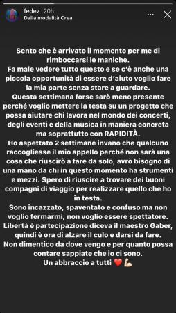 In prima linea, dopo le parole di Conte è sceso subito Fedez, che si è reso sempre disponibile nel corso di questi mesi e non solo a sostenere progetti e campagne per chi era maggiormente in difficoltà, e ancora una volta non sembra avere alcuna intenzione di tirarsi indietro. Il rapper, visto l’evolversi della situazione soprattutto a discapito di alcune categorie di lavoratori, ha spiegato di avere in mente un progetto proprio per chi lavora nell’ambito dei concerti e degli spettacoli dal vivo: “Sento che è arrivato il momento per me di rimboccarsi le maniche. Fa male vedere tutto questo e se c’è anche una piccola opportunità di essere d’aiuto voglio fare la mia parte senza stare a guardare. Questa settimana forse sarò meno presente perché voglio mettere la testa su un progetto che possa aiutare chi lavora nel mondo dei concerti, degli eventi e della musica in maniera concreta ma soprattutto con rapidità. Ho aspettato due settimane invano che qualcuno raccogliesse il mio appello perché non sarà una cosa che riuscirò a fare da solo, avrò bisogno di una mano da chi in questo momento ha strumenti e mezzi. Spero di riuscire a trovare dei buoni compagni di viaggio per realizzare quello che ho in testa”.