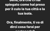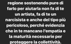 Contribuire ad alzare il livello di rischio sanitario di una regione sostenendo pure di farlo per aiutarla non fa di te un artista. Fa di te un narcisista e anche del tipo più pericoloso. Perché evidenzia che in te mancano l’empatia e la maturità necessarie per proteggere la collettività. Prenditi le tue responsabilità, sei adulto e vaccinato (spero). Bene, ora che ci hai spiegato come hai preso per il culo la tua città e la tua isola, ora finalmente, ti va dirci cosa farai per sostenerla?