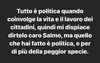 Non mi ha stupito che tu non abbia rispettato le regole, mi ha stupito che tu non abbia rispettato le persone. Tutto è politica quando coinvolge la vita e il lavoro dei cittadini, quindi mi dispiace dirtelo caro Salmo, ma quello che hai fatto è politica, e per di più della peggior specie. Se dopo che hai compiuto 18 anni, ti senti ancora in dovere di fare cagate solo perché le fanno anche gli altri è molto grave. Visto che ti chiedi se stai discutendo con un artista o con un politico, ti rispondo: stai discutendo con un adulto.