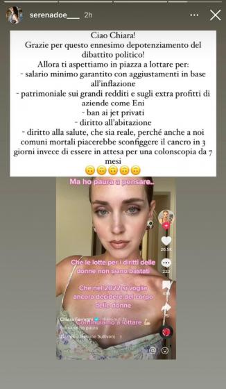 Ciao Chiara! Grazie per questo ennesimo depotenziamento del dibattito politico! Allora ti aspettiamo in piazza a lottare per: Salario minimo garantito con aggiustamenti in base all’inflazione. Patrimoniale sui grandi redditi e sugli extra profitti di aziende come Eni. Ban ai jet. Diritto all’abitazione. Diritto alla salute, che sia reale, perché anche a noi comuni mortali piacerebbe sconfiggere il cancro in 3 giorni invece di essere in attesa per una colonscopia da 7 mesi.