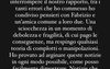 Quando Angelica ha deciso di interrompere il nostro rapporto, tra i tanti errori che ho commesso, ho condiviso pensieri con Fabrizio e un’amica comune a loro due. Una sciocchezza in un momento di debolezza e fragilità, di cui pago le conseguenze. Ma respingo qualsiasi teoria di complotti o manipolazioni. Ho provato ad arginare queste notizie in ogni modo possibile, come posso facilmente dimostrare. Notizie che per altro mi danneggiano, farei notare.