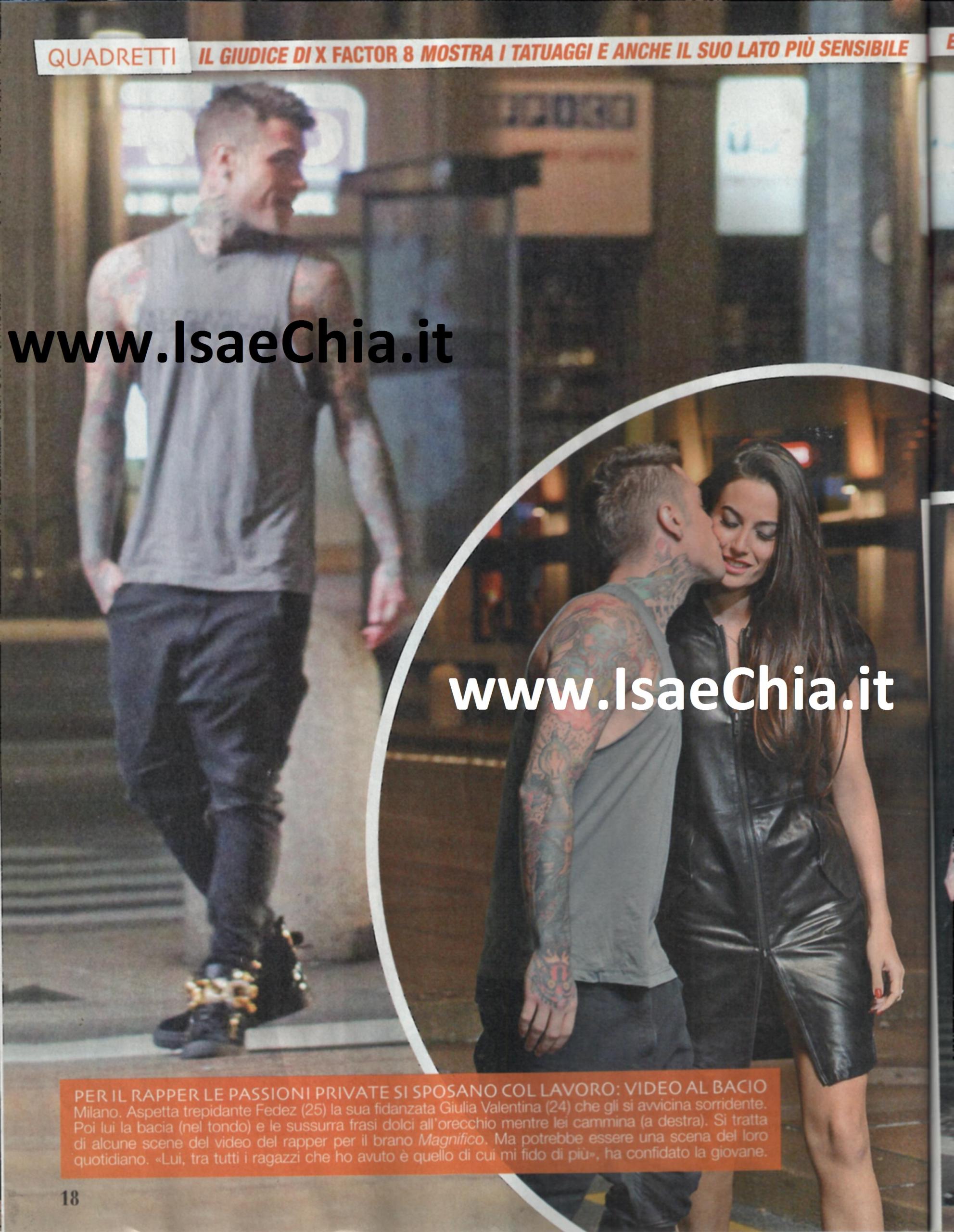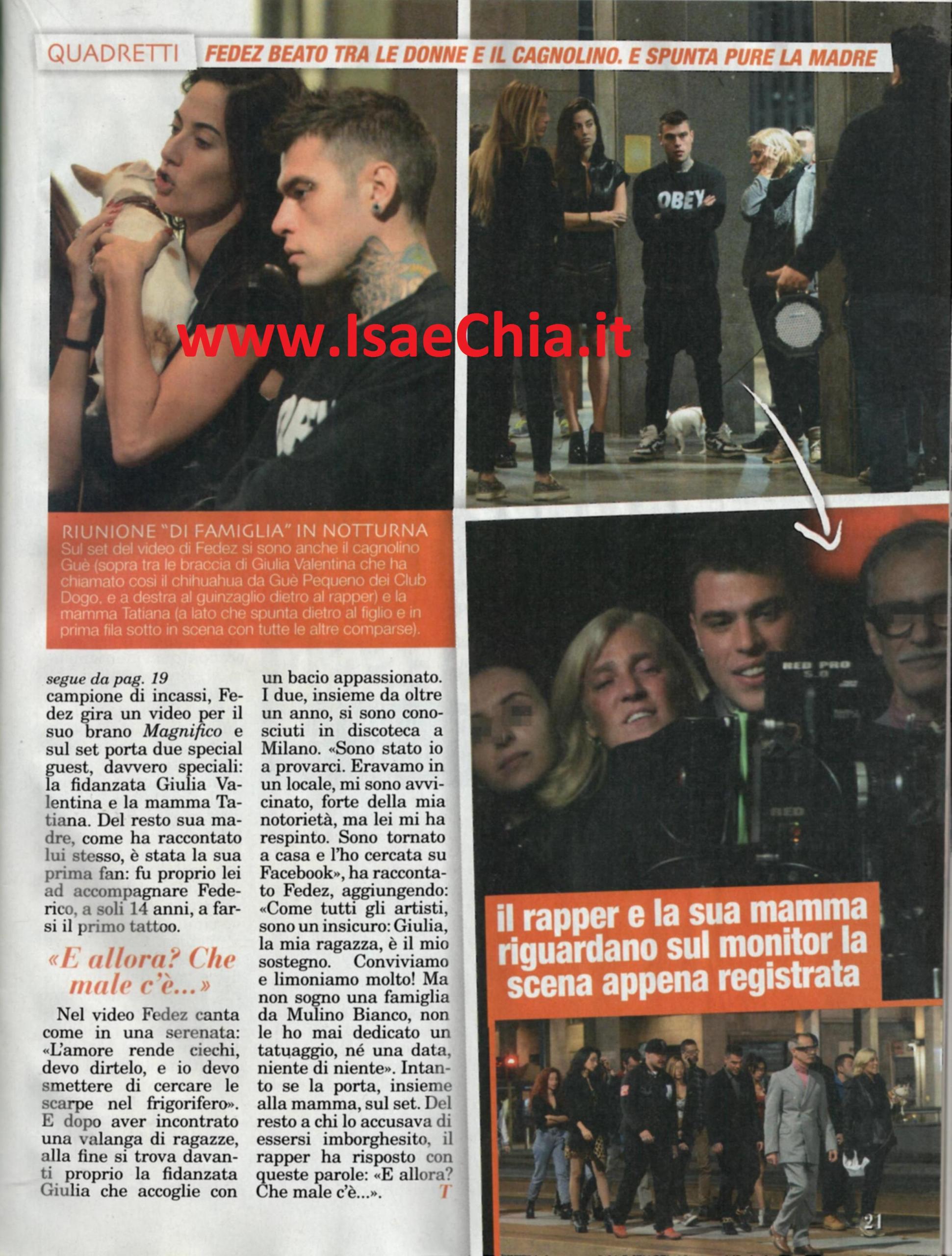 Mentre Morgan fa discutere per aver dichiarato (ancora una volta) di voler abbandonare per sempre X Factor, a fare spettacolo ci pensa un altro giurato del talent, Fedez. Questa volta, il rapper, anziché mostrare il suo lato ribelle, stupisce esibendo quello sensibile: basta guardare le immagini catturate dai fotografi di Top per scoprire un suo lato inedito. Federico Leonardo Lucia (questo è il suo vero nome) sta girando, infatti, il video per il suo nuovo singolo, Magnifico, cantato in coppia con la vincitrice di X Factor Francesca Michielin, che è già in cima alle classifiche. E sul set del video ci sono ben due special guest: la sua fidanzata Giulia Valentina e la signora Tatiana, mamma di Fedez, sua prima fan e la stessa che lo accompagnò a fare il primo tattoo a 14 anni. Con Giulia,invece, si è incontrato in una discoteca di Milano: “Sono stato io a provarci: mi sono avvicinato, forte della mia notorietà, ma lei mi ha respinto. Sono tornato a casa e l’ho cercata su Facebook. Come tutti gli artisti, sono un insicuro. Giulia è il mio sostegno. Conviviamo e limoniamo molto. Ma non sogno una famiglia della Mulino bianco: a lei non ho mai dedicato un tatuaggio né una data, niente di niente”. A volte, però, ci sono altri gesti che contano di più…Tipo presentarla alla mamma!
