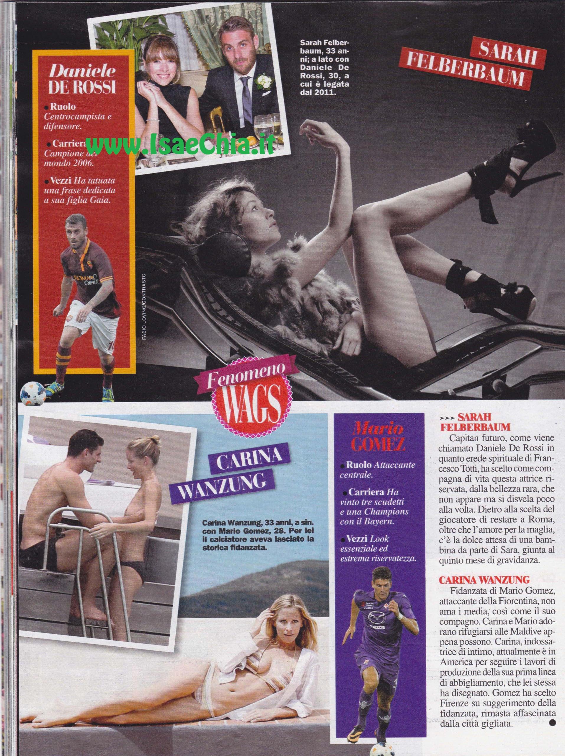 Ma passiamo ora all’ex Velina Federica Nargi, fidanzata con Alessandro Matri: “Non posso negare che essere fidanzata con un calciatore mi abbia dato visibilità, ma non è sufficiente per una carriera!” spiega lei. E come lei la collega Costanza Caracciolo è fidanzata con Alessandro Fogacci: “Le Wags sono le fidanzate dei calciatori di serie A, il mio gioca in serie C, quindi non rientro nella categoria! Tuttavia, credo che l’importante nella vita sia avere una propria identità a prescindere dall’appartenenza a gruppi o categorie”. Tra le altre ci sono poi Fanny Neguesha, attuale fidanzata di Mario Balotelli, Madalina Ghenea, ripresa con Marco Borriello in discoteca, la conduttrice Silvia Hsieh, fidanzata di Alessandro Diamanti; Antonella Mosetti, fidanzata col calciatore della Salernitana Matteo Guazzo; Cristina De Pin, fidanzata di Riccardo Montolivo; Michela Quattrociocche, sposata con Alberto Aquilani e la ballerina Eleonora Abbagnato (tra i coach di Amici), moglie di Federico Balzaretti: “Io sono una étoile-wags! Piuttosto chiedete a lui cosa significa essere mio marito!” scherza lei, che precisa: “Gli status e le classificazioni non ci appartengono”.