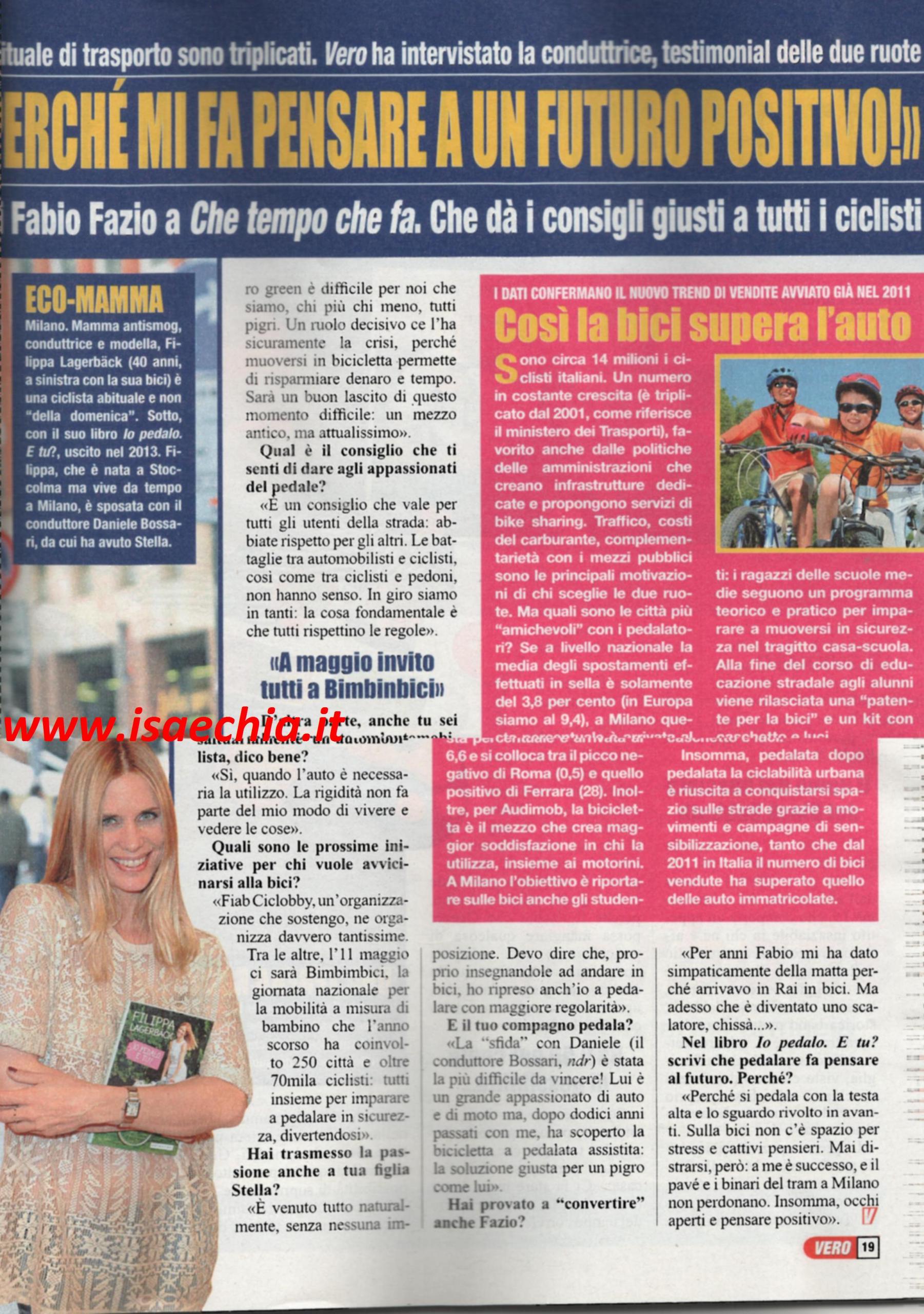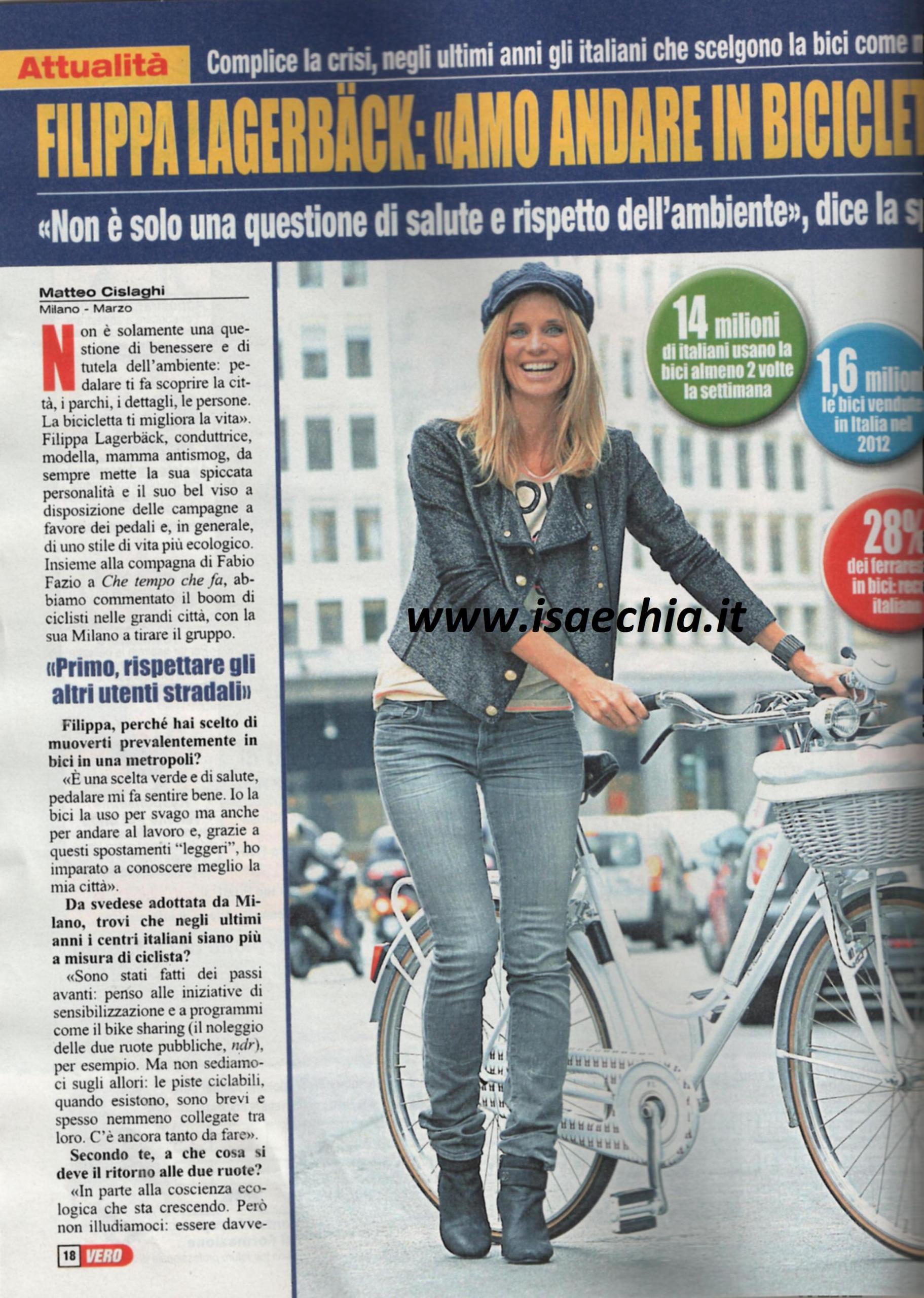 La bella Filippa Lagerbäck è da anni al fianco di Fabio Fazio a Che tempo che fa e si è messa a disposizione per delle campagne a favore dell’uso della bicicletta in città: “E’ una scelta verde e di salute. Pedalare mi fa sentire bene. Uso la bici per svago ma anche per andare a lavoro e grazie ad essa ho imparato a conoscere meglio la mia città. Sono stati fatti grandi passi avanti, come il bike sharing (il noleggo di biciclette pubbliche), ma le piste ciclabili, quando esistono, sono spesso brevi e non collegate. La coscienza ecologica sta aumentando, ma non illudiamoci: essere verdi è davvero difficili per noi, che siamo davvero pigri. Un ruolo decisivo ce l’ha la crisi: la bici permette di risparmiare sia denaro che tempo! Il mio consiglio? Abbiate rispetto per gli altri: le battaglie automobilisti-ciclisti-pedoni non hanno senso. In giro siamo tanti ed è fondamentale che ognuno rispetti le regole. Io stessa uso l’auto, quando è necessario! Ho trasmesso le mie idee in modo naturale anche a mia figlia Stella, senza nessuna imposizione. La sfida col mio compagno Daniele Bossari è stata più difficile da vincere! Lui è un appassionato di auto e di moto, ma dopo 12 anni con me ha scoperto la bici a pedalata assistita: la soluzione giusta per lui! Per anni Fazio mi ha dato della matta perché arrivando alla Rai in bici, ma adesso che è diventato uno scalatore, chissà…”.