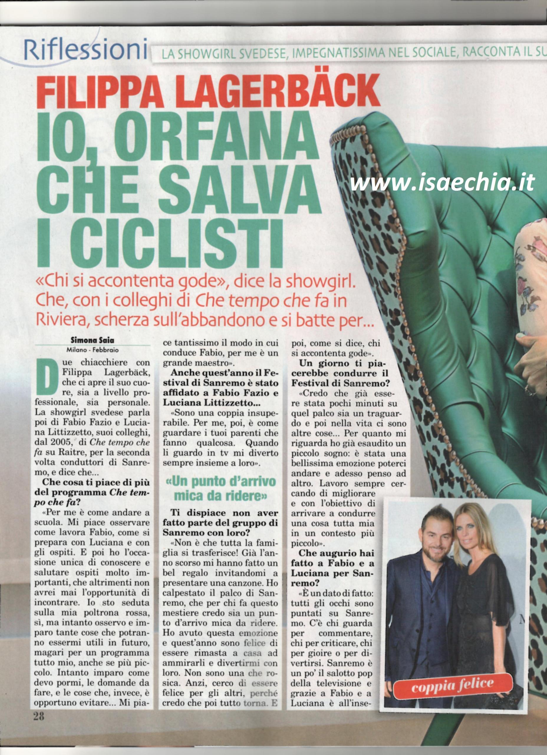 Filippa Lagerbäck parla dei suoi colleghi di Che tempo che fa, Fabio Fazio e Luciana Littizzetto, che hanno condotto il Festival di Sanremo: “Sono una coppia insuperabile. Per me è come guardare i tuoi parenti che fanno qualcosa: quando li guardo in tv mi diverto sempre con loro. Per me essere a Che tempo che fa è come andare a scuola. Mi piace osservare come lavora Fabio e ho l’occasione di conoscere molti ospiti. Imparo come pormi, le domande da fare e quali evitare”. Quando le si chiede se le è dispiaciuto non essere con loro a Sanremo, dice: “Non è tutta la famiglia che si trasferisce! Già l’anno scorso mi hanno fatto un bel regalo facendomi cantare un pezzo. Tutti gli occhi sono puntati su Sanremo, c’è chi lo guarda per criticare, chi per divertirsi. E’ il salotto pop della tv e grazie a Fabio e Luciana è all’insegna della qualità. Io ho detto loro di divertirsi il più possibile. Una cosa che mi sta a cuore è l’ecologia: mi impegno per promuovere l’uso della bicicletta e continuerò a impegnarmi con Ciclobby per la sicurezza dei ciclisti in città. Sono molto attiva anche con un’Onlus che mi ha portata in Africa per combattere le disabilità fisiche e infine mi occupo del mio blog, dedicato a moda, lifestyle e tematiche green. Fino a maggio sarò in tv con Fazio, poi ho altri progetti, ma niente di firmato. Mi piacerebbe condurre programmi come That’s Italia, che ho fatto l’anno scorso: potrei riproporlo anche su reti minori”. Infine, circa il suo rapporto con Daniele Bossari, dice: “Ci tengono uniti l’amore, il rispetto, il fatto di fare lo stesso lavoro. Cerchiamo di alternarci col lavoro per stare con nostra figlia Stella. Ci sono complicità, lealtà, amicizia, amore, quindi anche divertimento. E’ un rapporto che dura perché si basa sul dialogo”.