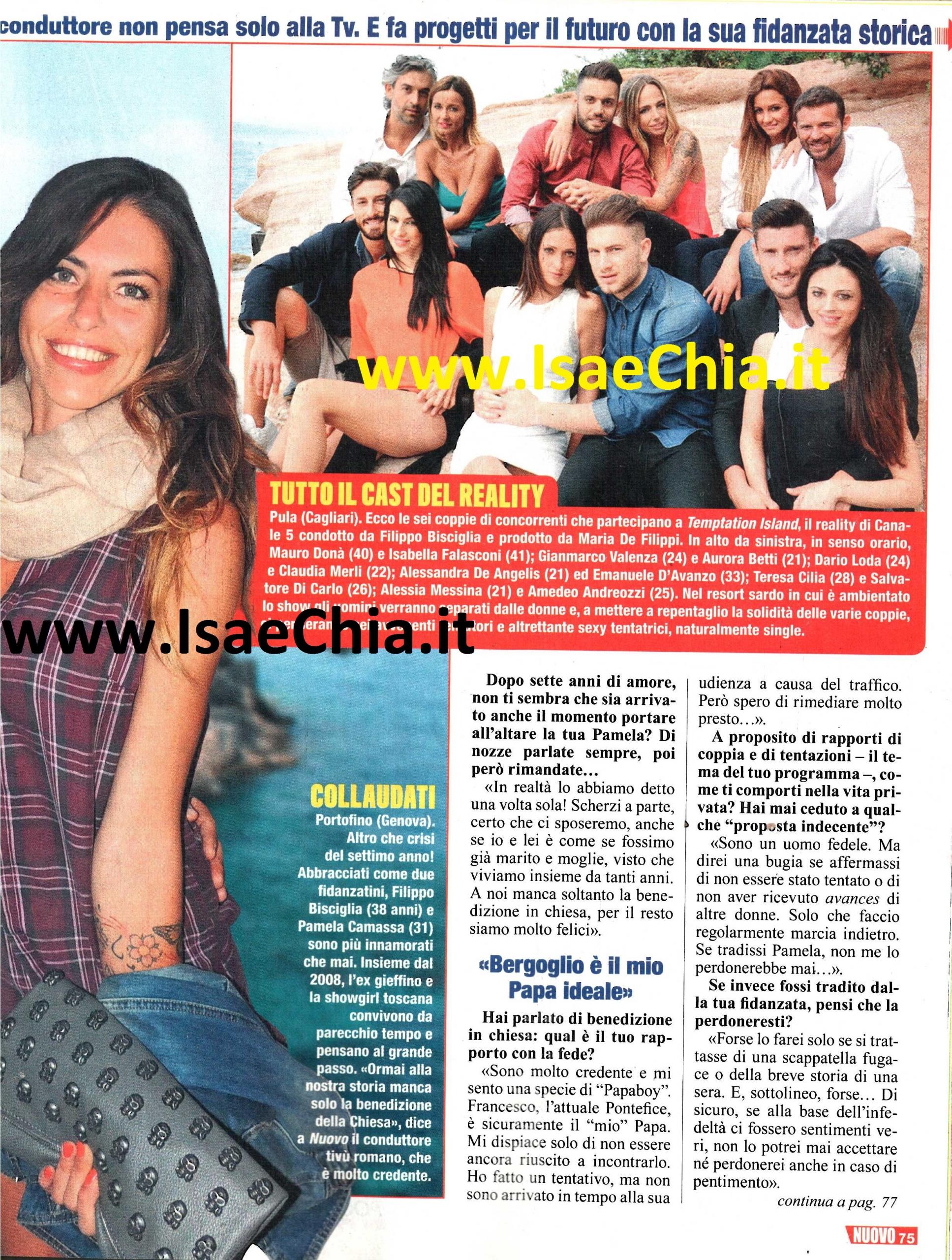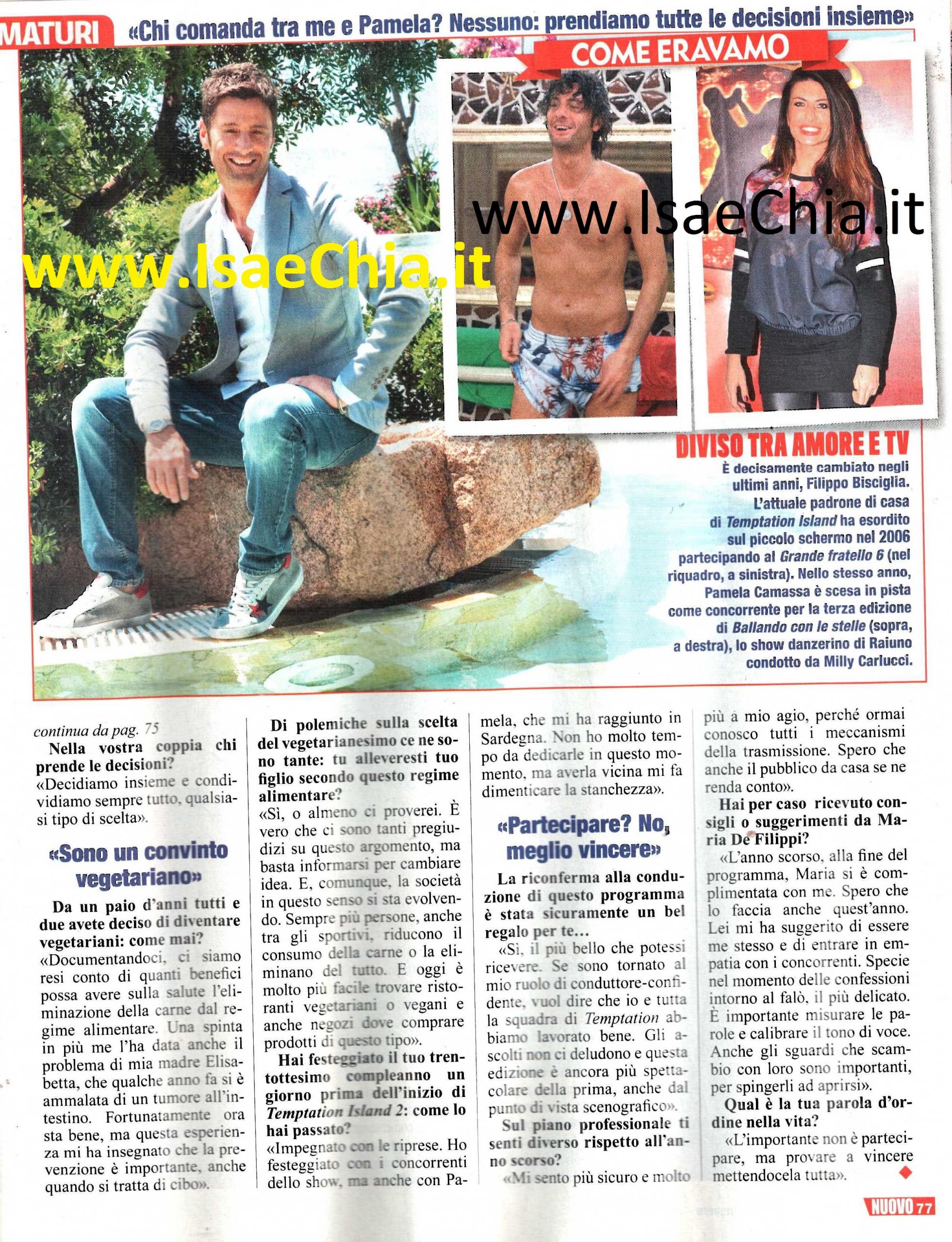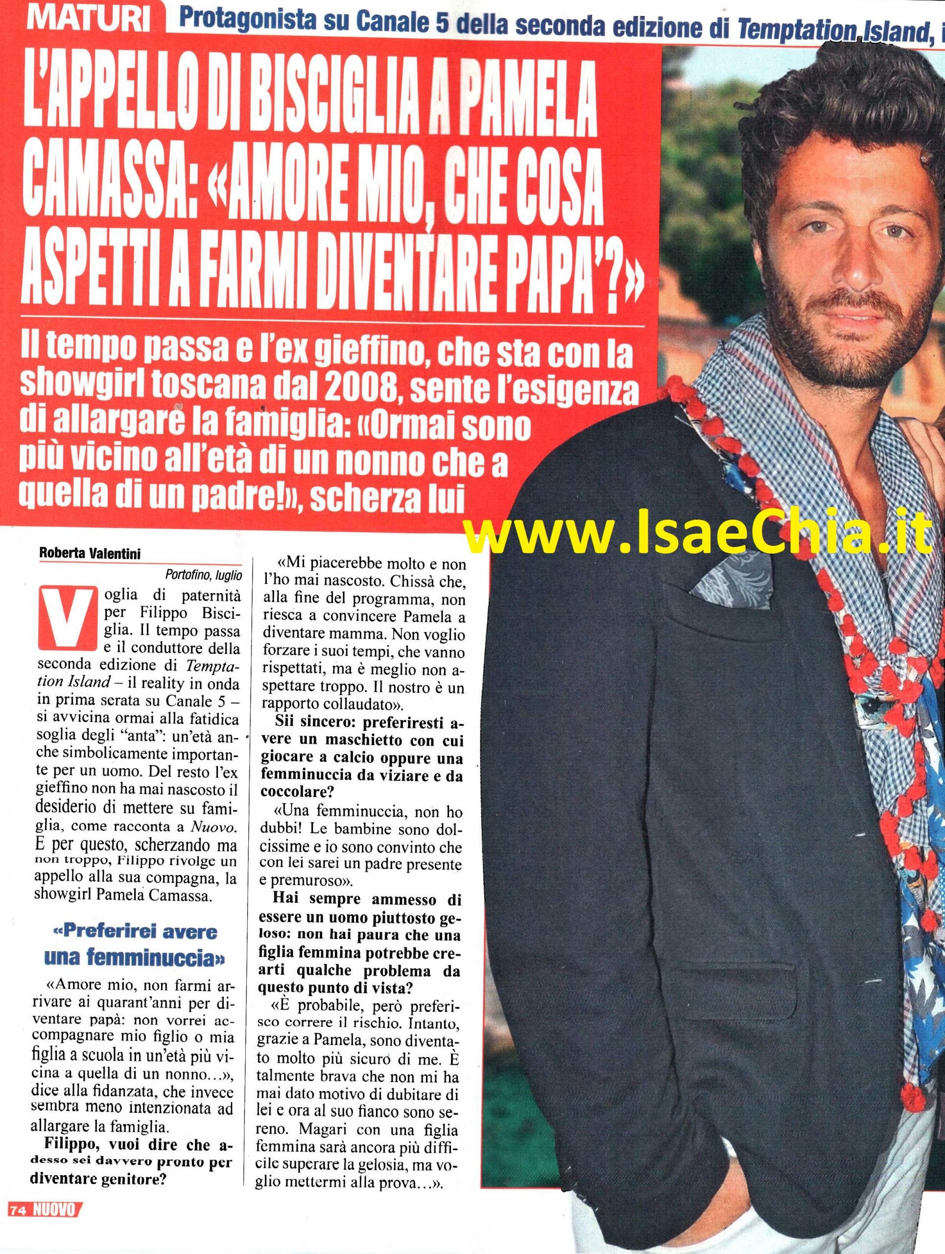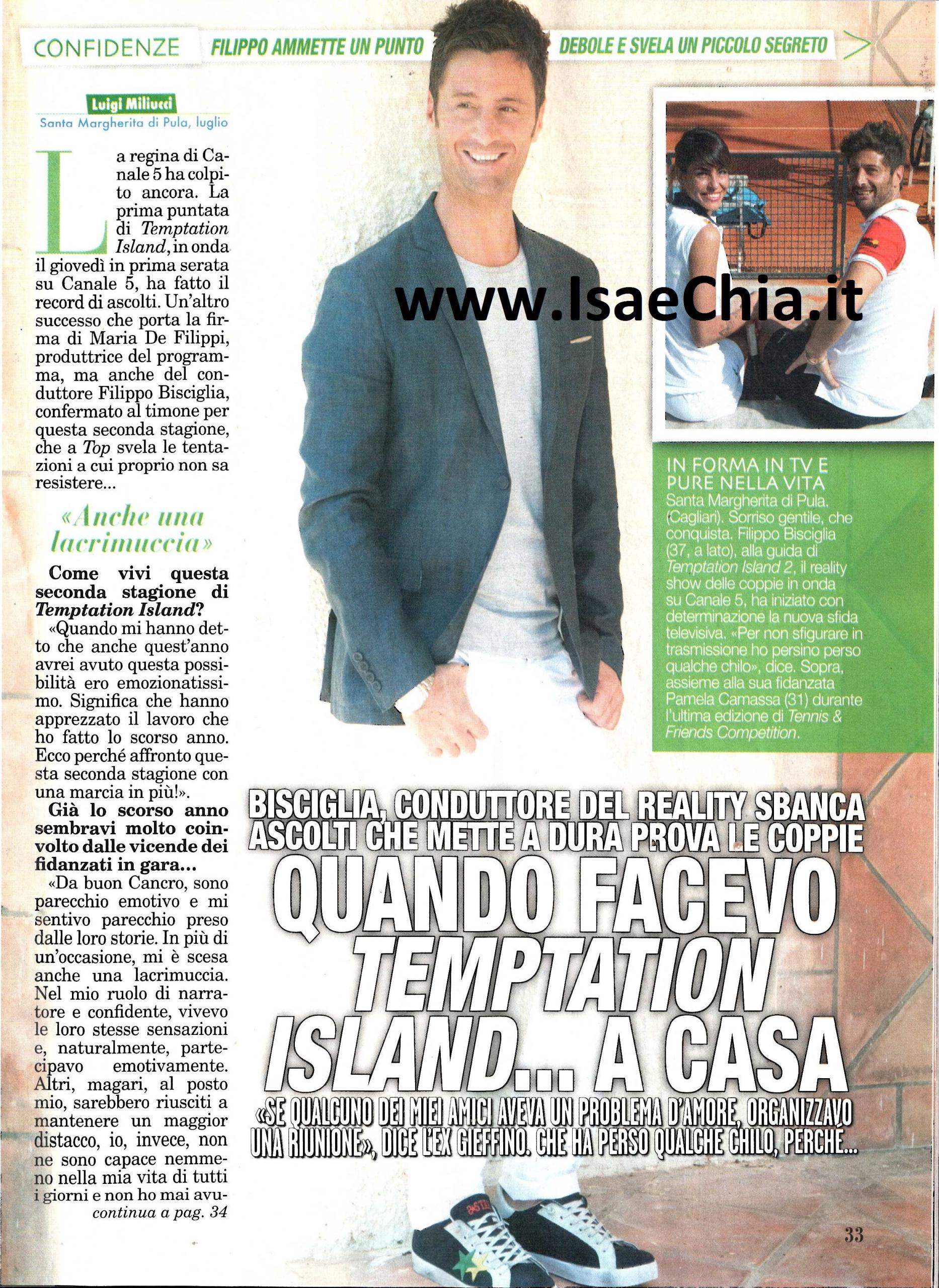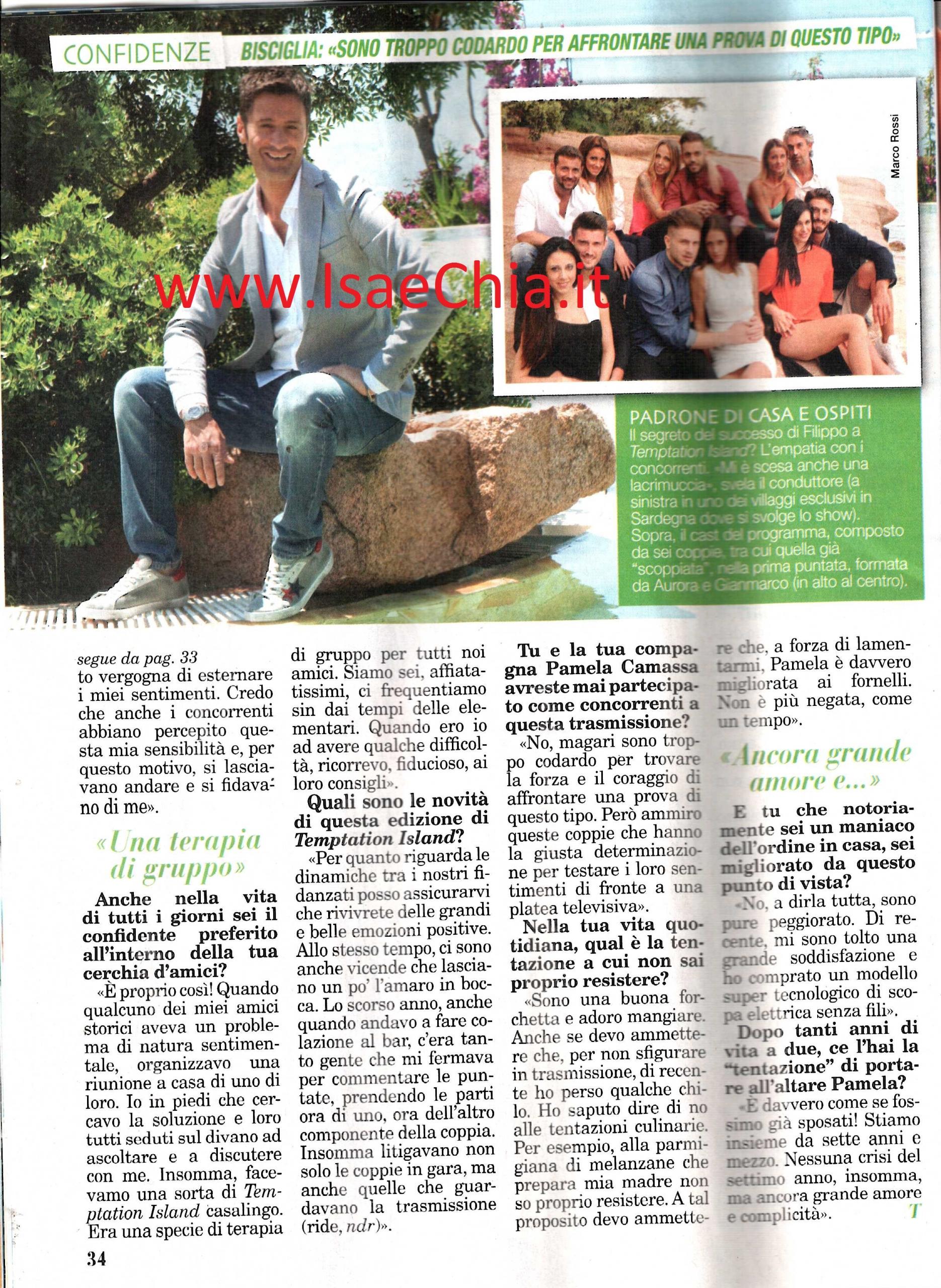 Negli scorsi giorni, il conduttore di Temptation Island, Filippo Bisciglia, ha confessato che non avrebbe mai partecipato al programma (QUA per rileggere l’intervista). E questo nonostante la sua storia con la showgirl Pamela Camassa duri ormai da sette anni e sia ben rodata. L’ex gieffino, infatti, non vorrà mettere alla prova la sua storia, ma è pronto a mettersi alla prova come padre e lancia un appello: “Amore mio, non farmi arrivare a 40 anni per diventare papà: non vorrei accompagnare mio figlio a scuola ad un età più vicina a quella di un nonno!“. Poi aggiunge: “Mi piacerebbe molto e non l’ho mai nascosto. Chissà che, per la fine del programma, non riesca a convincere Pamela. Non voglio forzare i suoi tempi, che vanno rispettati, ma è meglio non aspettare troppo, il nostro è un rapporto collaudato. Vorrei una femminuccia, con lei sarei un padre sempre presente! Sono geloso, ma sono pronto a correre il rischio e a mettermi alla prova. Intanto, grazie a Pamela, sono diventato molto più sicuro di me. Non mi dà mai motivo di dubitare di lei e al suo fianco sono sereno. Viviamo insieme da tanti anni, ma ci sposeremo: ci manca solo la benedizione in chiesa, per il resto stiamo bene. Sono molto credente e sono un ‘Papaboy’: Papa Francesco è sicuramente il ‘mio’ Papa. Ho provato ad incontrarlo, ma sono arrivato tardi all’udienza a causa del traffico!“. Quando gli si chiede se gli è mai arrivata qualche proposta indecente e come reagirebbe ad un tradimento di Pamela, Filippo risponde: “Sono un uomo fedele. Ho ricevuto delle avances, ma ho sempre fatto marcia indietro. Io forse la perdonerei, ma solo se si trattasse di una scappatella fugace, ma sottolineo forse! Se alla base dell’infedeltà ci fossero dei sentimenti veri, non potrei mai accettare, anche in caso di pentimento“. Infine, parla della soddisfazione di tornare a Temptation Island: “Ho trascorso il mio 38esimo compleanno impegnato con le riprese. Ho festeggiato con i concorrenti del programma e con Pamela, che mi ha raggiunto in Sardegna. Non ho molto tempo da dedicarle in questo momento, ma averla vicina mi fa dimenticare la stanchezza. Tornare nel ruolo di narratore-confidente è il più regalo che mi si potesse fare. Gli ascolti non ci deludono e questa edizione è ancora più spettacolare. L’anno scorso, Maria De Filippi si è complimentata con me e spero lo faccia anche quest’anno: lei mi ha suggerito di essere sempre me stesso e di entrare in empatia con i concorrenti, specie nel momento delle confessioni e del falò. E’ importante misurare le parola e calibrare il tono della voce. Anche gli sguardi che scambio con loro sono importanti per spingerli ad aprirli. Il mio motto? L’importante non è partecipare, ma provare a vincere mettendocela tutta!“.