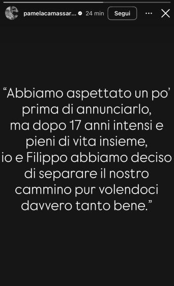 Abbiamo aspettato un po’ prima di annunciarlo, ma dopo 17 anni intensi e pieni di vita insieme, io e Filippo abbiamo deciso di separare il nostro cammino pur volendoci molto bene.