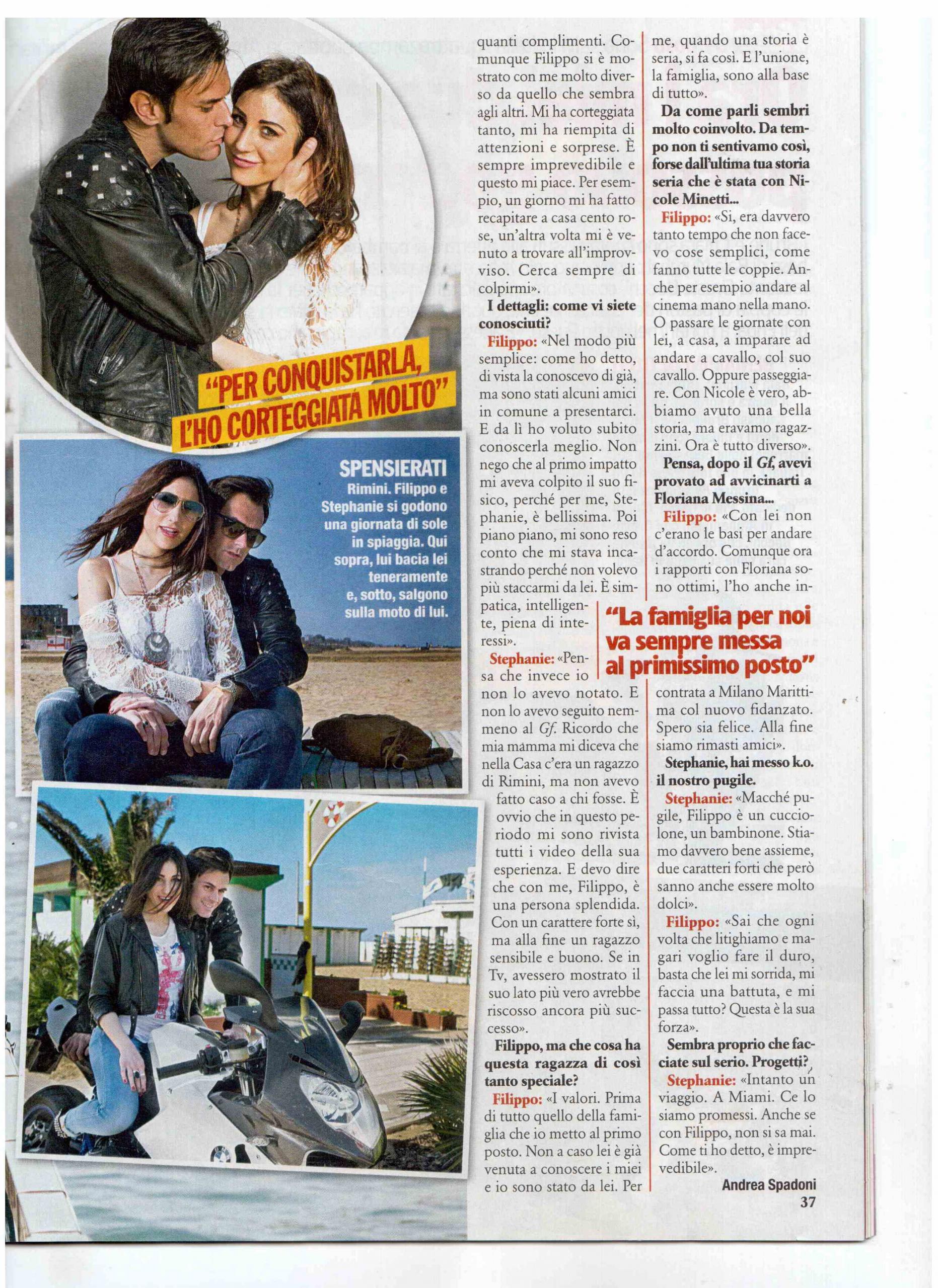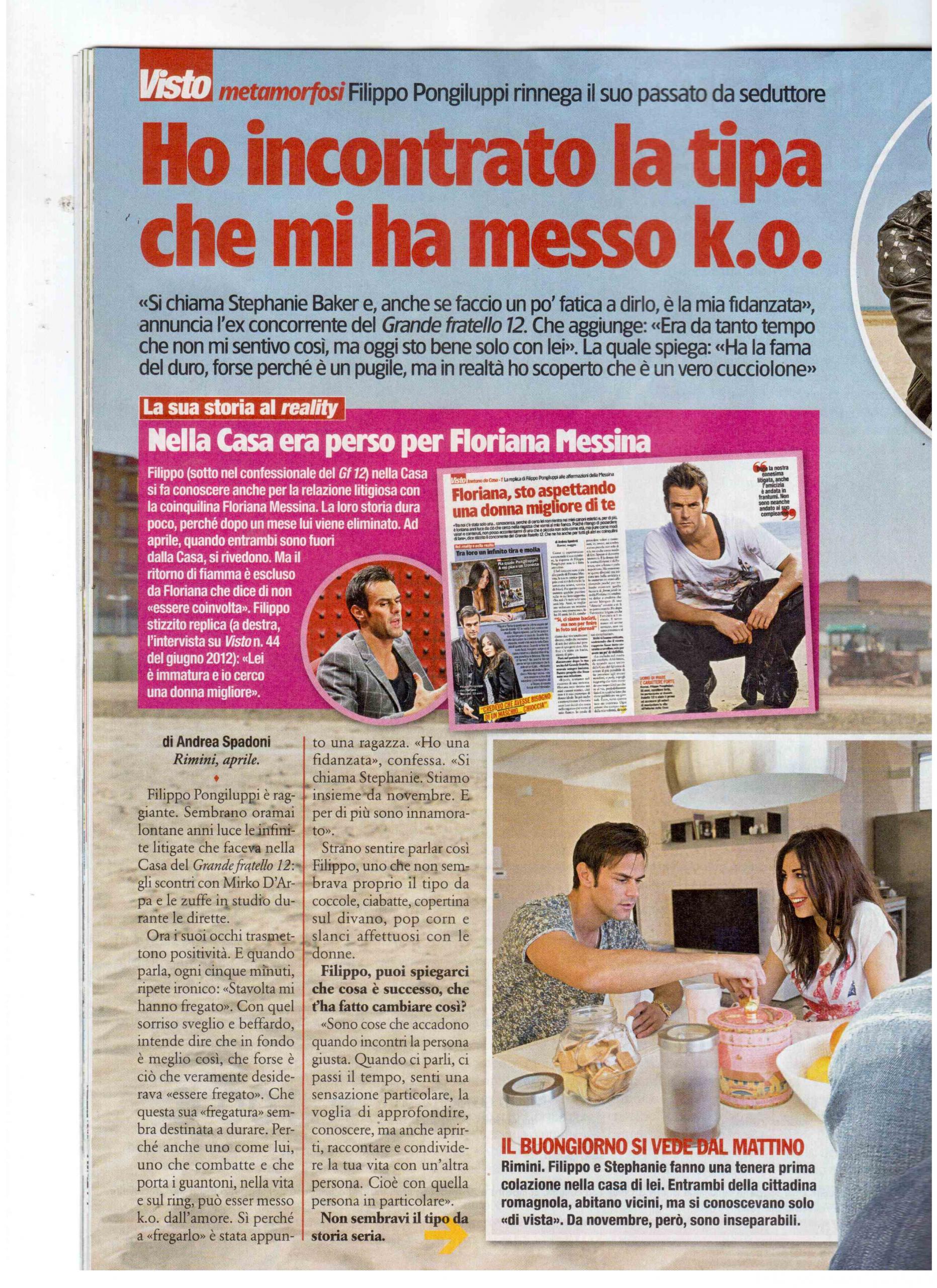 Sono ormai lontani i tempi in cui Filippo Pongiluppi litigava e faceva discutere al Grande Fratello: “Sono innamorato. Lei si chiama Stephanie e stiamo insieme da novembre. Quando parli con una persona, ci passi il tempo, senti una sensazione particolare, la voglia di approfondire, capisci che quella è la persona giusta. Erano molti anni che non avevo una storia fissa, il mio approccio con le donne era sempre superficiale e prima di entrare al GF avevo una bassissima considerazione di loro. Ma quando diciamo che tutte le donne sono uguali, ci sbagliamo. Avevo già visto Stephanie in giro e l’avevo notata perché molto bella, ma non pensavo avesse tutte queste qualità. Degli amici in comune ci hanno presentati e io ho subito avuto voglia di conoscerla meglio. E’ simpatica, intelligente, piena di interessi. Quello che mi ha colpito di lei sono i suoi valori, prima di tutto la famiglia, che io metto al primo posto. Lei è venuta a conoscere i miei e io i suoi. Con Floriana Messina non c’erano le basi per andare d’accordo, ma i rapporti sono ottimi: l’ho anche incontrata a Milano Marittima con il nuovo fidanzato, spero sia felice”. Infine prende la parola lei: “Mia mamma mi diceva che al GF c’era uno di Rimini, ma io non lo avevo notato. Ha un carattere forte, ma è una persona stupenda, sensibile e buona; è un cucciolone, un bambinone! Per ora progettiamo un viaggio a Miami, poi, non si sa!”