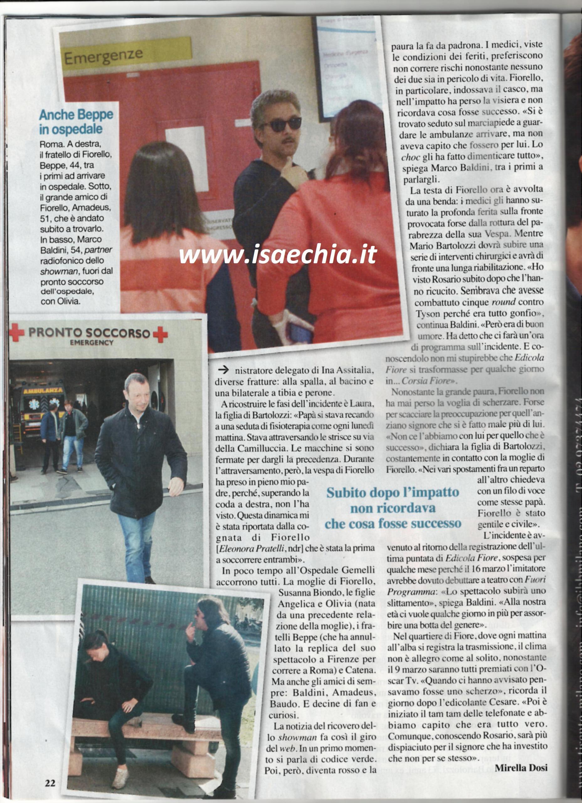 Sono stati attimi di paura quelli vissuti dallo showman Rosario Fiorello lo scorso lunedì 3 marzo verso le 9.20 del mattino, tornando a casa dopo l’Edicola Fiore, il programma che conduce su Raidue, e a pochi metri da casa propria: ha travolto un pensionato con la sua Vespa. Per il conduttore siciliano trauma cranico, ferita lacero contusa sulla fronte, 20 punti di sutura e un ricovero in terapia intensiva. Per il pensionato investito, ex amministratore delegato di Ina Assitalia, fratture a spalla, bacino e tibia e perone. “Papà si stava recando a una seduta di fisioterapia e stava attraversando la strada sulle strisce. Le macchine si erano fermate, mentre la Vespa di Fiorello ha preso in pieno mio padre perché proveniva dalla destra” dice la figlia della vittima, che racconta la dinamica riportatale dalla cognata di Fiorello, la prima ad assisterli. In poco tempo all’Ospedale Gemelli di Roma accorrono tutti: la moglie Susanna con le figlie Angelica e Olivia, il fratello Beppe e la sorella Catena. Poi, gli amici di sempre: Marco Baldini, Pippo Baudo, Amadeus e decine di fan e curiosi. Fiorello indossava il casco, ma non ricordava cosa fosse successo: “Si è trovato sul marciapiede a guardare le ambulanze, ma non aveva capito che fossero per lui” riferisce Baldini. I medici gli hanno suturato la ferita provocata dalla rottura del parabrezza e ora ha la testa fasciata. Per il signor Mario Bartolozzi, invece, una serie di interventi chirurgici e lunghe fisioterapie. “Era tutto gonfio ma ha detto che farà un’ora di programma sull’incidente” riferisce ancora Baldini, raccontando della voglia di scherzare del collega. Il 16 marzo sarebbe dovuto partire in teatro Fuori programma ma “lo spettacolo subirà uno slittamento. Alla nostra età ci vuole più tempo per assorbire una botta del genere”.