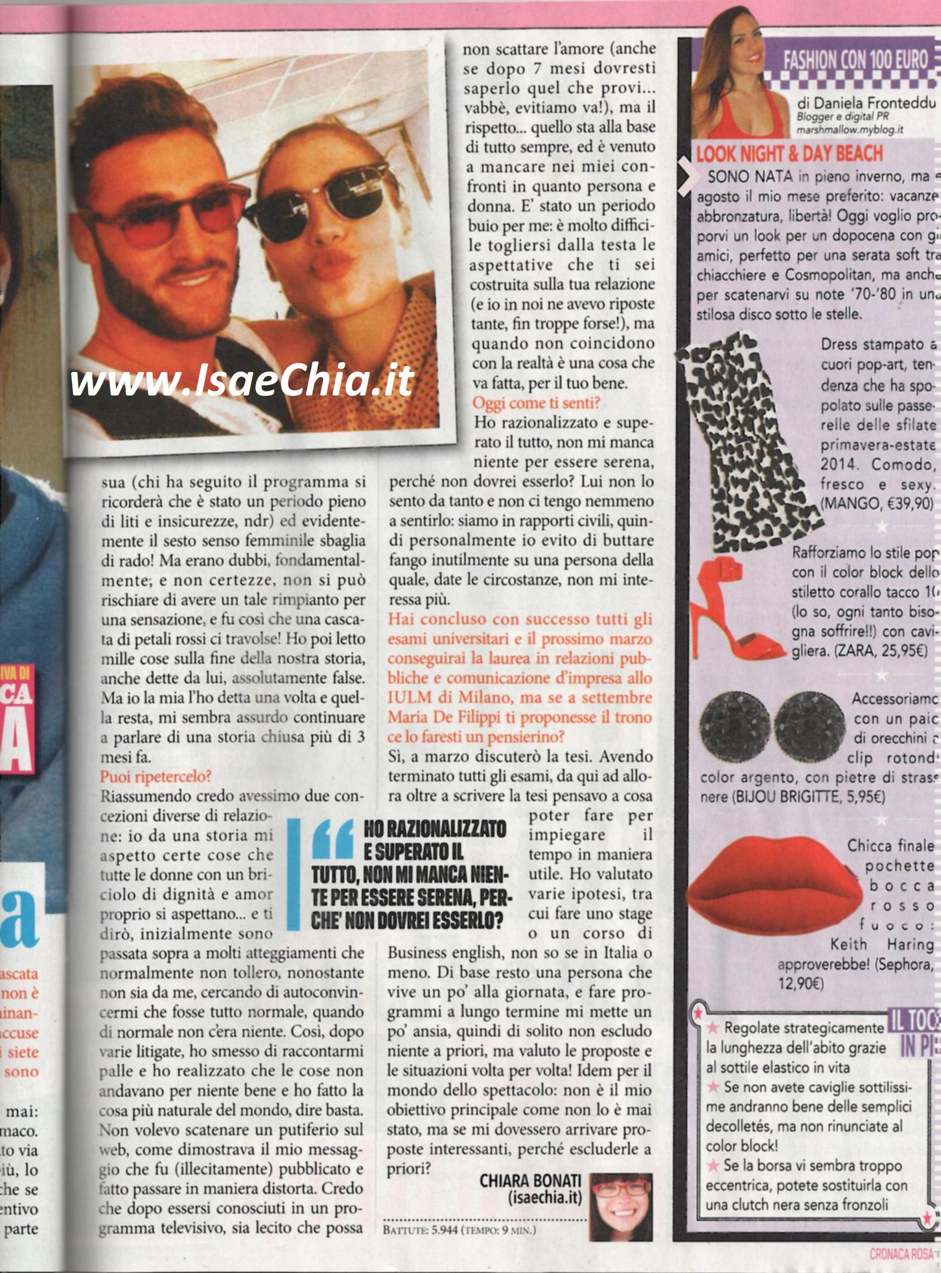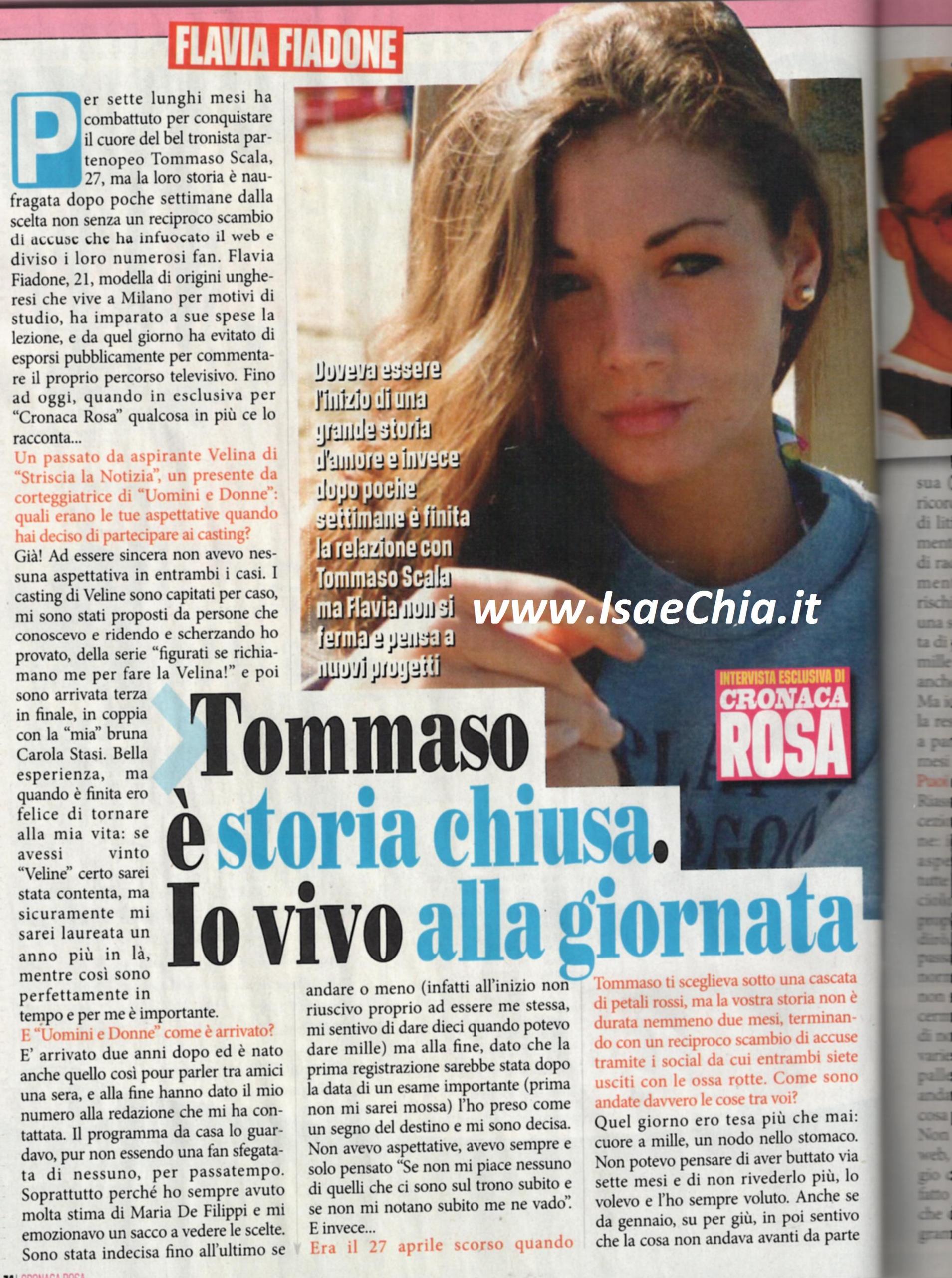 La storia tra Flavia Fiadone e Tommaso Scala si è conclusa poche settimane dopo la scelta a Uomini e donne, tra le reciproche accuse. Adesso, Chiara Bonati, meglio nota come Chia per noi affezionati di Isaechia.it, ha intervistato la corteggiatrice per la rivista Cronaca rosa ed è partita dal provino per Veline: “Già, sia per Striscia che per Uomini e donne non avevo nessuna aspettativa. I casting di Veline sono capitati per caso, mi sono stati proposti da persone che conoscevo e ridendo e scherzando ho accettato, pensando “Figurati se divento Velina”. Poi sono arrivata terza in finale! Se avessi vinto sarei stata contenta ma mi sarei laureata un anno più in là, mentre ora sono perfettamente in tempo e per me è importante. Anche Uomini e donne è arrivato parlando con gli amici, che hanno dato il mio numero alla redazione. Guardavo il programma, non perché fossi una sfegatata, ma per stima nei confronti di Maria De Filippi e mi emozionavo al momento delle scelte. Sono stata indecisa fino all’ultimo (infatti all’inizio non riuscivo ad essere me stessa), ma alla fine, poiché la registrazione sarebbe stata dopo la data di un esame per me importante, prima del quale non mi sarei mossa, l’ho presa come un segno del destino. Ho pensato ‘se non mi piace nessuno me ne vado’, e invece…Il giorno della scelta, il 27 aprile, ero più tesa che mai. Non potevo pensare di aver buttato sette mesi, che avrei potuto non rivedere Tommaso, anche se da gennaio sentivo che la cosa non andava avanti da parte sua. Evidentemente il sesto senso femminile sbaglia di rado! Però erano dubbi e non certezze, non si può rischiare un rimpianto per una sensazione. Sulla fine della nostra storia ne sono state dette tante, anche da lui, ma io ho già dato la mia versione. Avevamo due concetti diversi di relazione: io da una storia mi aspetto delle cose che tute le donne con un briciolo di dignità si aspettano. Inizialmente sono passata sopra a tanti atteggiamenti che normalmente non tollero, ma dopo varie litigate ho smesso di raccontarmi palle e ho realizzato che le cose non andavano bene ed era il momento di dirsi basta. Non volevo scatenare l’inferno sul web, cosa che ha fatto il mio messaggio (illecitamente) pubblicato e fatto passare in modo distorto. Credo che dopo essersi conosciuti in un programma televisivo sia lecito che non scatti l’amore, ma il rispetto sta alla base di tutto e quello è venuto a mancare. E’ stato un periodo buio: è difficile togliersi dalla testa le aspettative che ti sei costruita sulla tua relazione. Ora ho razionalizzato il tutto e sono serena. Lui non lo sento da tanto e non ci tengo a sentirlo. Siamo in rapporti civili, quindi evito di buttare fango su una persona di cui, date le circostanze, non mi interessa più”. Adesso Flavia fa progetti per il futuro: “A marzo discuterò la tesi in Relazioni pubbliche e comunicazione d’impresa presso la IULM di Milano, ma avendo già terminato gli esami, ho pensato di fare altro nel frattempo, come un corso di Business English. Sono una che vive alla giornata e che valuta le cose proposte e le situazioni di volta in volta. Lo stesso vale per il mondo dello spettacolo: non è il mio obiettivo principale e non lo è mai stato, ma se mi dovessero arrivare delle proposte interessanti, perché escluderle a priori?”