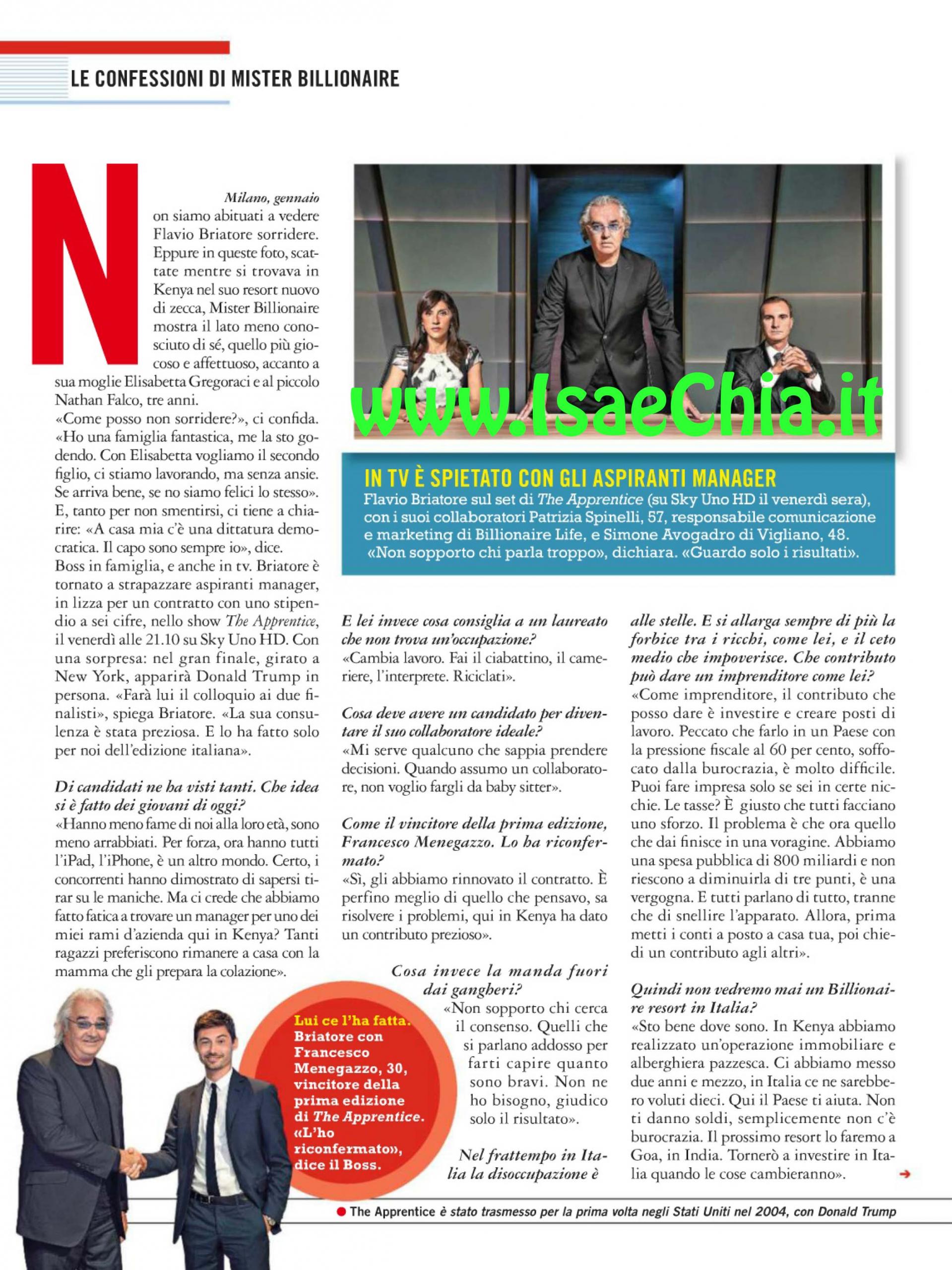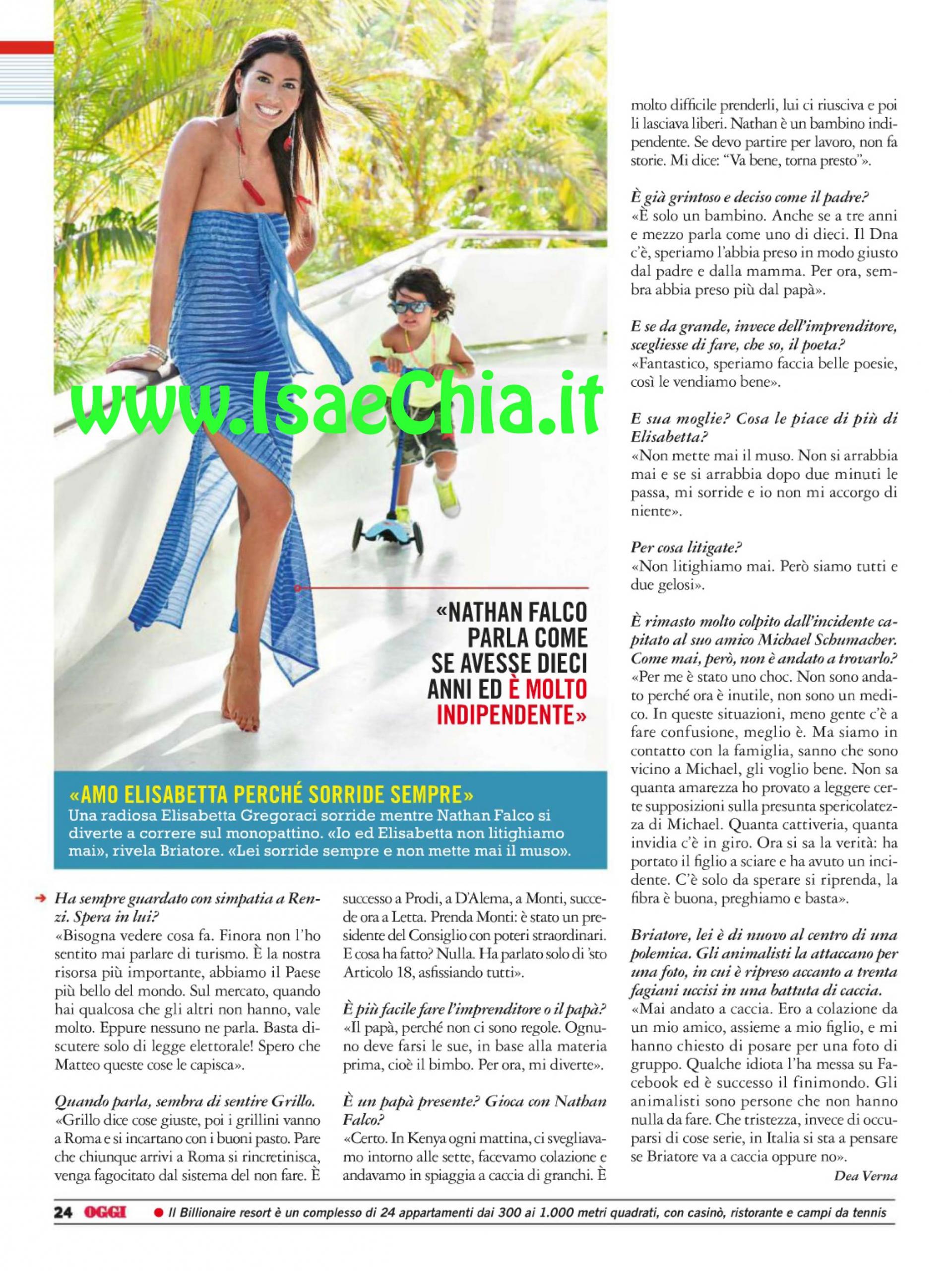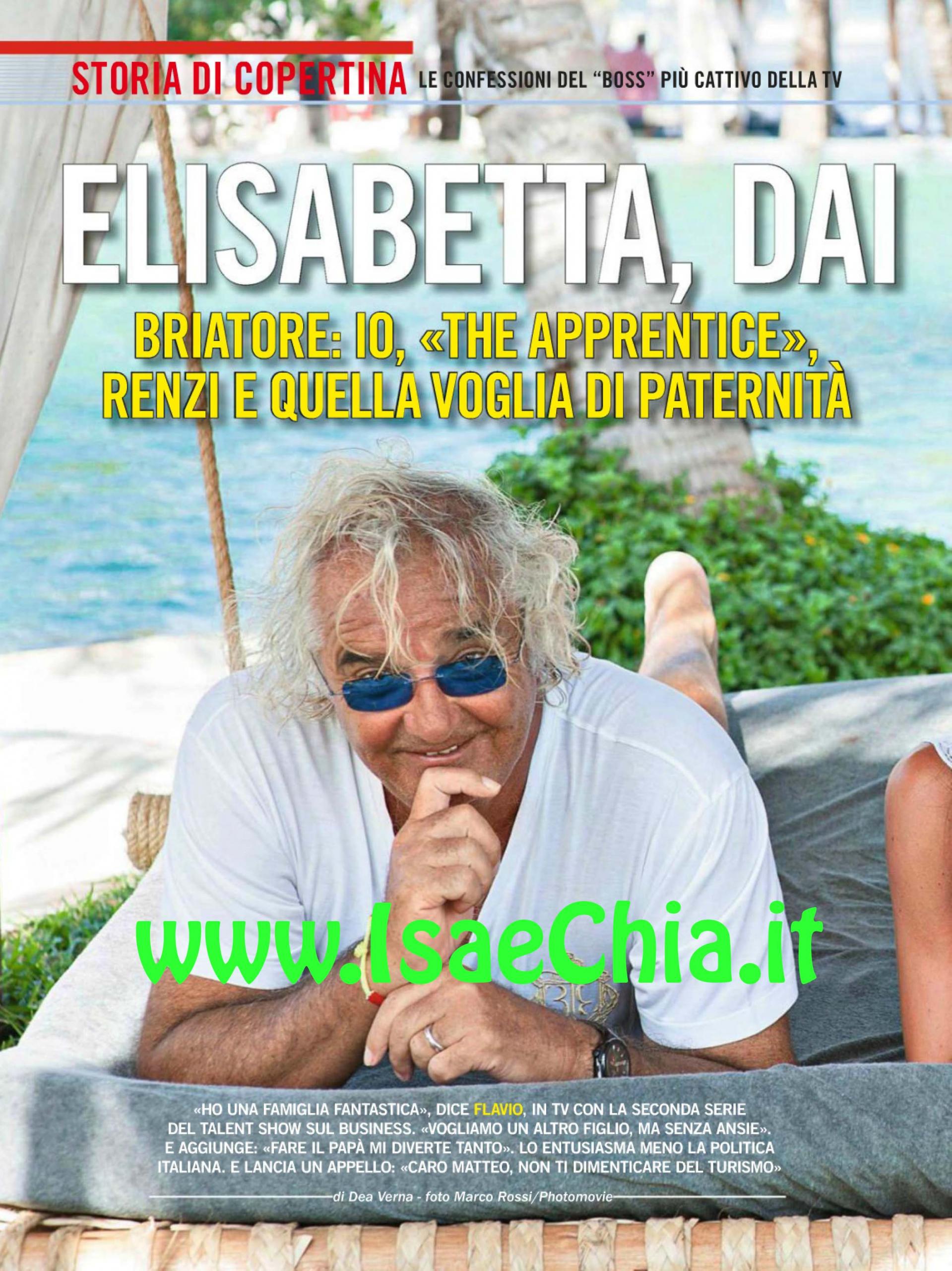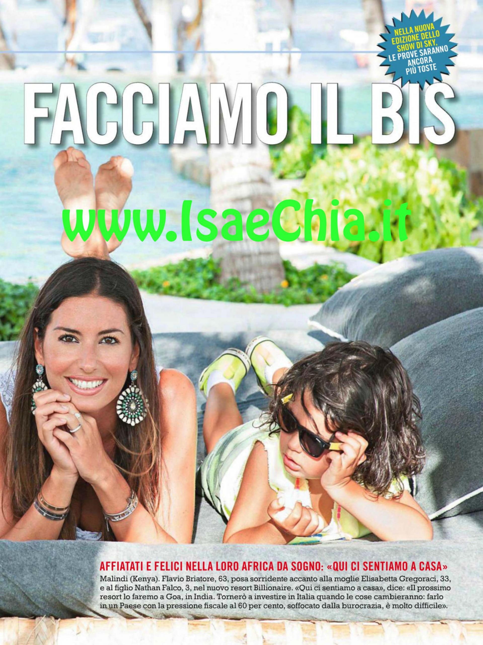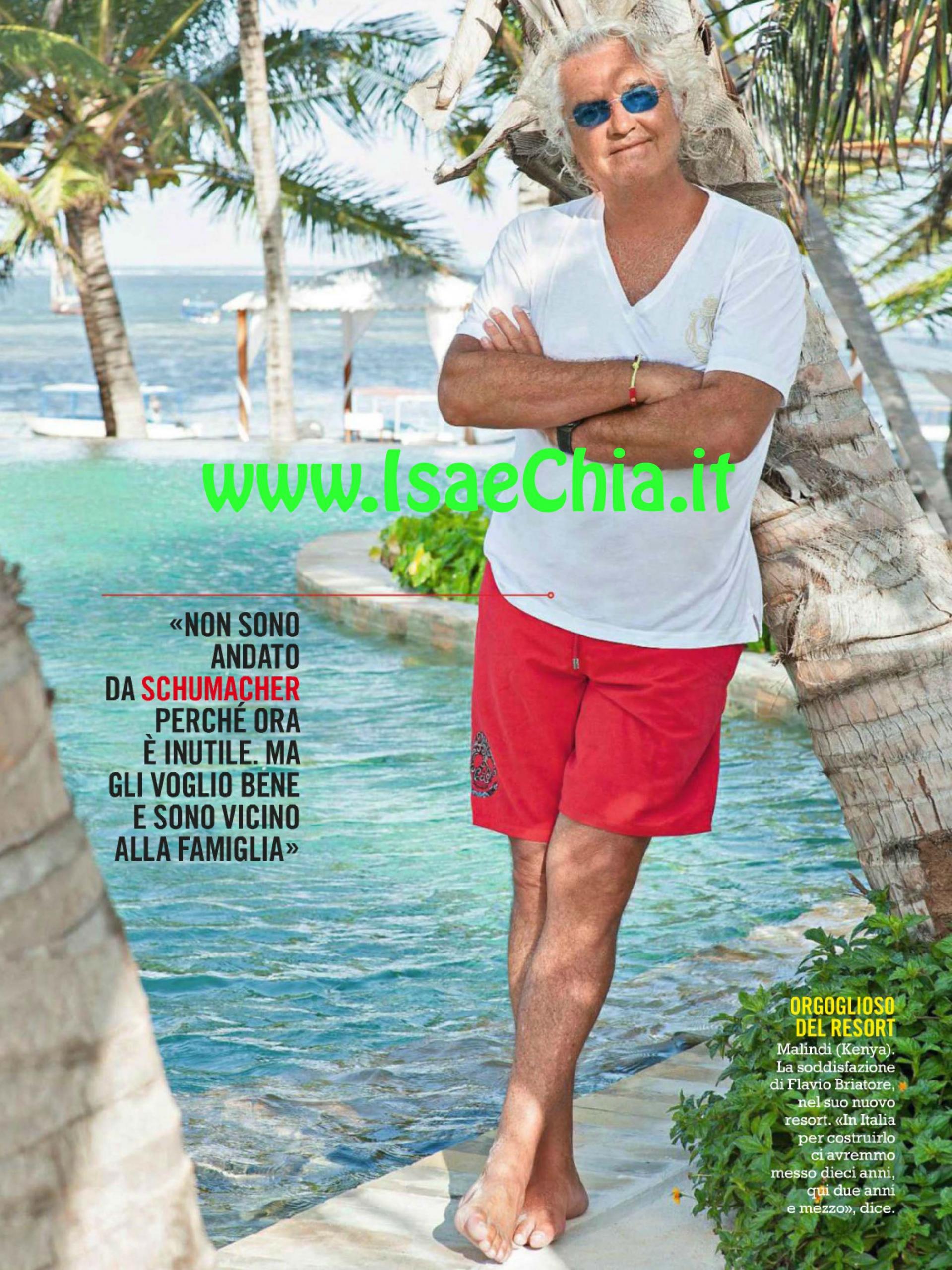 Non siamo abituati a vedere sorridere Flavio Briatore con la moglie Elisabetta Gregoraci e il piccolo Nathan Falco, eppure in queste foto nel suo nuovo resort in Kenya, Mister Billionaire mostra un lato meno conosciuto di sé. “Come posso non sorridere? Ho una famiglia fantastica, me la sto godendo. Con Elisabetta vogliamo il secondo figlio, ci stiamo lavorando, ma senza ansie. Se arriva bene, se no siamo felici lo stesso”. Flavio è tornato a strapazzare manager nello show The Apprentice su Sky Uno HD. Con una sorpresa: nel gran finale girato a New York, apparirà Donald Trump in persona. “Farà lui il colloquio ai due finalisti. La sua consulenza è stata preziosa. E lo ha fatto solo per noi nell’edizione italiana. I concorrenti hanno dimostrato di sapersi tirare su le maniche. Non sopporto chi cerca il consenso. Quelli che si parlano addosso per farti capire quanto sono bravi. Non ne ho bisogno, giudico solo il risultato. E’ più facile fare il papà che l’imprenditore, perchè non ci sono regole. Ognuno deve farsi le sue, in base alla materia prima, cioè il bimbo. Per ora, mi diverte. In Kenya ogni mattina ci svegliavamo intorno alle sette, facevamo colazione e andavamo in spiaggia a caccia di granchi. Nathan è un bimbo indipendente. A tre anni e mezzo parla come uno di dieci. Se devo partire per lavoro non fa storie. Mi dice: ‘Va bene, torna presto’. Elisabetta non mette mai il muso. Non si arrabbia mai e se lo fa, dopo due minuti le passa, mi sorride ed io non me ne accorgo di niente. Non litighiamo mai, però siamo tutti e due molto gelosi”.