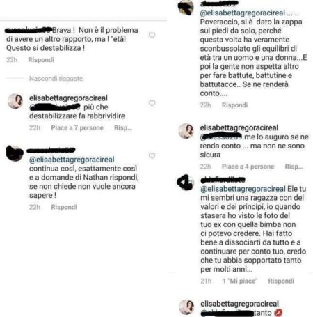 “Non è il problema avere un altro rapporto, ma l’età. Questo sì destabilizza”, le ha scritto un utente, a cui Elisabetta ha replicato piccata: “Più che destabilizzare fa rabbrividire”. Mentre ad un altro follower che ha aggiunto: “Briatore ha scombussolato gli equilibri di età tra uomo e donna”, la showgirl ha replicato: ”Mi auguro che se ne renda conto… Ma non ne sono sicura”.