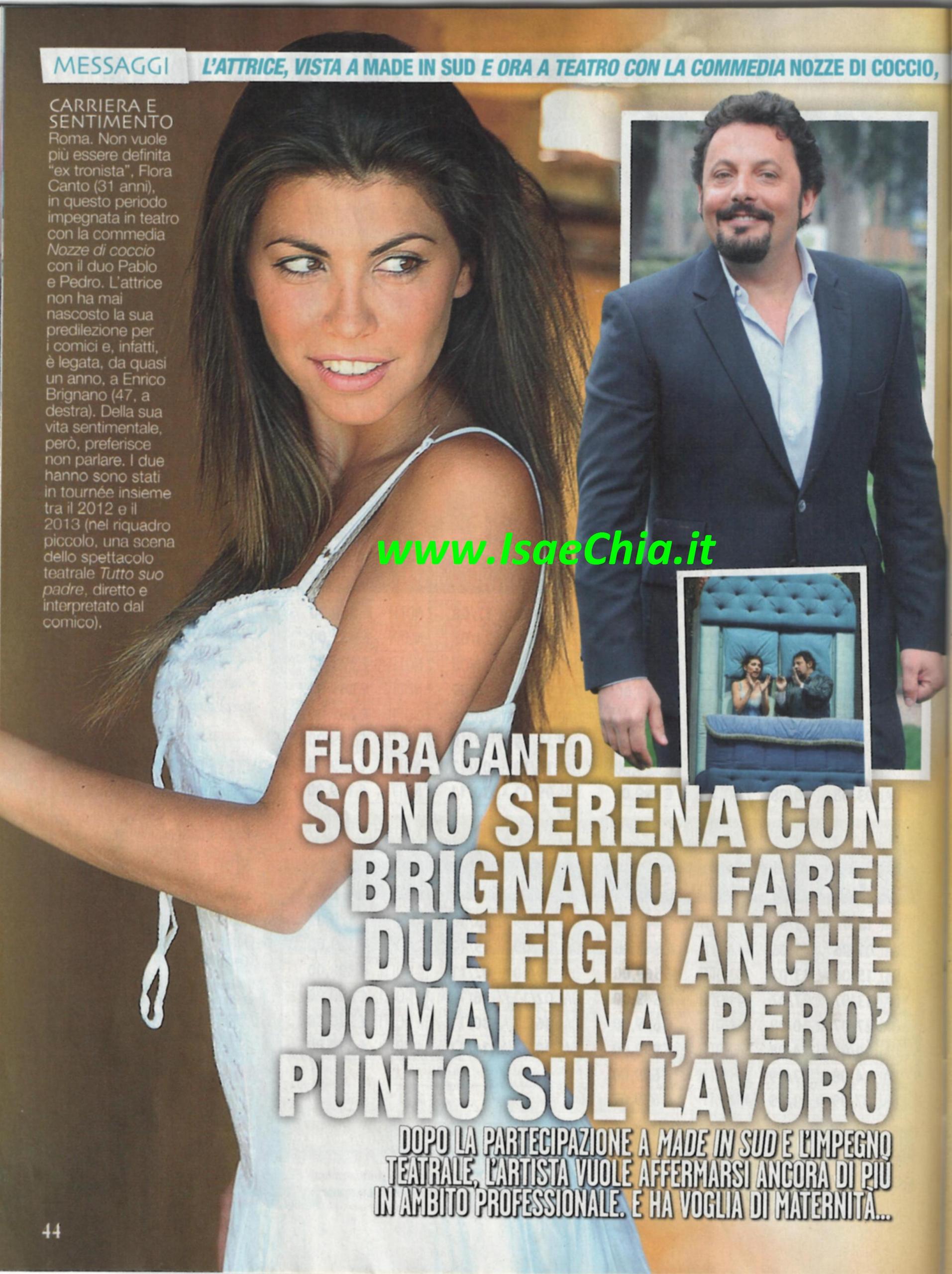 Flora Canto è diventata nota prima per essere l’ex fidanzata del gieffino Filippo Bisciglia, poi per aver partecipato a Uomini e donne come tronista. Oggi, però, non vuole che le sia accostata quest’etichetta: “Il mio è un percorso abbastanza lineare, fin dall’inizio ho affiancato attori comici. In questi giorni sto partecipando alla commedia Nozze di coccio, con Pablo e Pedro: nella prima parte interpreto una sposa di origini brasiliane, nella seconda una ragazza provocante e affascinante, che però parlando esprime tutto il suo essere “burina”: mi diverto ad interpretare queste donne ricche di contraddizioni! La gente ha bisogno di ridere! Non è un caso se un programma a cui ho recentemente partecipato, Made in Sud, ha così successo. Su quel palco mi sono confrontata con la comicità napoletana ed è stato molto divertente. Venendo dai reality, ho dovuto fare molto, perché si crede che la tronista non possa fare altro. Se, invece, come nel mio caso, hai sempre studiato, cercando di migliorare anche nel canto e nel ballo, è un peccato non avere la possibilità di mettersi alla prova. Per questo non smetterò  mai di ringraziare il teatro, che mi ha permesso di farmi conoscere, mentre i giornalisti si limitano a scrivere ‘ex tronista’!”. Infine, parla della sua vita privata: “Mi vedrei bene con un figlio, meglio ancora con due. Ho una forte voglia di maternità, un bimbo lo farei anche domani mattina. Diciamo che sto lavorando all’idea…”. Ma, quando le si chiede perché non parla mai del comico Enrico Brignano, col quale pare abbia una storia, risponde: “In passato ho pagato le conseguenze di partecipare a programmi che facevano leva sulla vita privata. Da allora ho deciso di tutelare la mia intimità. Mi piacerebbe che si parlasse del mio lavoro, ma non ho problemi a dire che nel privato sono serena. Punto”.
