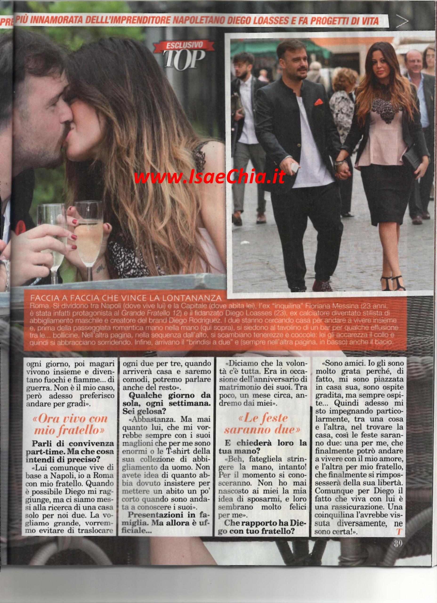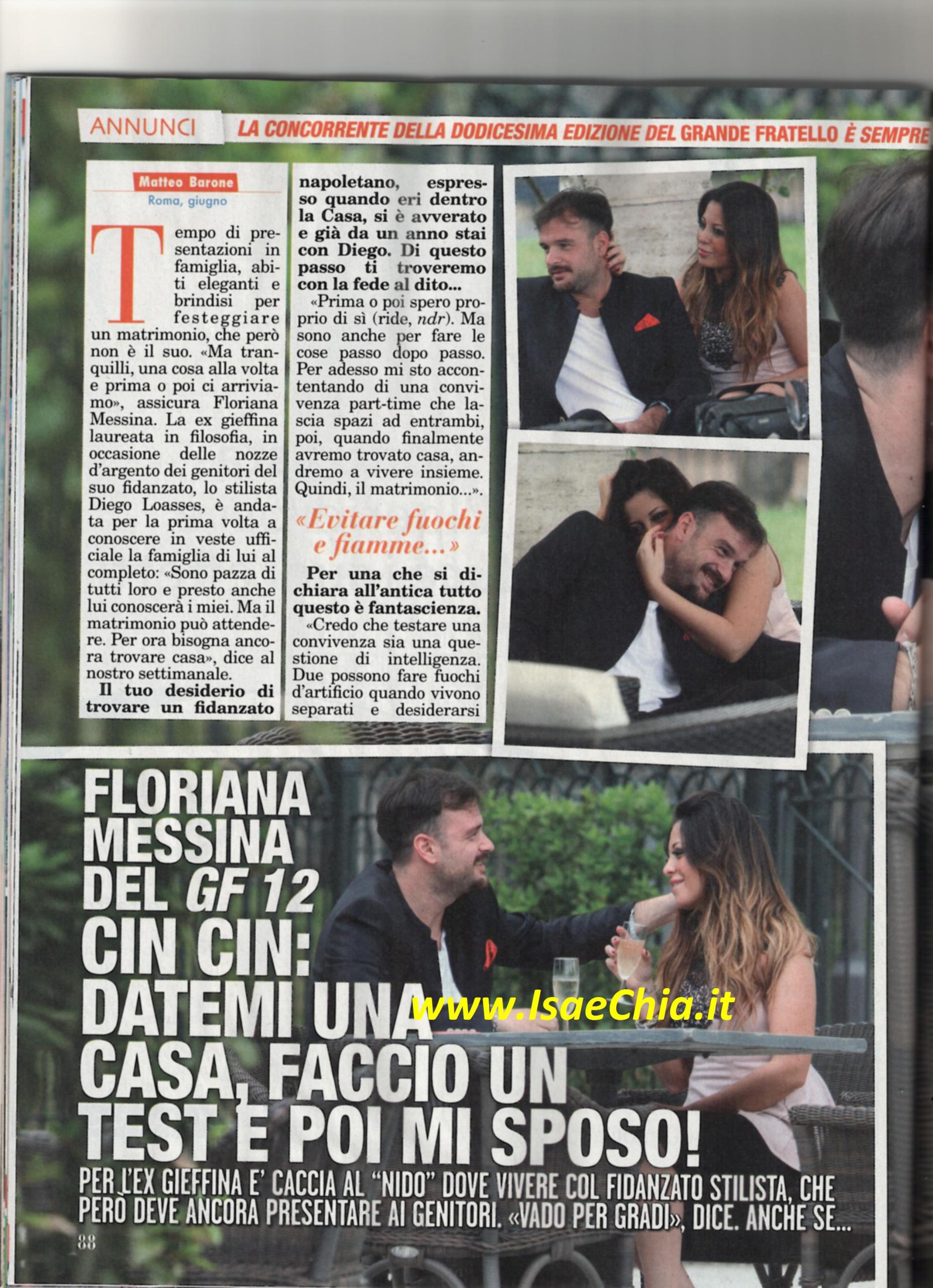 La vivace concorrente del Grande fratello 12 Floriana Messina ha preso parte ai festeggiamenti per le nozze d’argento dei genitori del suo fidanzato, l’ex calciatore oggi stilista Diego Loasses. Ma precisa che forse presto festeggerà il suo: “Un passo alla volta ci arriveremo anche noi. Non vedo l’ora di presentargli anche i miei il mese prossimo, ma il nostro matrimonio per ora può attendere. Dobbiamo prima trovare casa! Per adesso mi sto accontentando di una convivenza part-time che lascia spazio ad entrambi. Poi, quando avremo trovato la casa, andremo a vivere insieme, e infine…il matrimonio! Credo che testare una convivenza sia una questione d’intelligenza: due possono fare fuochi d’artificio quando vivono separati e poi vivere insieme e fare fuoco e fiamme…di guerra! Lui vive a Napoli, io a Roma con mio fratello. Quando può mi raggiunge, ma ora cerchiamo una casa grande, per evitare di traslocare ogni due per tre in seguito. Io sono un po’ gelosa quando lui è via, ma mai quanto lui, che mi vorrebbe sempre con i suoi maglioni larghi”. Pensando alle imminenti presentazioni alla famiglia, Floriana dice: “Chiedere la mano? Fategliela stringere intanto! Diego e mio fratello sono già amici. Io sono molto grata a mio fratello perché di fatto, mi sono piazzata a casa sua. Sono ospite gradita, ma pur sempre un’ospite. Quando troverò la casa, le feste saranno due: una per me, che potrò vivere col mio amore, e l’altra per mio fratello, che finalmente si rimpossesserà della sua libertà!”