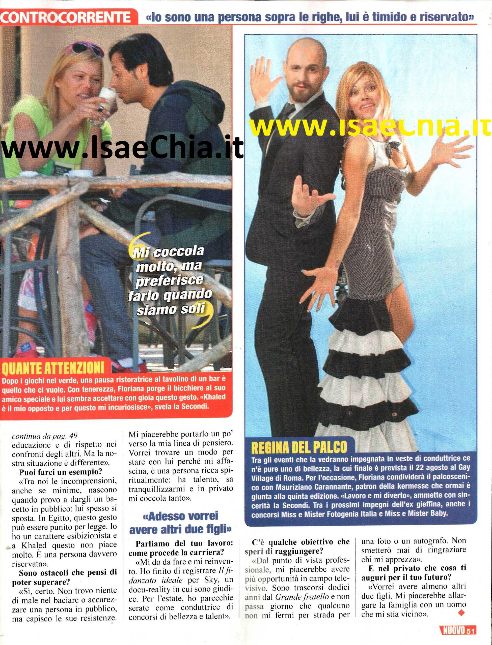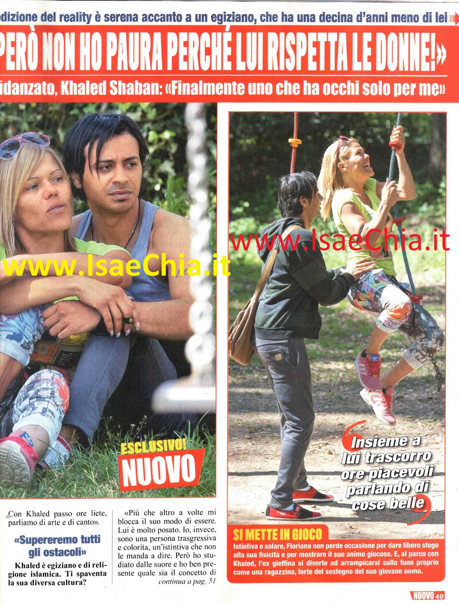 Più volte la vincitrice del Grande fratello 3 Floriana Secondi è finita sui giornali per le sue relazioni amorose. Dopo la storia con il padre di suo figlio Domiziano, infatti, ha frequentato per un po’ il modello Daniele Pompili e poi è stata beccata con il mental coach ed ex spogliarellista Roberto Bedetti. Adesso, finalmente, sembra aver trovato la serenità con un nuovo ragazzo. “Per me si tratta ancora solo di un’amicizia. Mi piace l’idea di stare vicino a lui. Nonostante sia più giovane di me di dieci anni, tra noi c’è molto scambio“. Khaled Shaban è un cantante e ballerino egiziano, che in Italia si è fatto notare grazie ad una tournée dove ha riprodotto i passi di Micheal Jackson. “Da quello che so, sono anni che è interessato a me. Ma io lo vedevo in modo diverso e avevo altre persone a fianco a me“. Quando le si fa notare che Khaled è musulmano e che ultimamente si sono sentiti spesso casi di donne maltrattate dai loro compagni musulmani, la verace romana ha risposto: “Non mi spaventa la sua religione, semmai il suo modo di essere. Lui è dolcissimo e gentilissimo. Fin troppo, a volte. E a differenza di tanti altri italiani, ha occhi solo per me. E’ molto attento e molto corretto e quando usciamo non mi permette di mettere mano al portafogli. Mi hanno colpito la sua eleganza e il suo stile: a me piacciono le persone completamente diverse da me, composte, che non fumano, non bevono e non dicono parolacce. In più l’unico idolo che abbia avuto in vita mia è Michael Jackson e ho perfino imparato l’inglese grazie alle sue canzoni. Quindi vedere un ragazzo che balla come lui mi ha molto stupito. Tra noi le nostre incomprensioni, anche minime, nascono quando provo a dargli un bacetto in pubblico: lui spesso si sposta. In Egitto, questo gesto può essere punito per legge e a lui, che è molto riservato, non piace. Io non ci trovo nulla di male, ma capisco le sue resistenze. Mi piacerebbe portarlo un po’ verso la mia linea di pensiero. Vorrei trovare un modo per continuare a stare con lui, perché mi affascina, è una persona ricca spiritualmente e in privato mi coccola molto“. Quando le si chiede se davvero è solo un amico, Floriana risponde: “Non mi pongo questo momento per ora. Sono sicura di quello che provo per ora: stima e amicizia. Non sono nemmeno sicura di riuscire ad innamorarmi ancora, dopo le delusioni avute. Ho avuto qualche esperienza, ma nessuno che riuscisse a farmi fare il passo in più”. Infine, quando le si chiede come procede la sua carriera, la gieffina racconta: “Mi do da fare e mi reinvento. Ho finito di registrare Il fidanzato ideale per Sky, un docu-reality in cui sono giudice e per l’estate ho serate da conduttrice per concorsi di bellezza e talent. Mi piacerebbe avere qualche opportunità in più in tv, anche se sono passati 12 anni dal Grande fratello e la gente ancora mi ferma per strada. E poi? In futuro vorrei avere altri due figli: mi piacerebbe allargare con un uomo che mi stia vicino“.