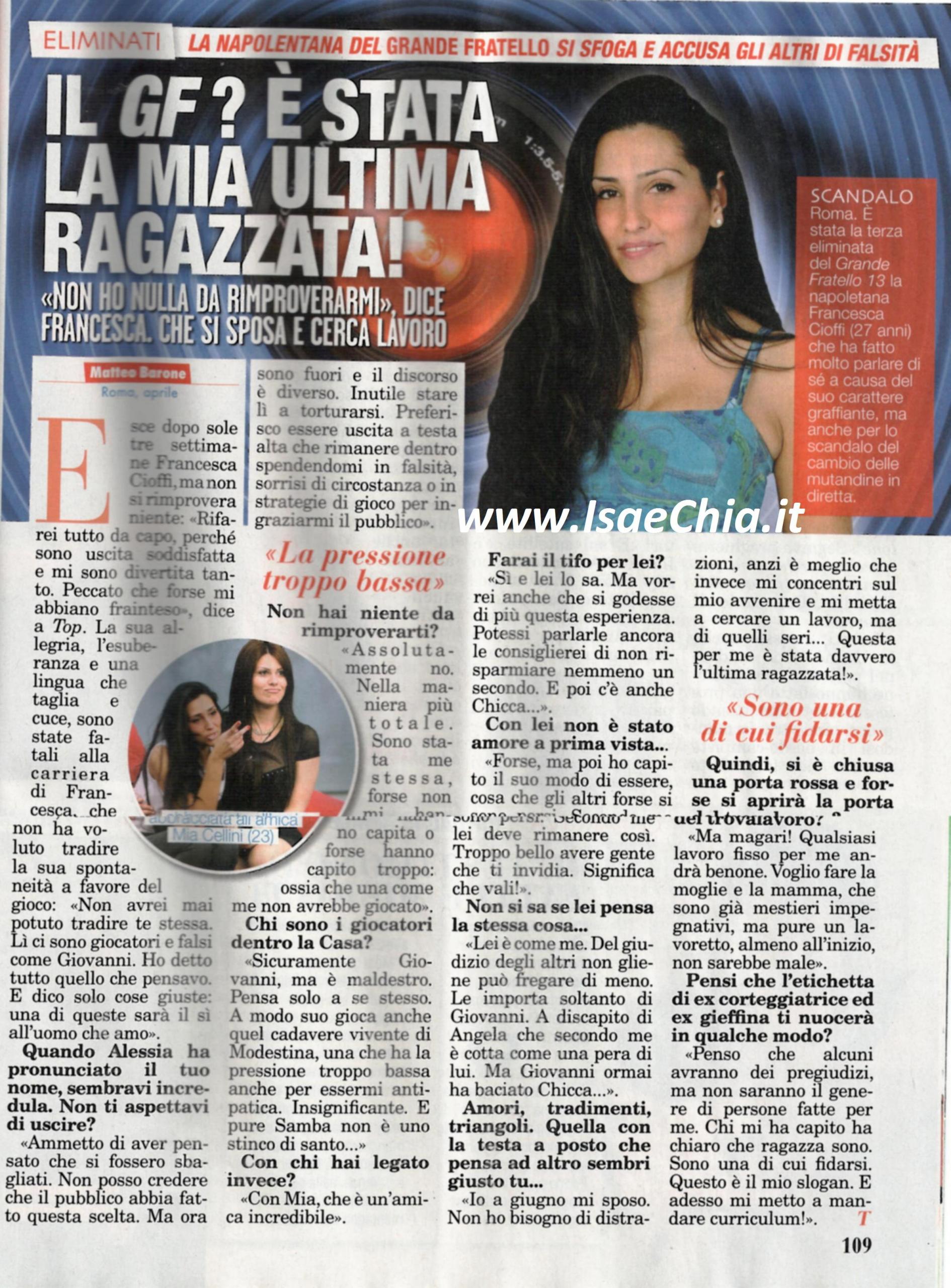 Francesca Cioffi è la terza eliminata dal Grande fratello 13: “Quando Alessia Marcuzzi ha fatto il mio nome, ammetto che ero incredula e di aver pensato che si fossero sbagliati. Non posso credere che il pubblico abbia fatto questa scelta! Ma ora che sono fuori il discorso è tutto diverso, inutile stare lì a torturarmi. Meglio esser uscita a testa alta, che esser rimasta lì spendendomi in falsità, sorrisi di circostanza e strategie di gioco per ingraziarmi il pubblico. Non ho assolutamente niente da rimproverarmi. Sono stata me stessa; forse non mi hanno capita o hanno capito troppo: ossia che una come me non avrebbe giocato”. Quando le si chiede chi reputa i giocatori della Casa risponde: “Giovanni Masiero, ma è maldestro. Pensa solo a se stesso. A modo suo lo è anche quel cadavere di Modestina Cicero, una che ha la pressione troppo bassa anche per essermi antipatica. Insignificante. E pure Samba Laobe Ndiaye non è uno stinco di santo. Farò il tifo per Mia Cellini e lei lo sa, ma vorrei che si godesse di più quest’esperienza; le consiglierei di non risparmiare neanche un secondo. E poi c’è anche Chicca Rocco. Con lei forse non è stato amore a prima vista, ma poi ho capito il suo modo di essere, che gli altri si sono persi. Lei deve rimanere così: avere gente che ti invidia vuol dire che vali! Del giudizio degli altri non gliene frega niente. A lei interessa solo Giovanni”. Infine, conclude: “A giugno mi sposo e non ho bisogno di distrazioni, anzi è meglio che mi concentri sul mio avvenire e mi metta a cercare un lavoro di quelli seri! Questa è stata la mia ultima ragazzata! Voglio fare la moglie e la mamma, che sono già mestieri impegnativi, ma qualsiasi lavoretto fisso non sarebbe male! Penso che le etichette di corteggiatrice e gieffina causeranno dei pregiudizi in qualcuno, ma chi mi ha capita, sa che ragazza sono: sono una di cui fidarsi”.