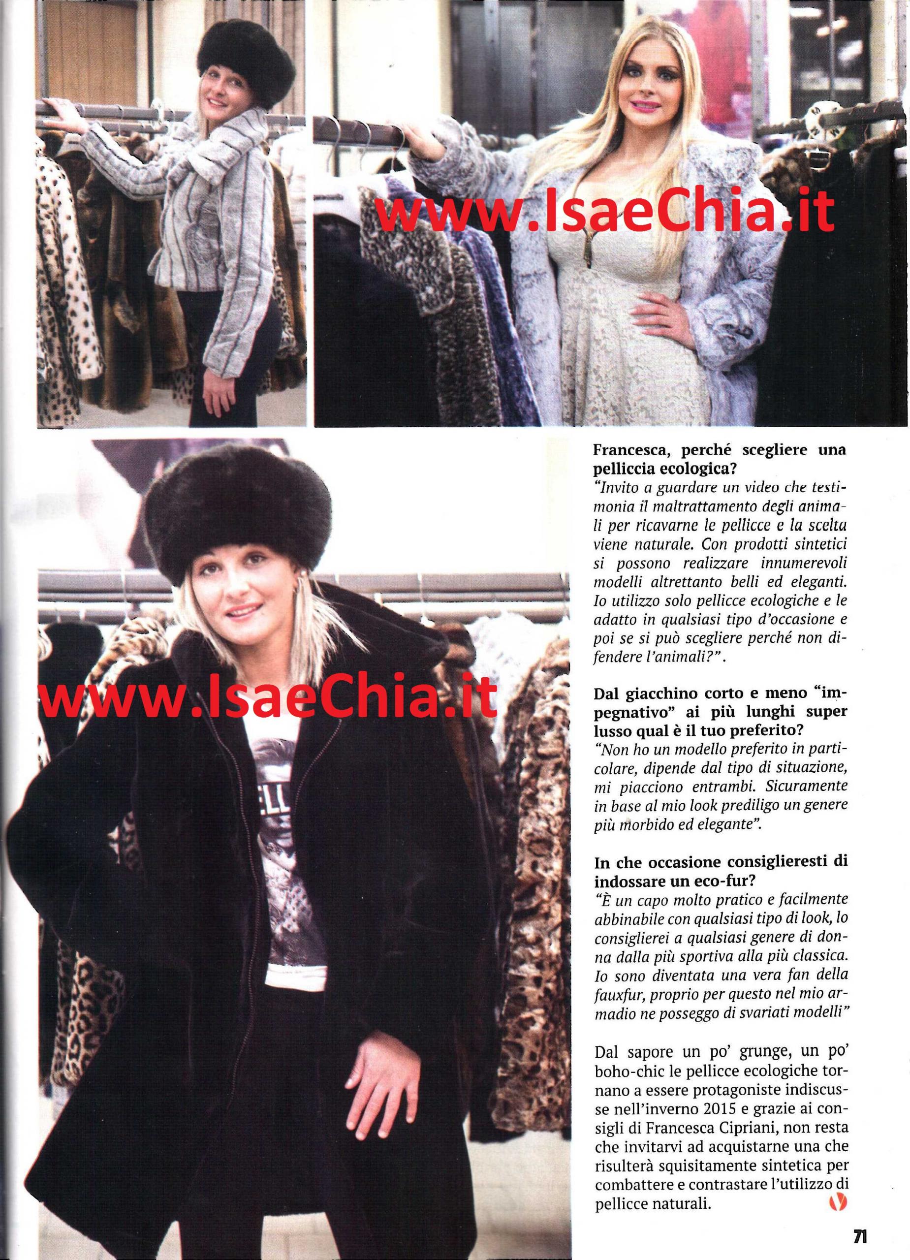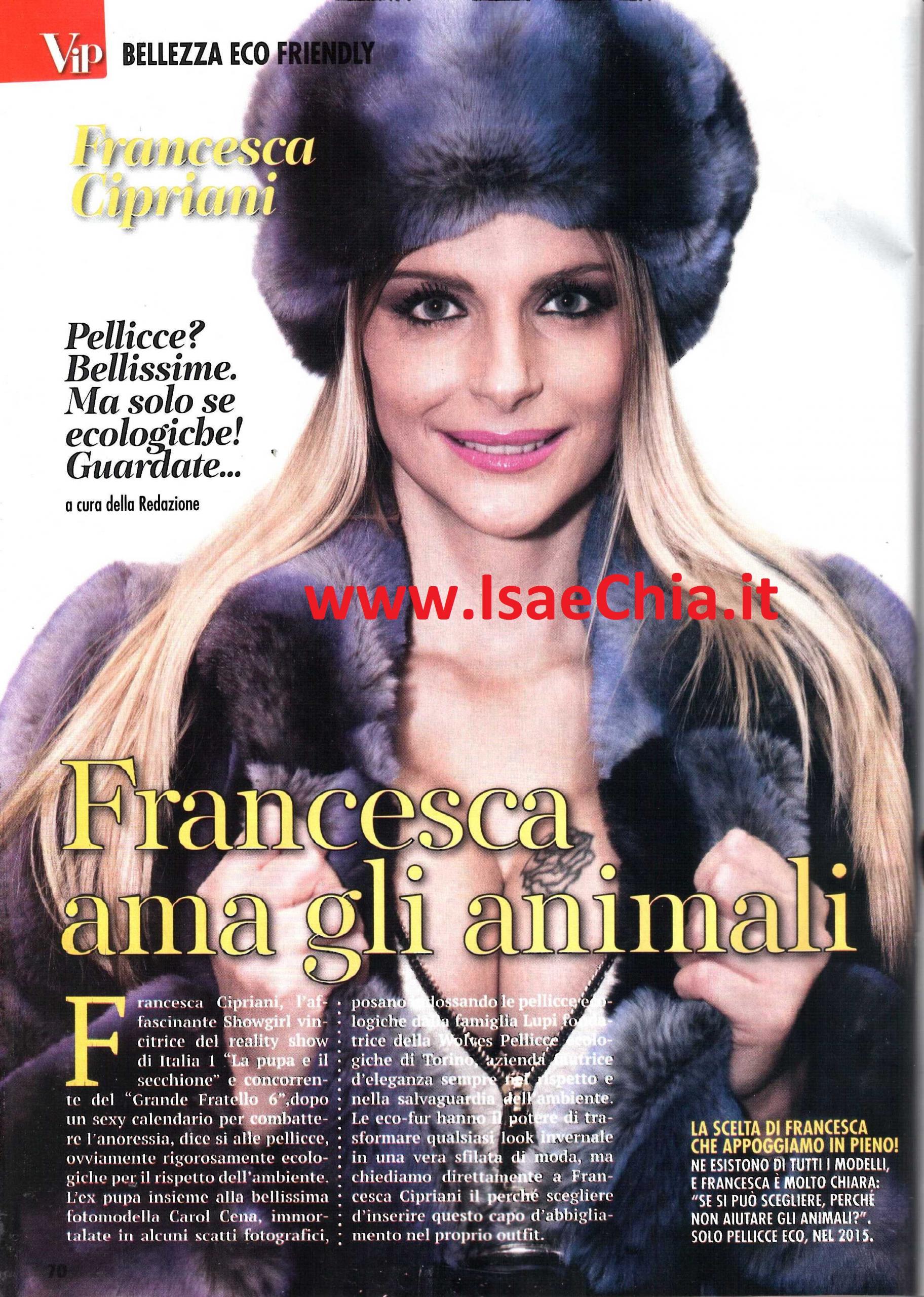 Dopo un sexy calendario in cui mostra le sue (ritoccate) forme generose in favore della lotta all’anoressia ed aver lanciato un messaggio contro la violenza sulle donne (della quale pare esser stata vittima), l’ex Pupa Francesca Cipriani si è dedicata alla causa della protezione per gli animali. Insieme alla fotomodella Carol Cena, infatti, l’ex gieffina ha indossato alcune pellicce, ma tutte rigorosamente ecologiche. “Perché scegliere la pelliccia ecologica? Esorto tutti a guardare un video che testimonia il maltrattamento degli animali per ricavarne le pellicce. Con prodotti sintetici si possono realizzare innumerevoli modelli, altrettanto belli ed eleganti. Io utilizzo solo pellicce ecologiche e le indosso in ogni occasione. E poi, se si può scegliere, perché non difendere gli animali? Non ho un modello preferito in particolare, scelgo in base all’occasione. L’eco-fur è un capo molto pratico e facilmente abbinabile a qualsiasi look, e lo consiglierei a qualsiasi donna, dalla più sportiva alla più classica. Io sono diventata una vera e propria fan della faux-fur e proprio per questo nel mio armadio ne posseggo svariati modelli!“
