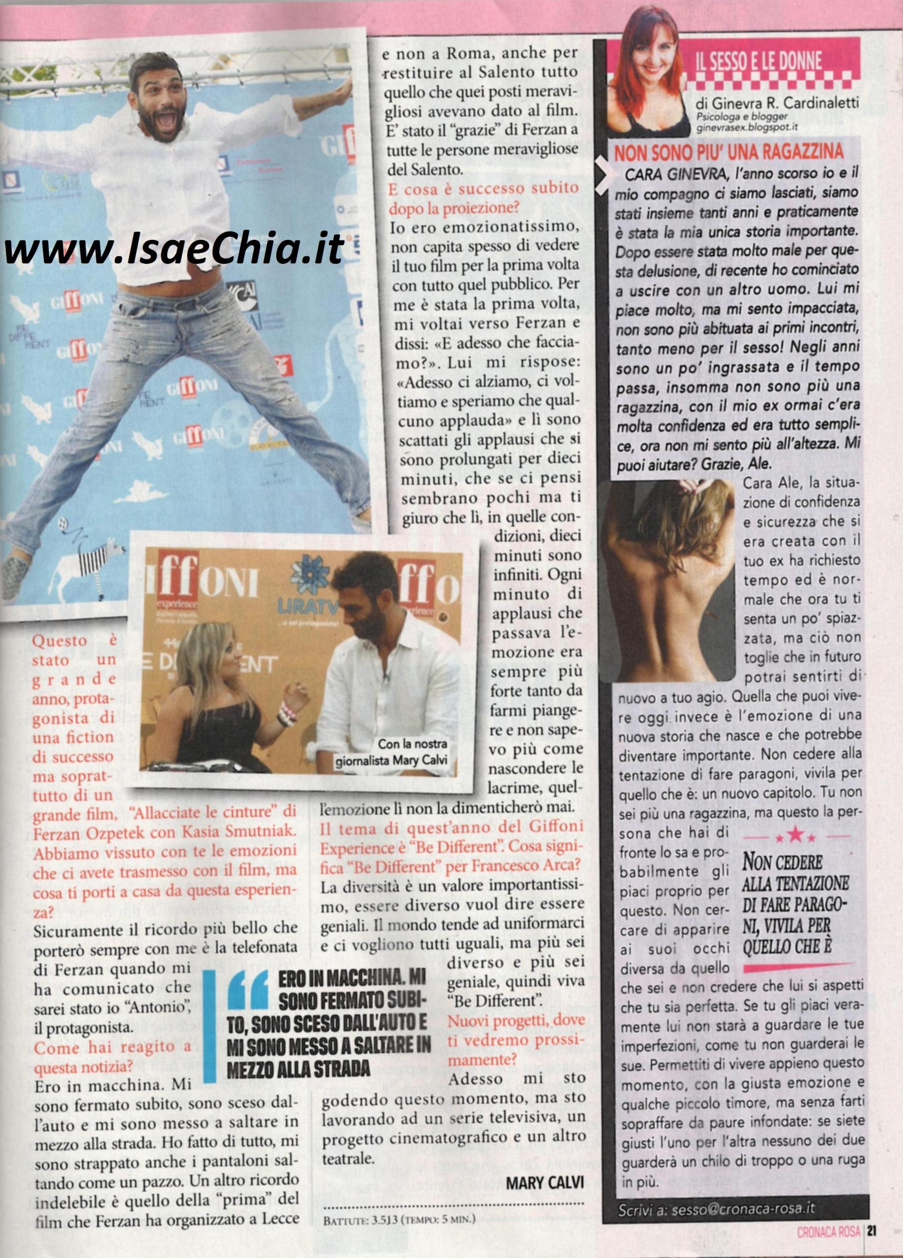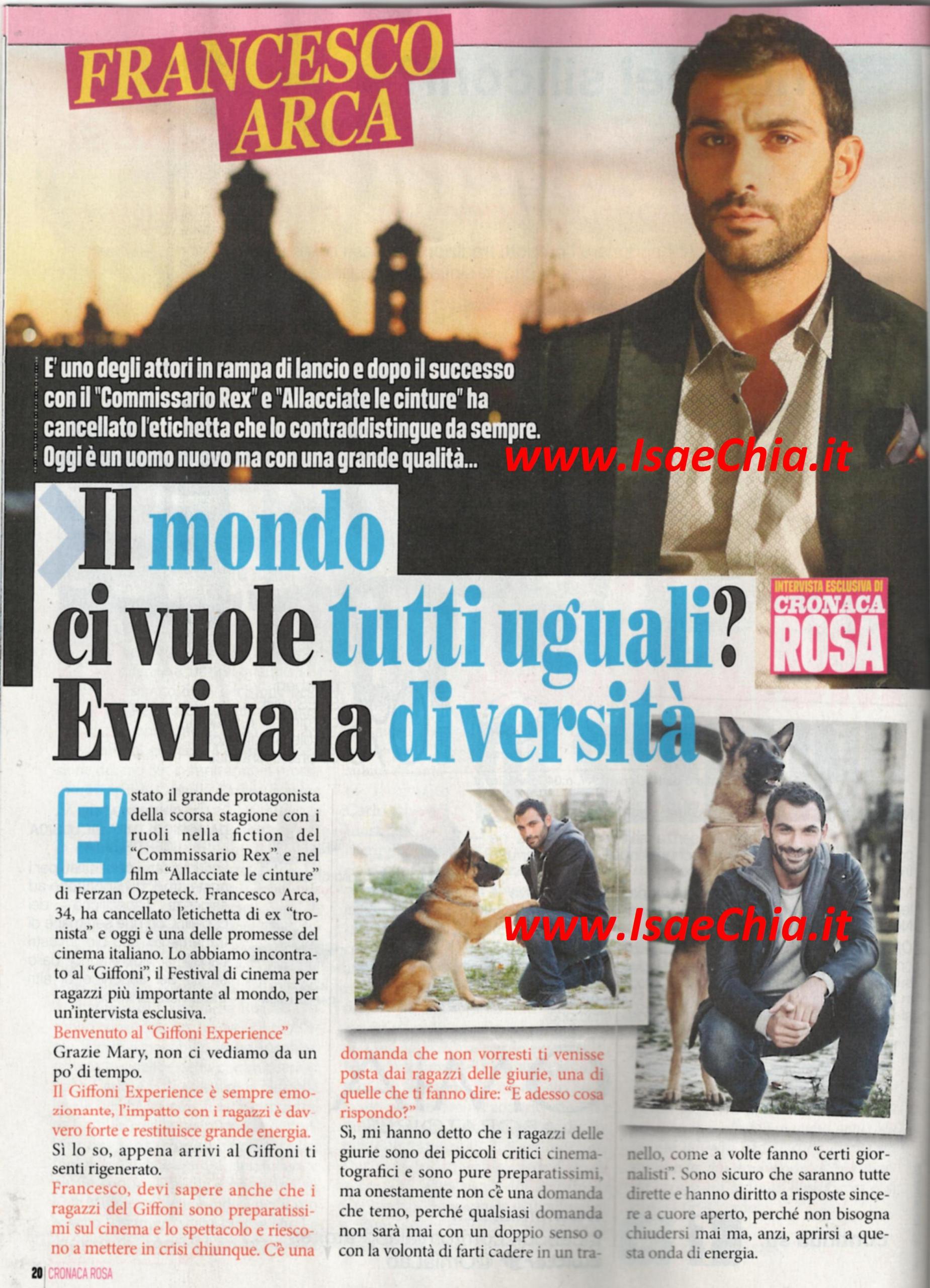 Dopo aver recitato ne Il commissario Rex e nel film di Ferzan Ozpetek Allacciate le cinture, Francesco Arca ha definitivamente cancellato l’etichetta di ex tronista. In occasione del Festival del cinema per ragazzi di Giffoni, ha dichiarato: “Appena arrivi qui ti senti rigenerato. Ma mi hanno detto che i ragazzi delle giurie sono dei piccoli critici cinematografici e che sono preparatissimi. Non c’è una domanda che temo, perché qualsiasi domanda non sarà mai fatta con la volontà di farti cadere in un tranello come quelle di certi giornalisti. Sono sicuro che faranno tutte domande dirette, alle quali risponderò a cuore aperto. Il tema del festival di quest’anno è Be different. La diversità è un valore importantissimo, vuol dire essere geniali. Il mondo tende ad uniformarci, ma più sei diverso, più sei geniale”. Ripercorrendo questo periodo di grandi successi, il bel toscano confessa: “Sicuramente il momento più bello è stato quando ho ricevuto la chiamata di Ferzan che mi ha detto che sarei stato io Antonio. Ero in macchina, mi sono fermato e mi sono messo a saltare per strada. Mi sono anche strappato i pantaloni saltando come un pazzo! Un altro ricordo è quello della prima, che Ferzan ha organizzato a Lecce, e non a Roma, per restituire al Salento quei posti meravigliosi in cui abbiamo girato. Io ero emozionatissimo: non capita spesso di vedere il tuo film con tutte quelle persone! Mi voltai verso di lui e chiesi: “E adesso che facciamo?” e lui: “Ci alziamo, ci voltiamo e speriamo che qualcuno applauda”. E lì sono scattati gli applausi, che sono durati dieci minuti. Sembrano pochi, ma in quelle condizioni, dieci minuti sono infiniti. Ogni minuto che passava, l’emozione era sempre più forte, al punto da farmi piangere: non sapevo come nascondere le lacrime”. Infine, rivela progetti futuri: “Mi sto godendo questo momento, ma lavoro ad una serie televisiva, a un progetto cinematografico e ad uno teatrale!”