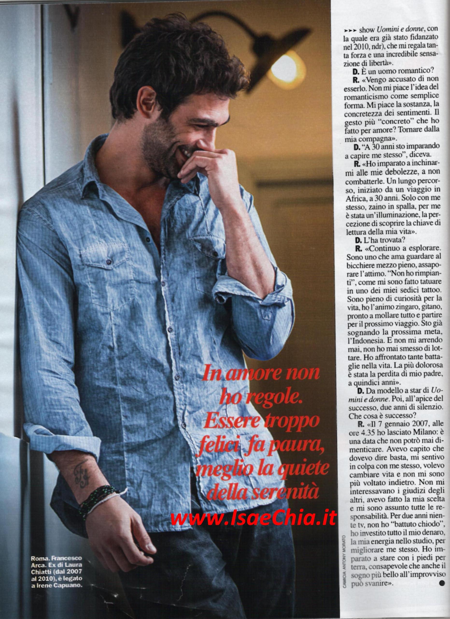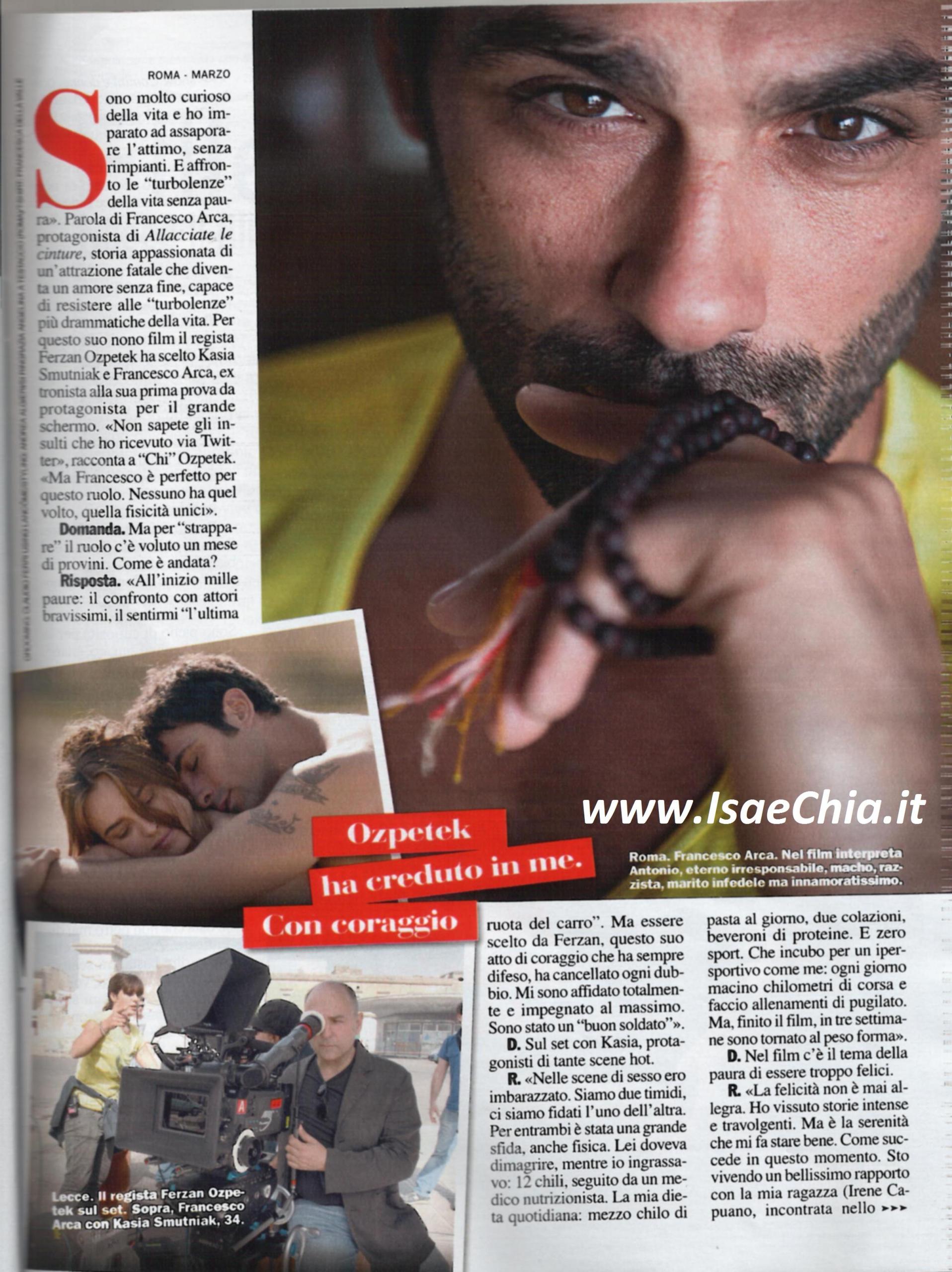 “Non sapete gli insulti che ho ricevuto via Twitter. Ma Francesco è perfetto per questo ruolo. Nessuno ha quel volto, quella fisicità unici”. Così il regista Ferzan Ozpetek ha difeso la sua scelta per il protagonista di Allacciate le cinture, che è ricaduta sull’ex tronista Francesco Arca. Il bell’attore toscano aggiunge: “Mi ci è voluto un mese di provini. All’inizio avevo mille paure: il confronto con attori bravissimi, il sentirmi l’ultima ruota del carro. Ma l’atto di coraggio di Ferzan, in mia difesa, mi ha cancellato ogni dubbio; mi sono affidato totalmente e ho dato il massimo. Nelle scene di sesso con Kasia Smutniak ero imbarazzato. Siamo due timidi, ci siamo fidati l’uno dell’altra. Per entrambi è stata una grande sfida, anche fisica. Lei doveva dimagrire, mentre io ho messo su 12 chili, mangiando mezzo chilo di pasta al giorno, due colazioni, beveroni di proteine e niente sport. Un incubo per un ipersportivo come me, che macina chilometri di corsa e fa pugilato”. Parlando del tema del film, la paura di essere felici, spiega: “Ho vissuto storie intense e travolgenti, ma è la serenità che mi fa stare bene, come succede in questo momento”. Infatti, per la prima volta, Arca si esprime sulla storia con l’ex corteggiatrice Irene Capuano: “Sto vivendo un bellissimo rapporto con la mia ragazza, che mi regala tanta forza e un’incredibile sensazione di libertà. Vengo accusato di non essere romantico, ma mi piace la sostanza, la concretezza dei sentimenti. Il gesto più “concreto” che ho fatto per amore? Tornare dalla mia compagna. Un viaggio fatto da solo, a 30 anni, in Africa, mi ha aiutato a ritrovare me stesso. Continuo ad esplorare, “Non ho rimpianti”, come dice uno dei miei 16 tatuaggi. Sono pieno di curiosità per la vita, ho l’animo zingaro, gitano, pronto a mollare tutto e partire per il prossimo viaggio. Il 7 gennaio 2007, all’apice del successo come modello dopo Uomini e donne, ho lasciato Milano. E’ una data che non potrò dimenticare: decisi di dire basta, mi sentivo in colpa con me stesso, volevo cambiare vita e non mi sono più voltato indietro. Non mi interessavano i giudizi altrui, avevo fatto la mia scelta e me ne sono assunto le responsabilità. Per due anni niente tv, non ho battuto chiodo e ho investito tutto il mio denaro e la mia energia nello studio, per migliorarmi”.